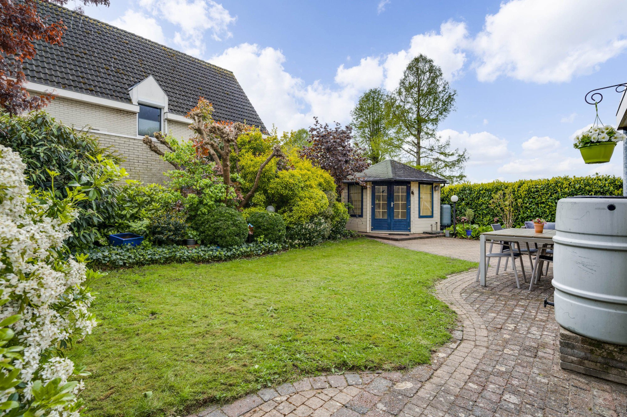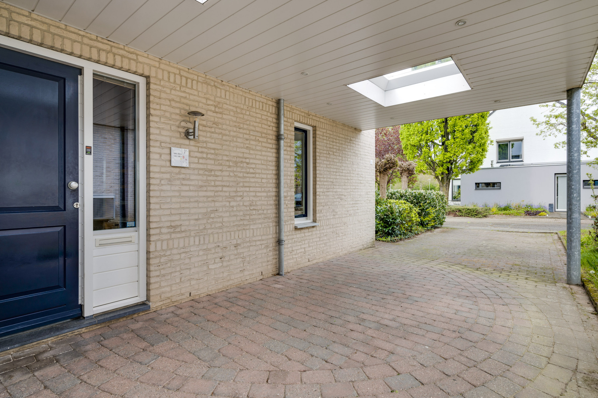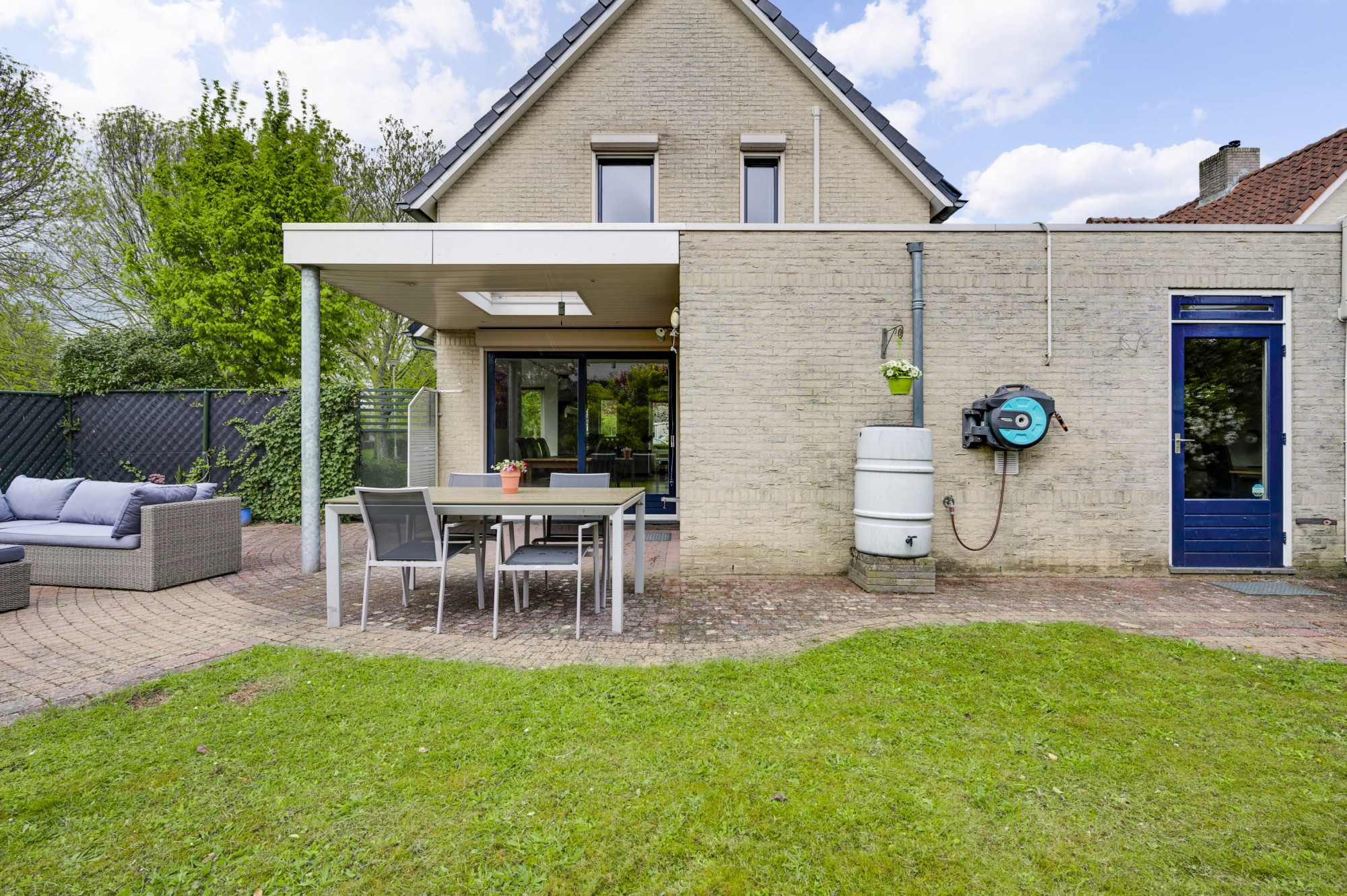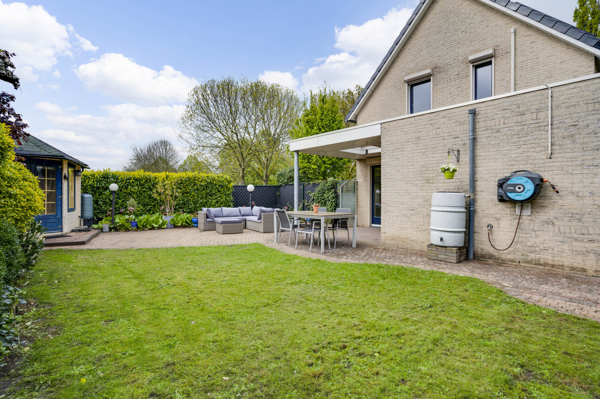 Aan de voorzijde van het perceel is een diepe oprit gelegen met een carport, die plaats biedt aan twee voertuigen. Middels een vrije achterom is de achtertuin toegankelijk. De achtertuin is aangelegd met een royaal beklinkerd terras met overkapping, houten tuinhuisje, gazon, diverse borders met beplanting en een natuurlijke erfafscheiding.