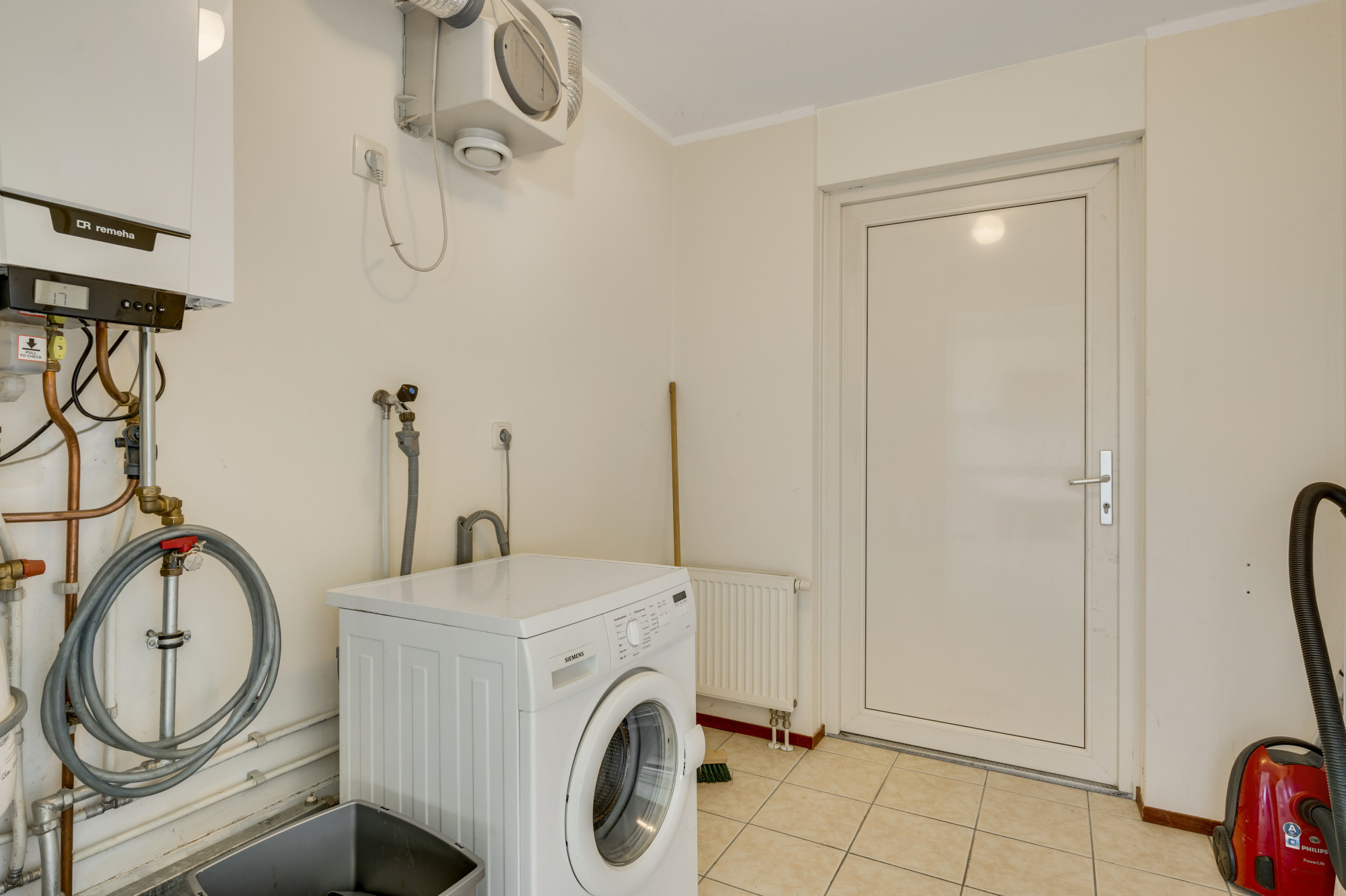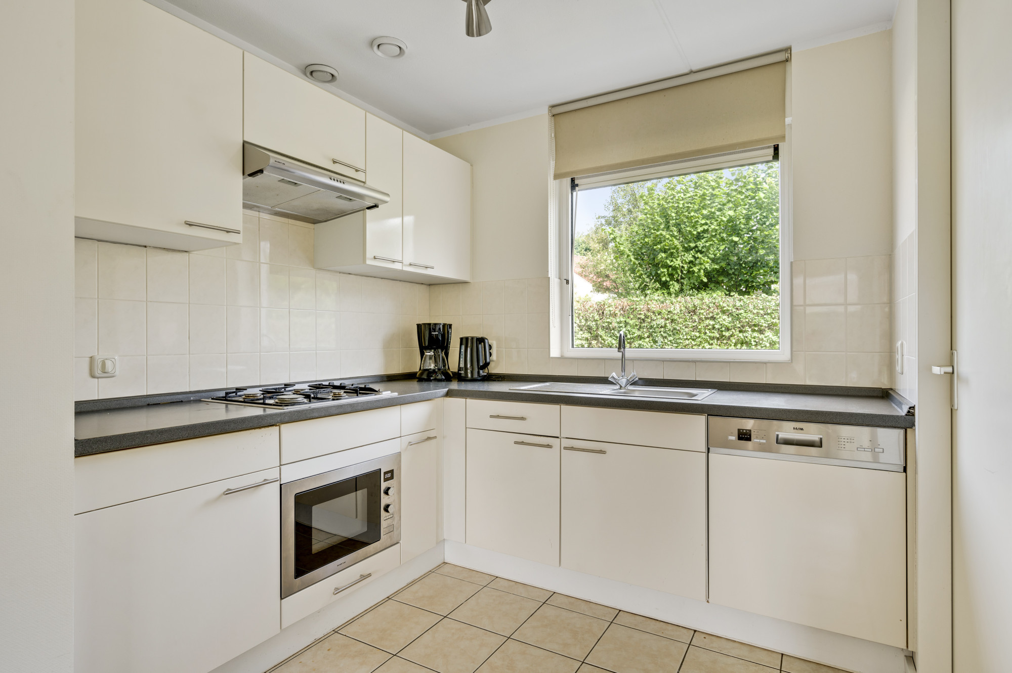 Hal/entree met meterkast, toiletruimte met zwevend toilet en fonteintje en toegang tot de woonkamer. De royale en lichte woonkamer met moderne tegelvloer beschikt over dubbele openslaande deuren richting de tuin. De woonkamer staat in open verbinding met de keuken welke voorzien is van een combinatie in hoekopstelling met de navolgende inbouwapparatuur; 4-pits gaskookplaat, afzuigkap, combi-oven, koelkast, close in boiler en een vaatwasser. Via de keuken is de praktische bijkeuken/berging toegankelijk waar zich tevens de witgoedaansluitingen en de opstelling van de cv-combiketel (Nefit HR, ca. 2019, eigendom) bevinden. Bovendien biedt deze ruimte middels een loopdeur toegang tot de royale achtertuin. Vanuit de centrale hal is de eerste (van 3) gelijkvloerse slaapkamer met badkamer en suite toegankelijk. De geheel betegelde 1e badkamer is voorzien van een ligbad en een wastafel.