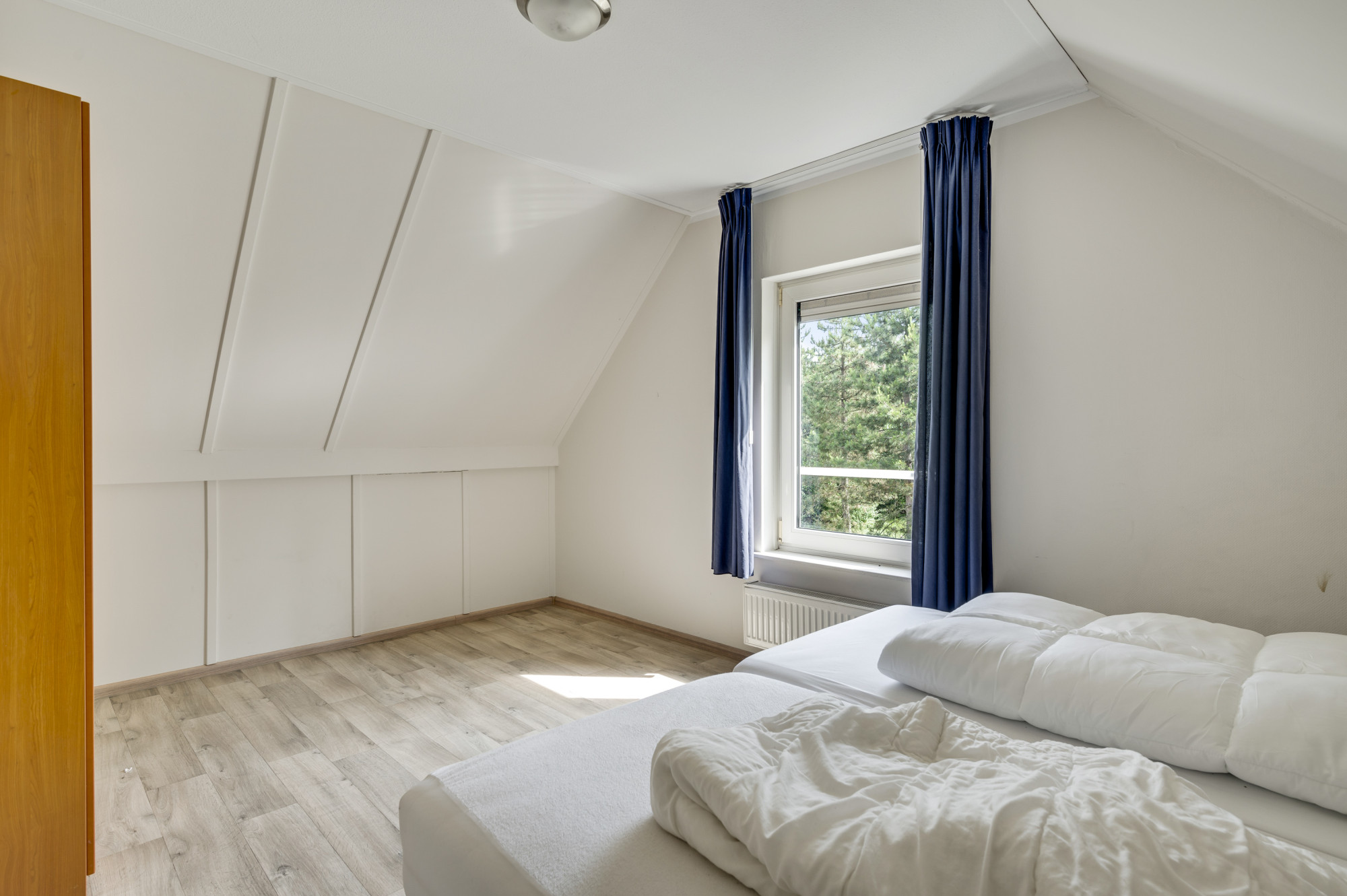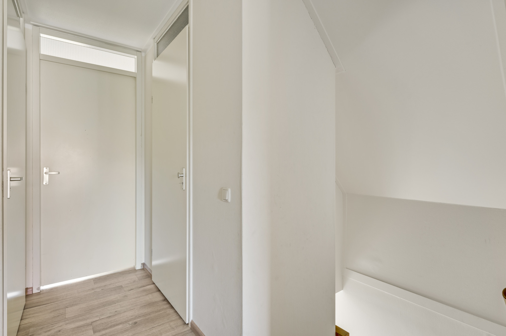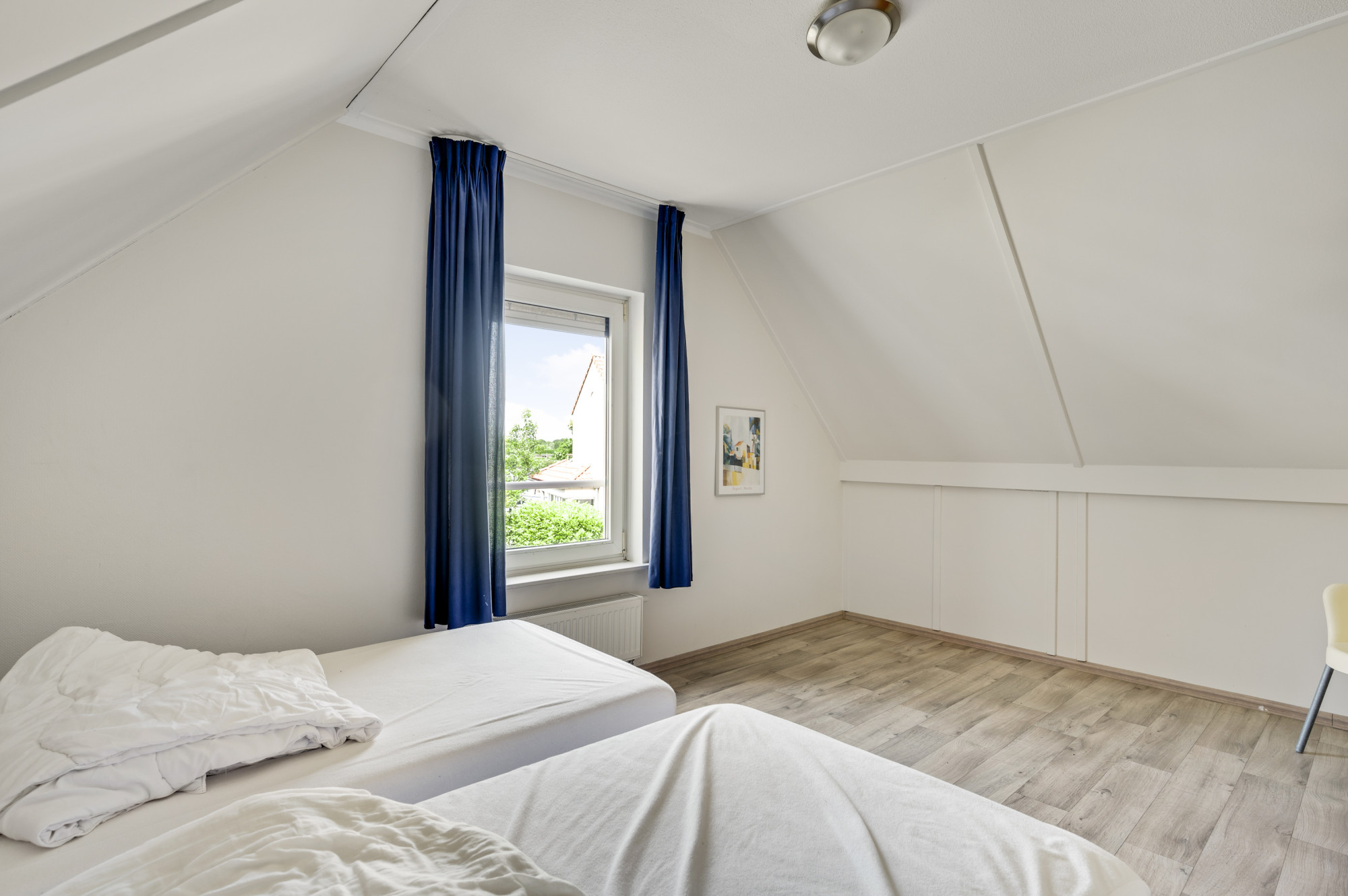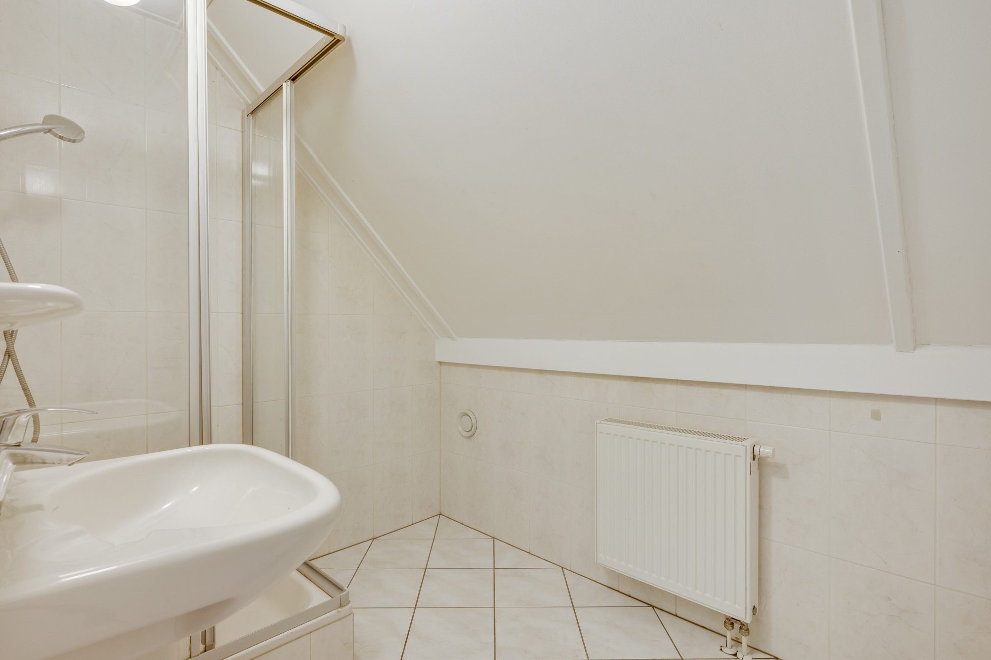 Vanuit de overloop zijn slaapkamer 2 en 3, de tweede badkamer en een praktische bergruimte toegankelijk. De slaapkamers zijn voorzien van een fraaie pvc vloer. De geheel betegelde badkamer is uitgerust met een douchecabine, zwevend toilet en een wastafel.