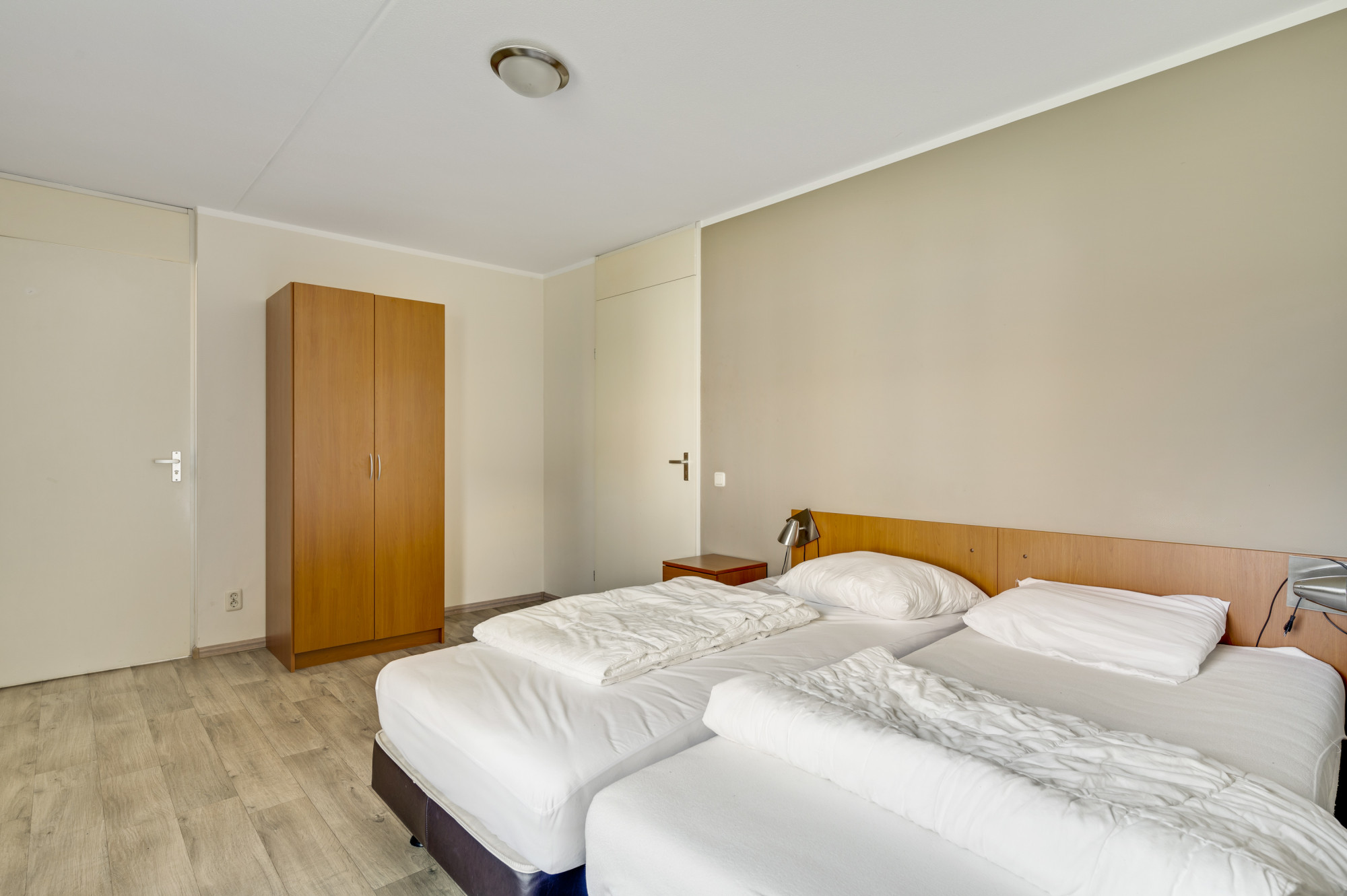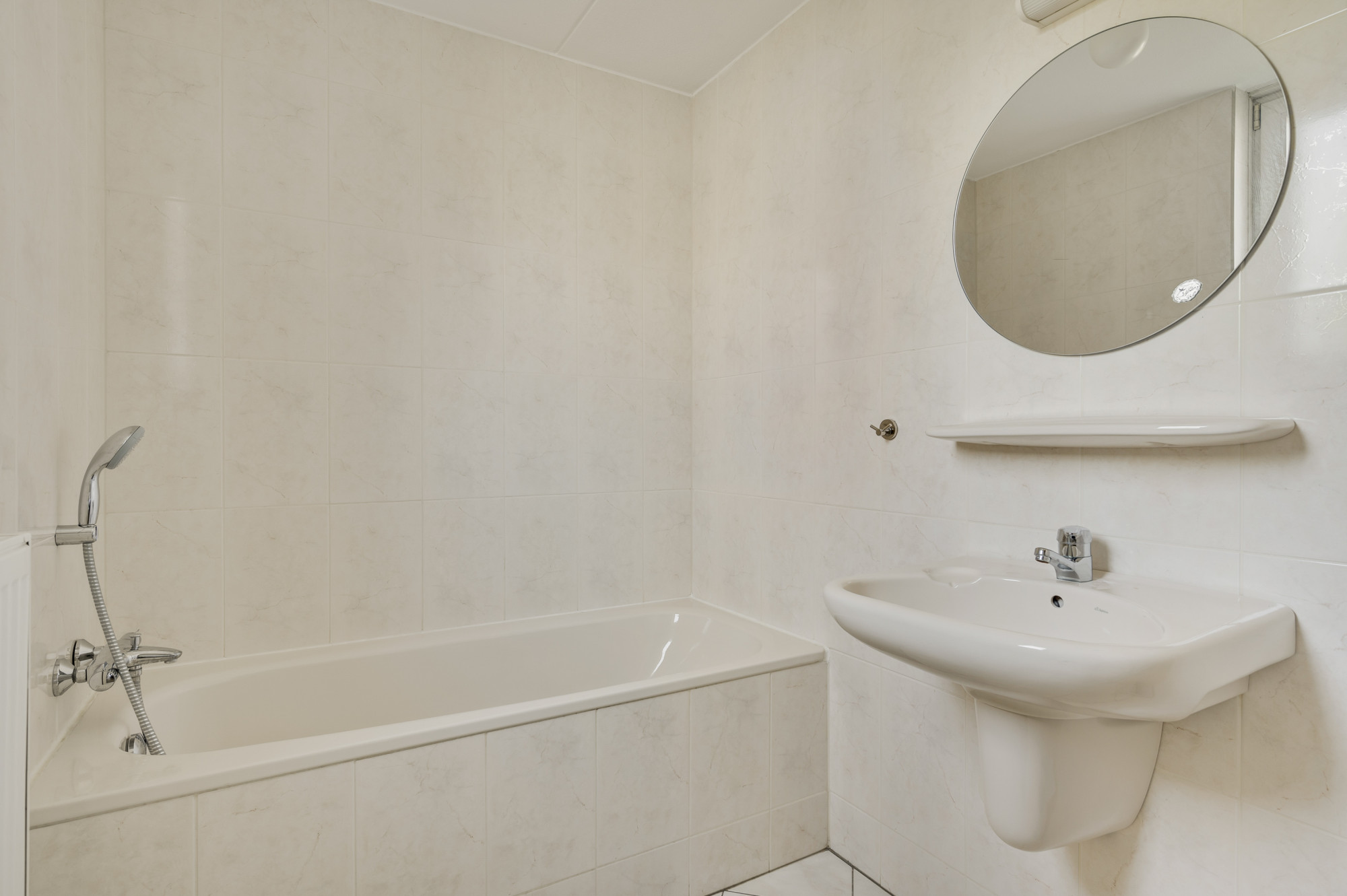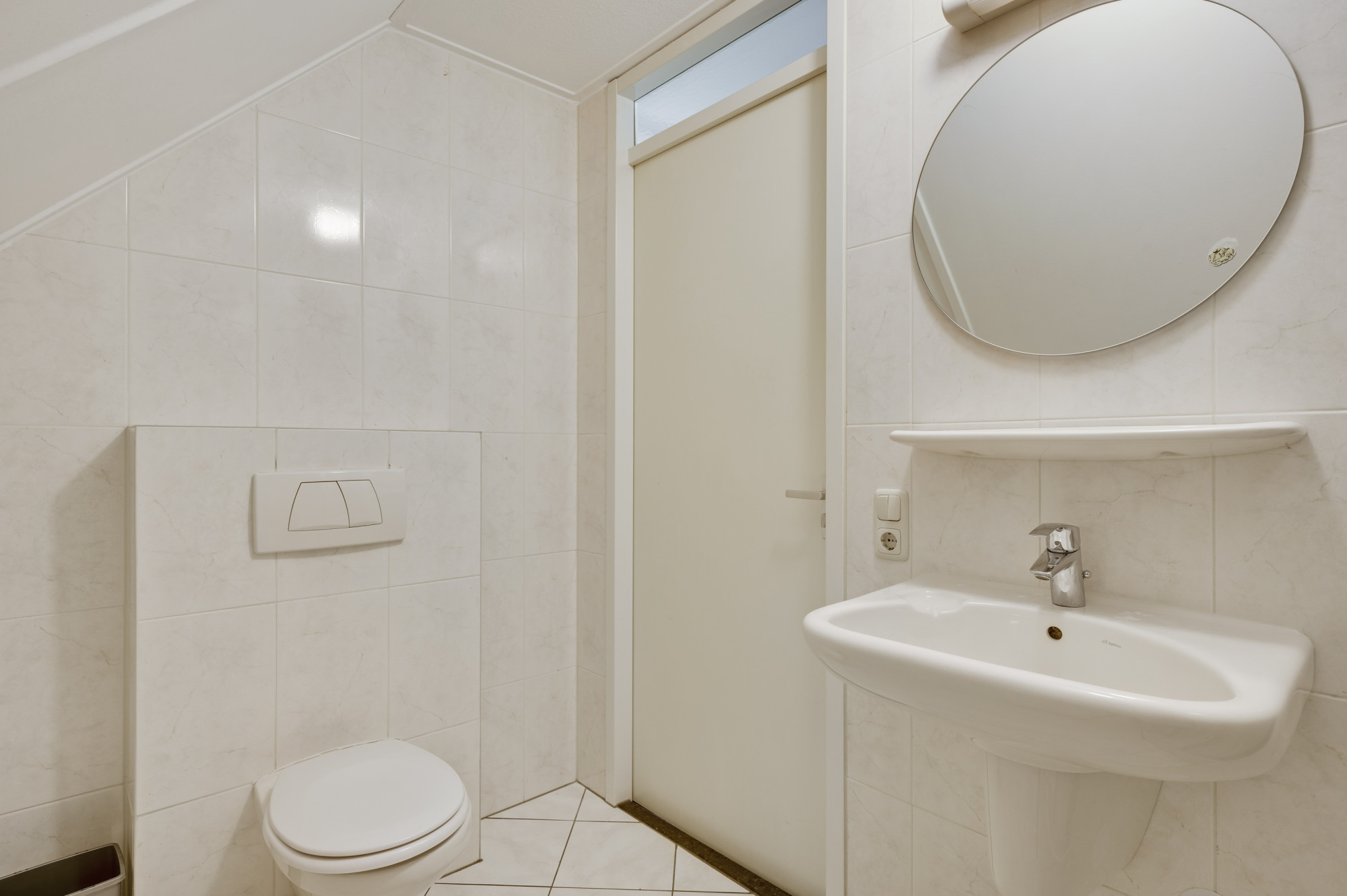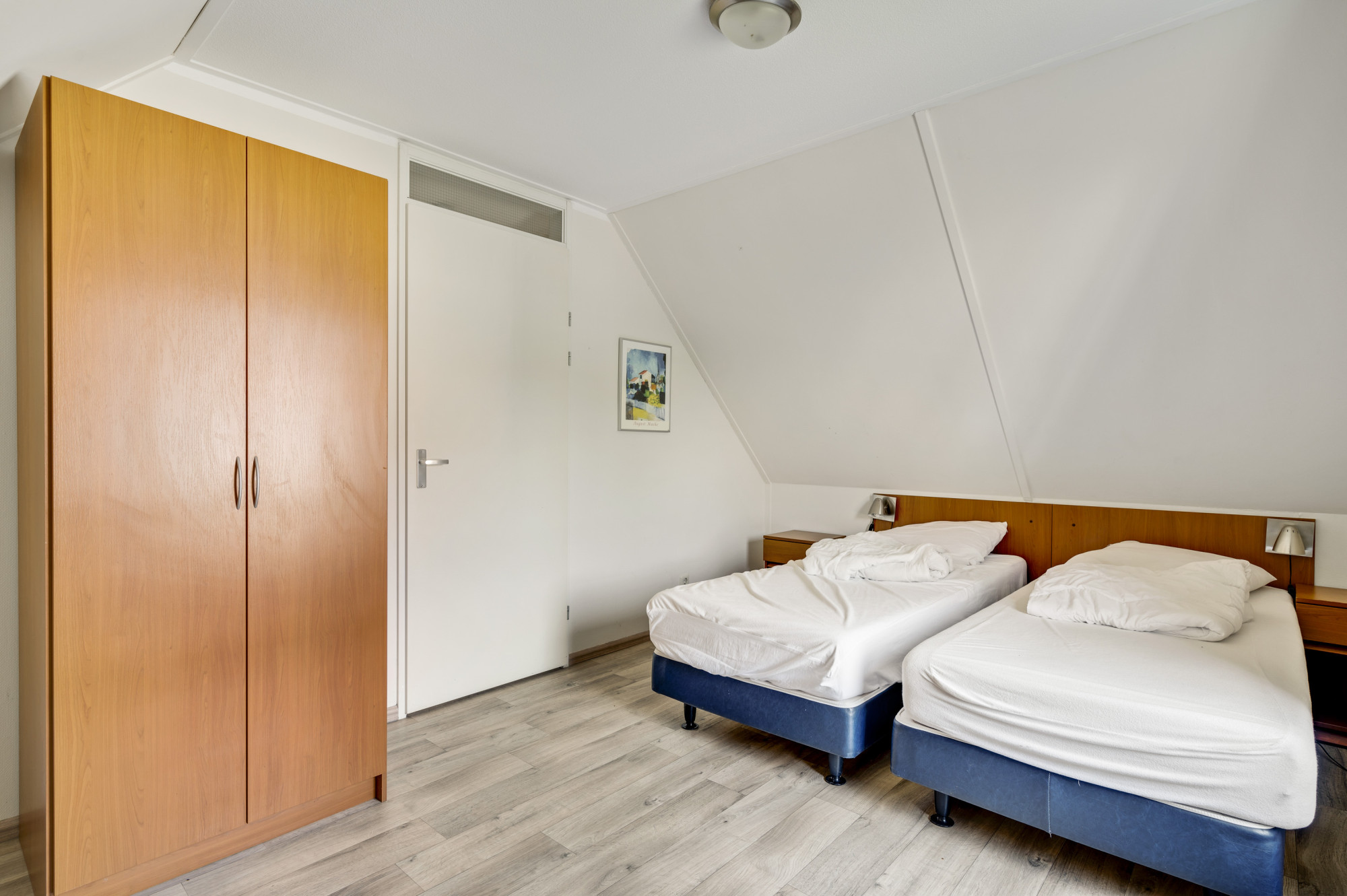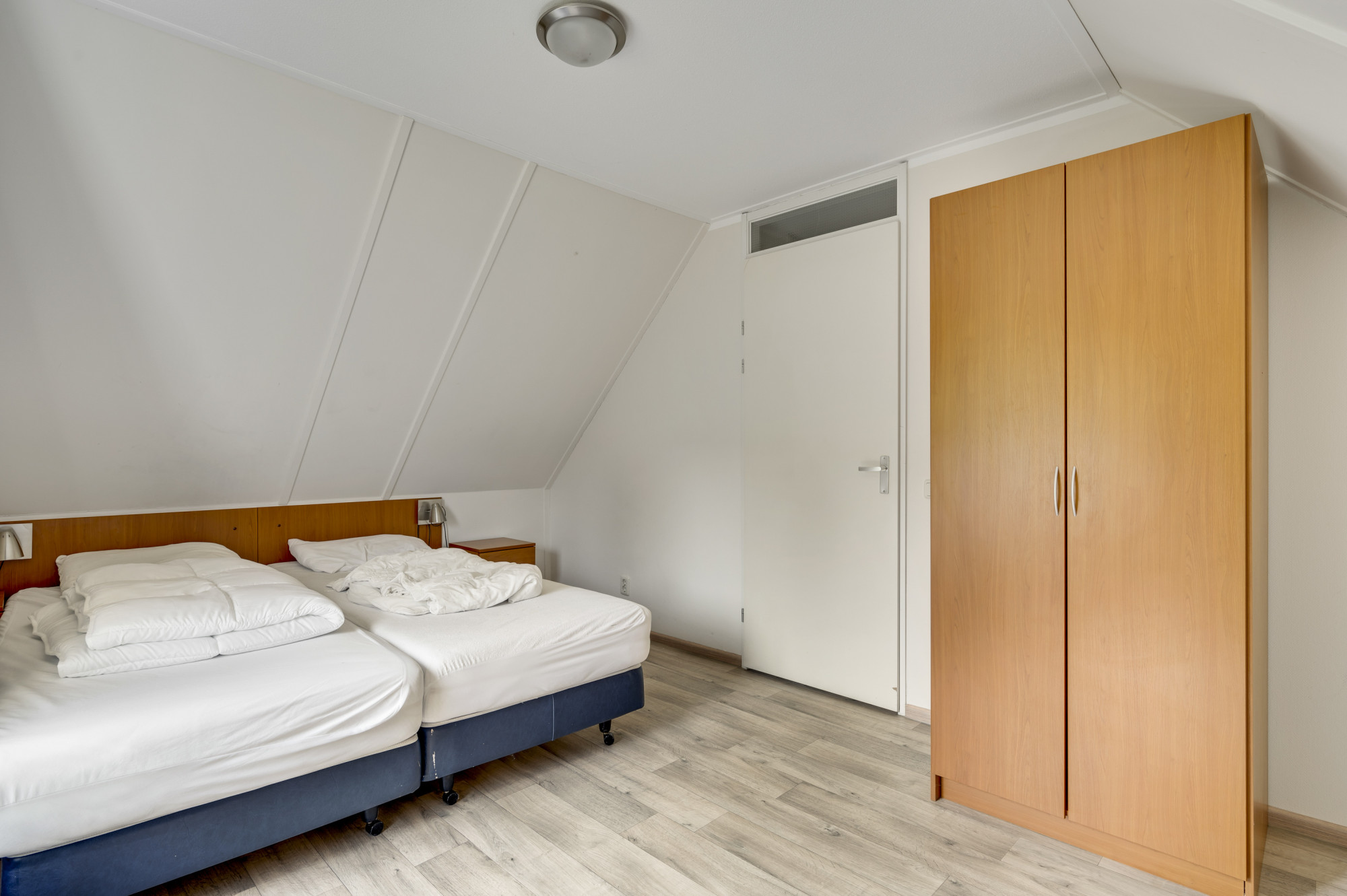 Vanuit de overloop zijn slaapkamer 2 en 3, de tweede badkamer en een praktische bergruimte toegankelijk. De slaapkamers zijn voorzien van een fraaie pvc vloer. De geheel betegelde badkamer is uitgerust met een douchecabine, zwevend toilet en een wastafel.