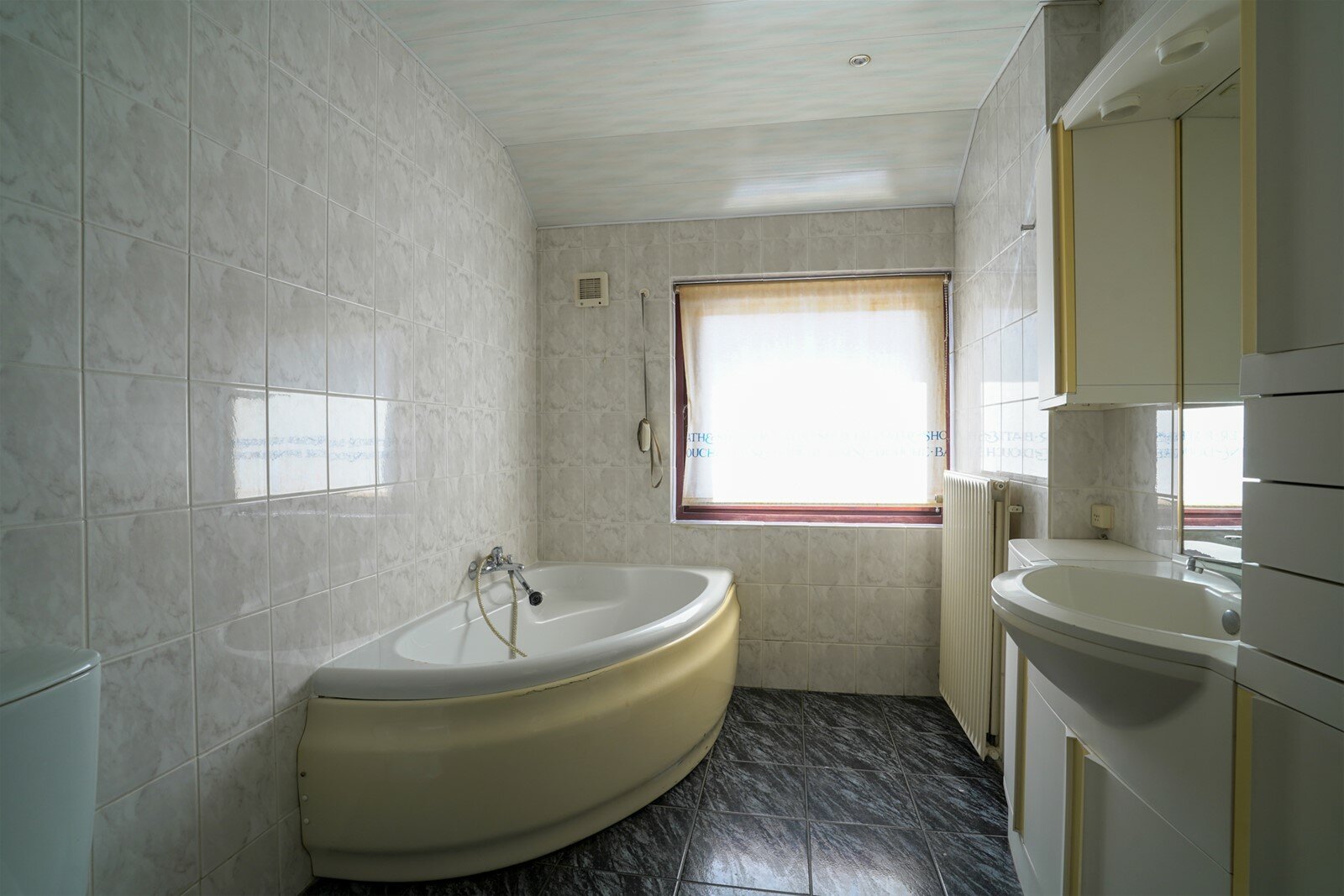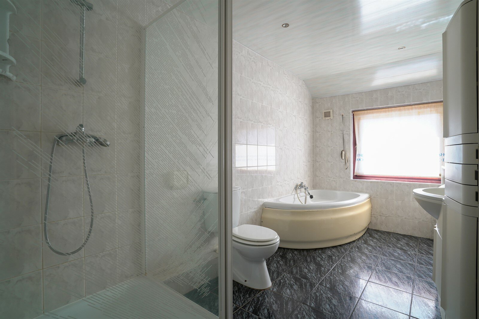 Badkamer(8m2) met hoekbad, douche, wastafel en toilet.
