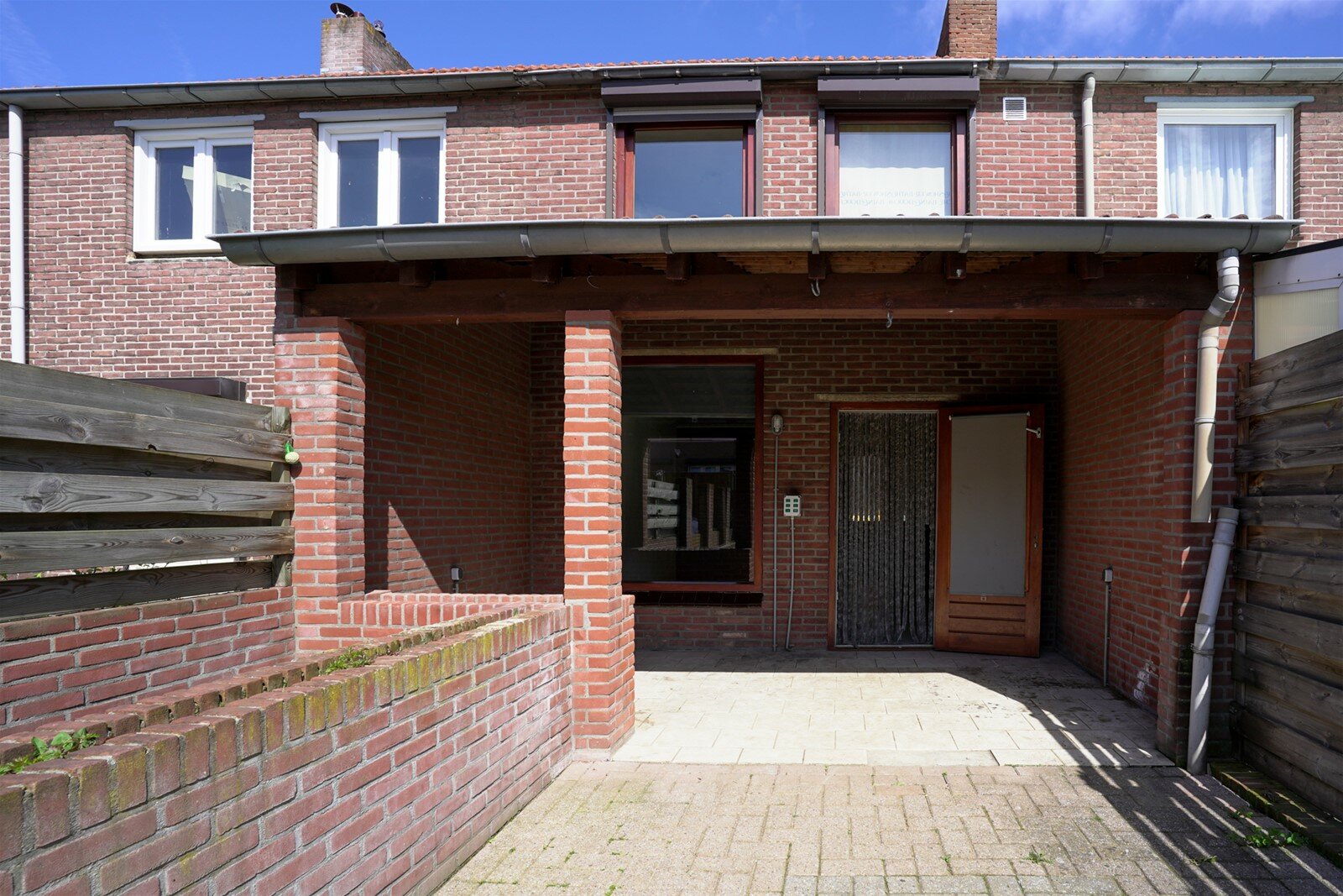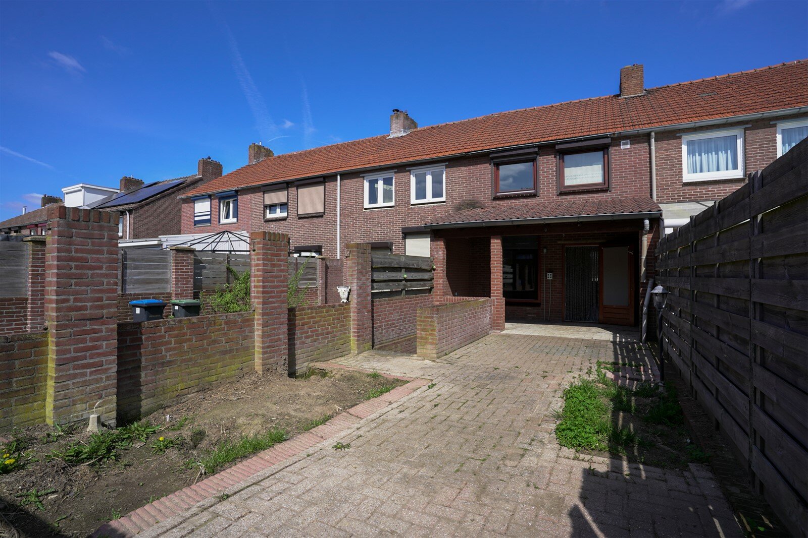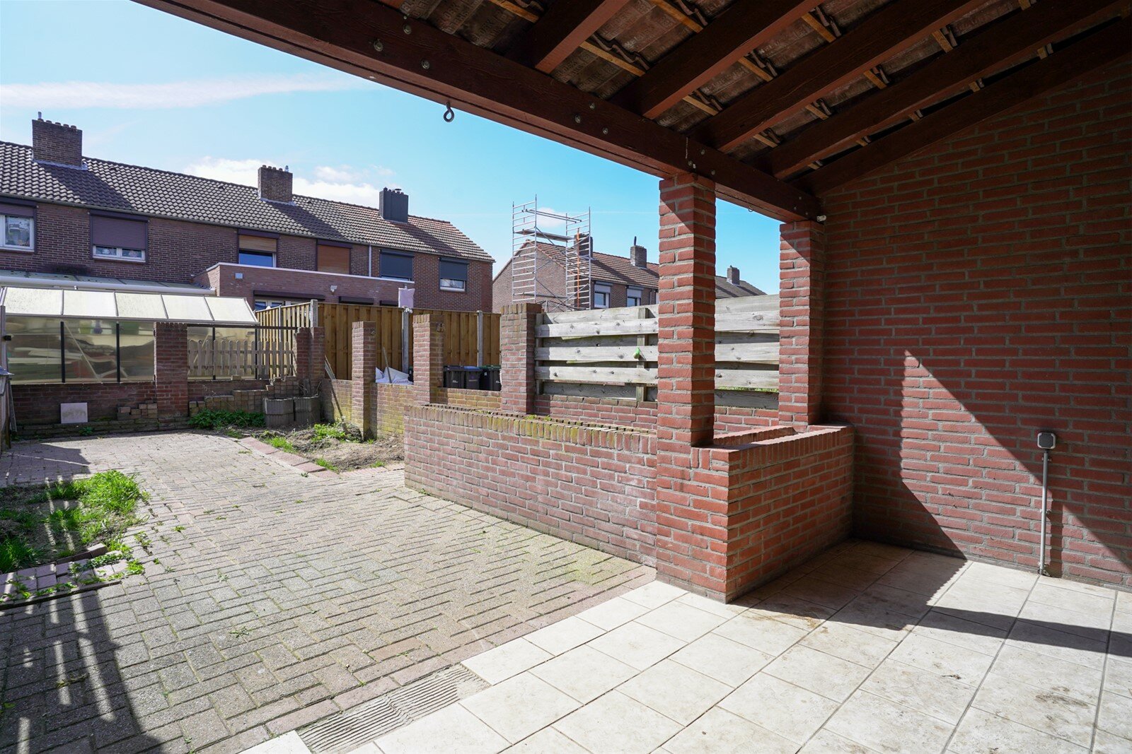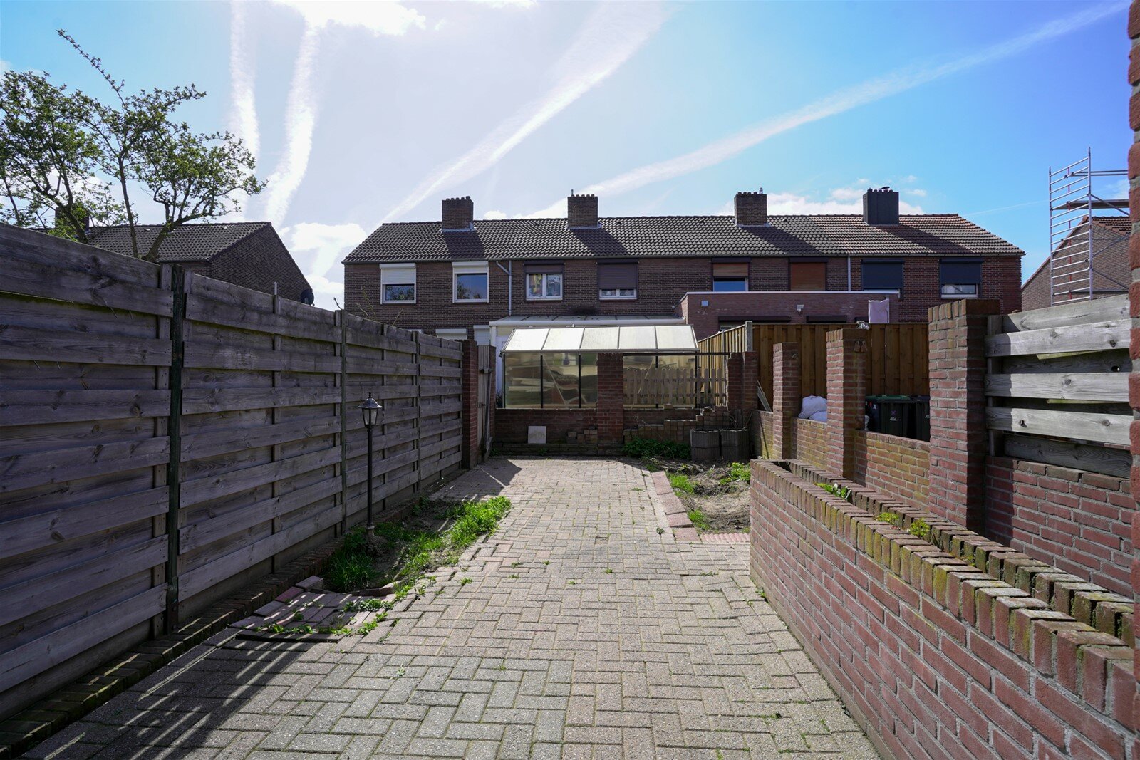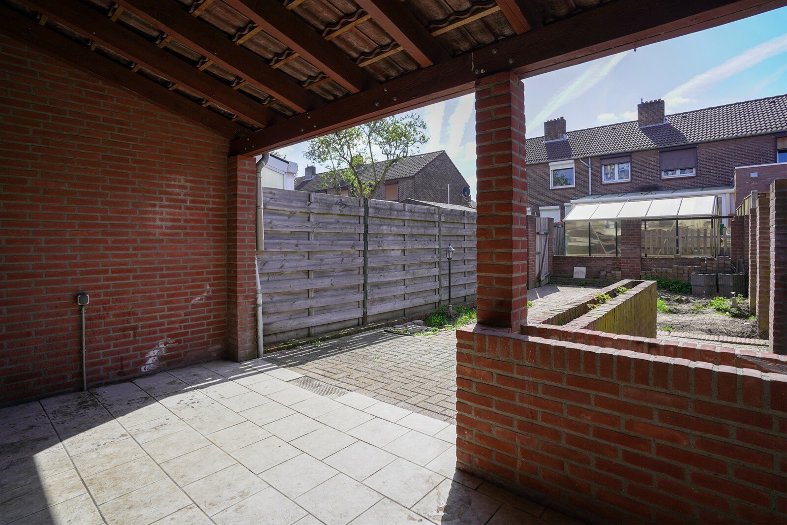 Achtertuin met overkapping en achterom.