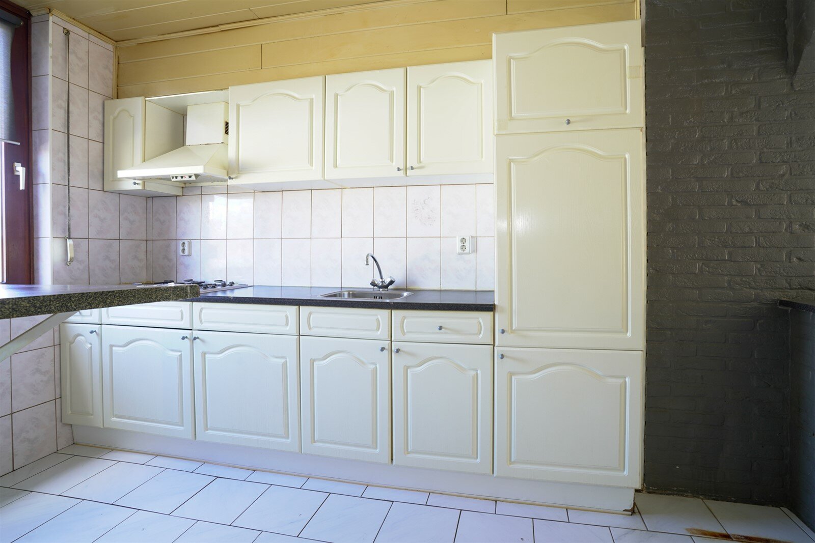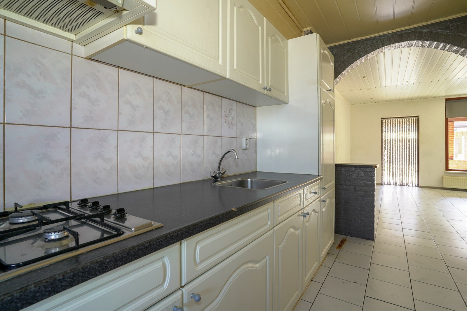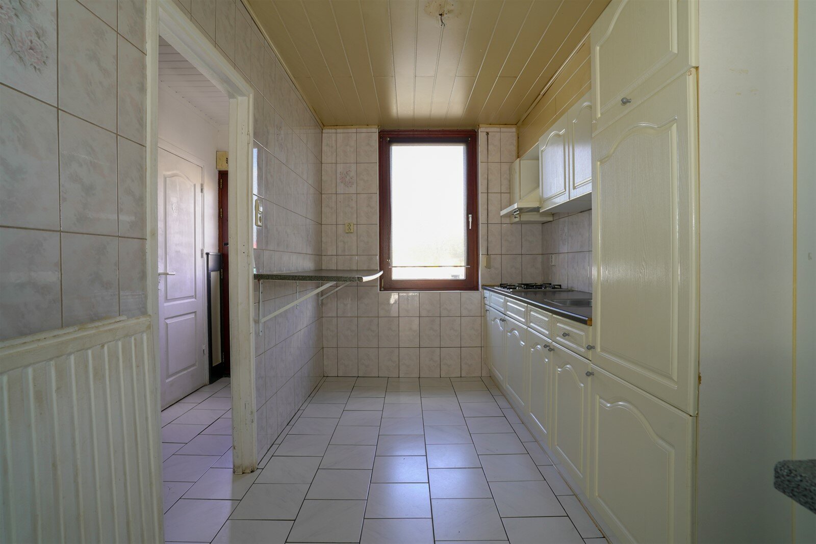 Keuken(7m2) voorzien van een eenvoudige inbouwkeuken met gasfornuis, koelkast. De vloer is voorzien van een tegelvloer.