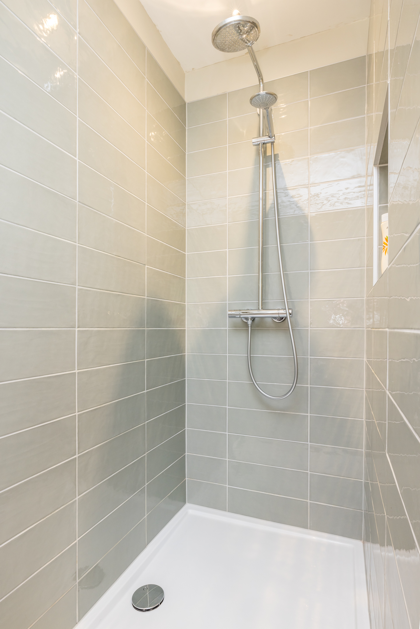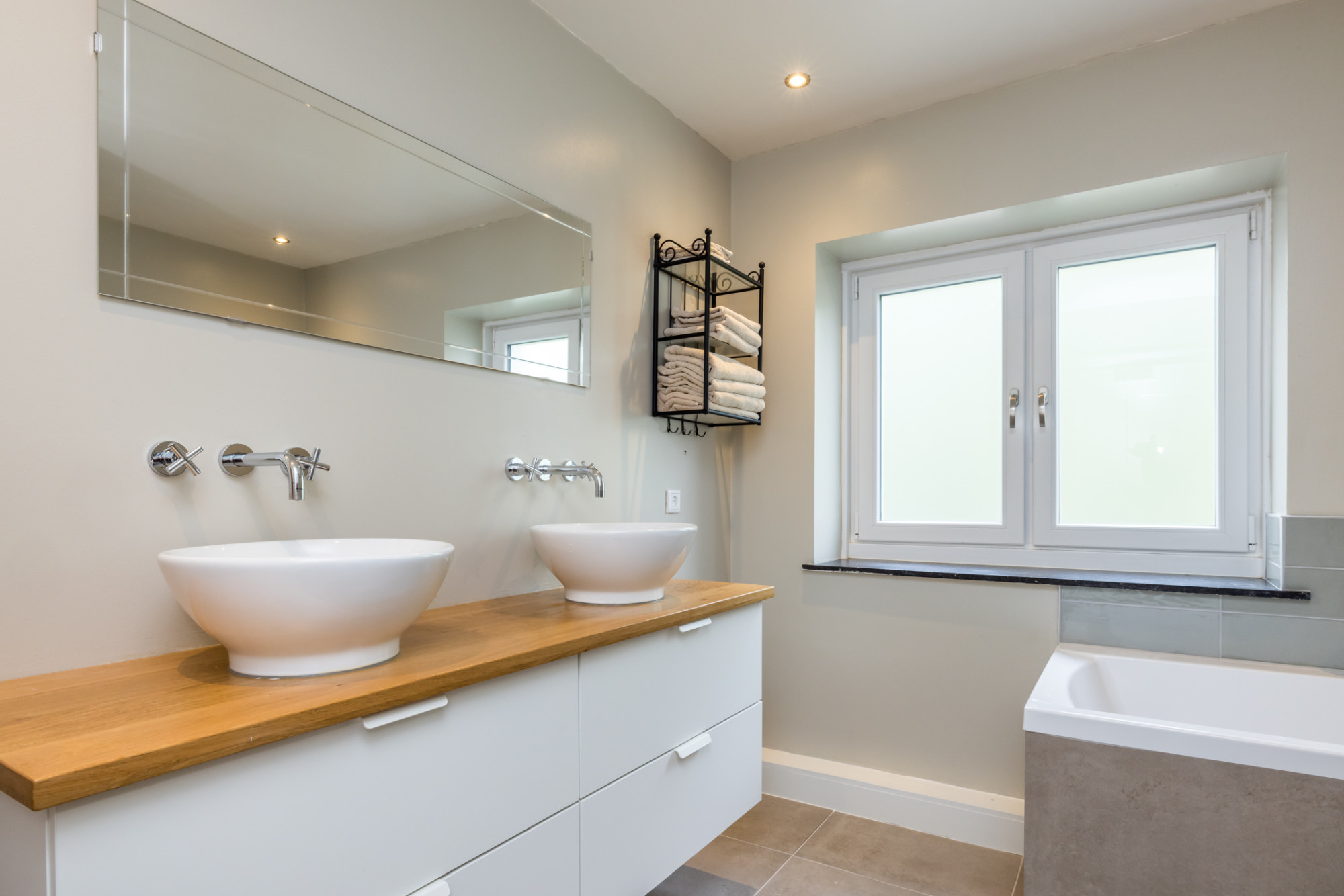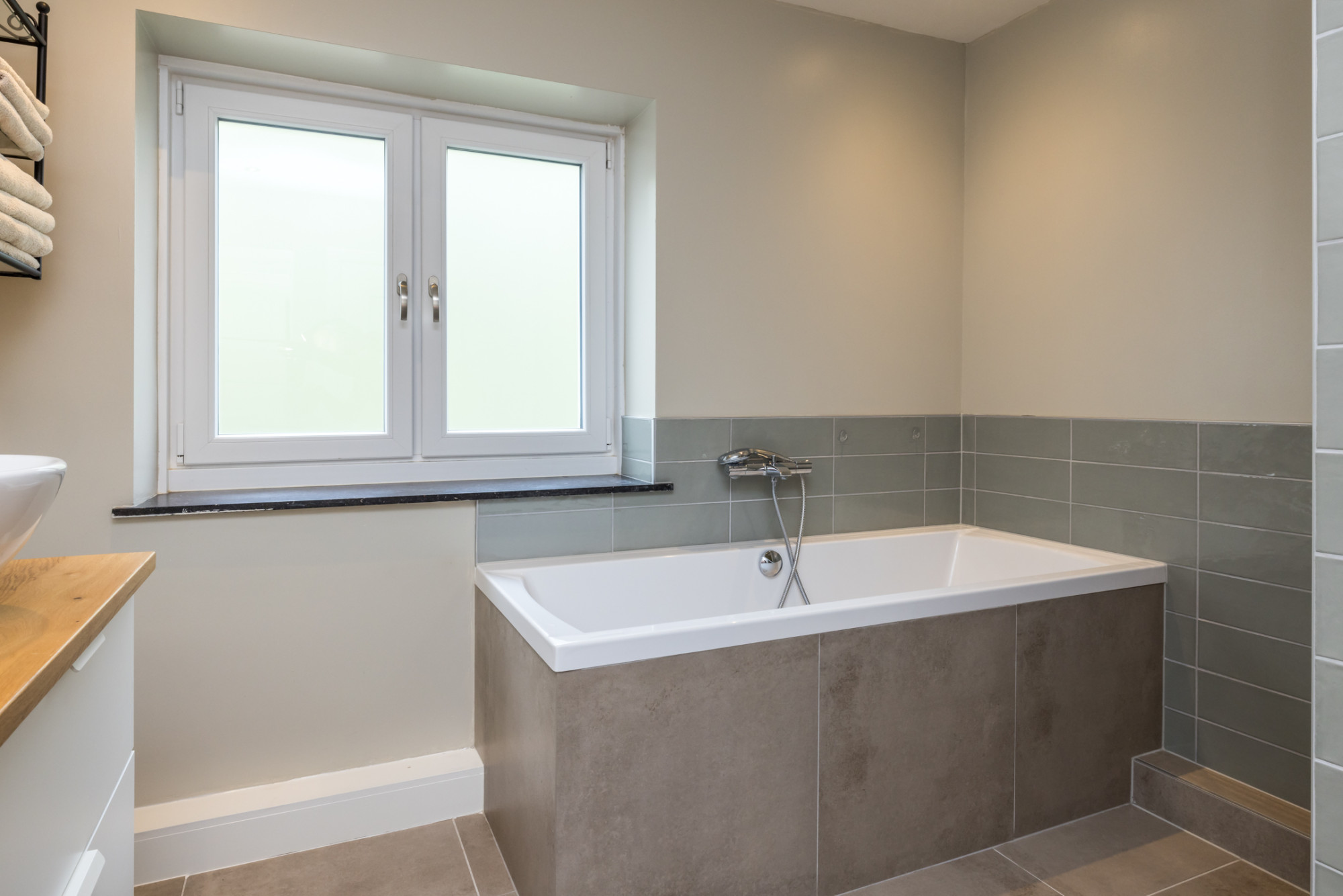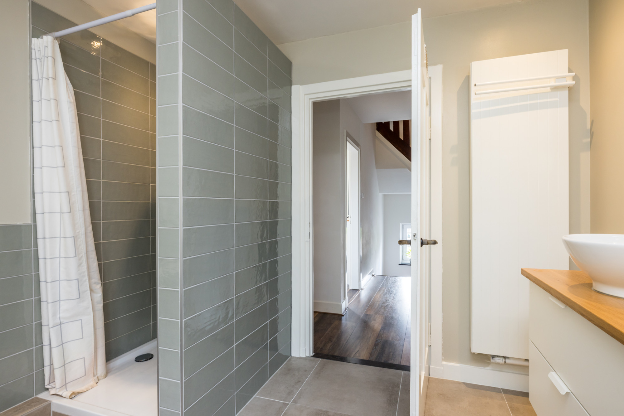 Moderne badkamer (2,96 m x 2,89 m) met ruime inloopdouche, ligbad, dubbele vaste wastafel met meubel.