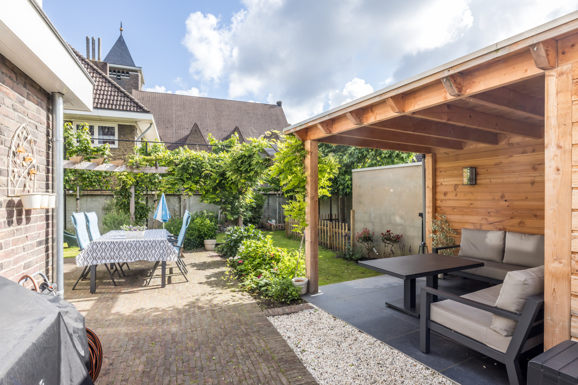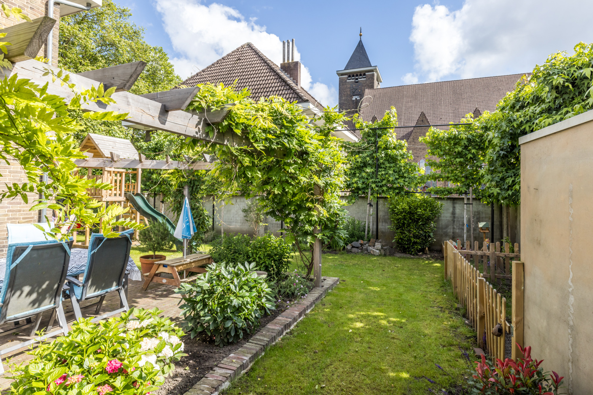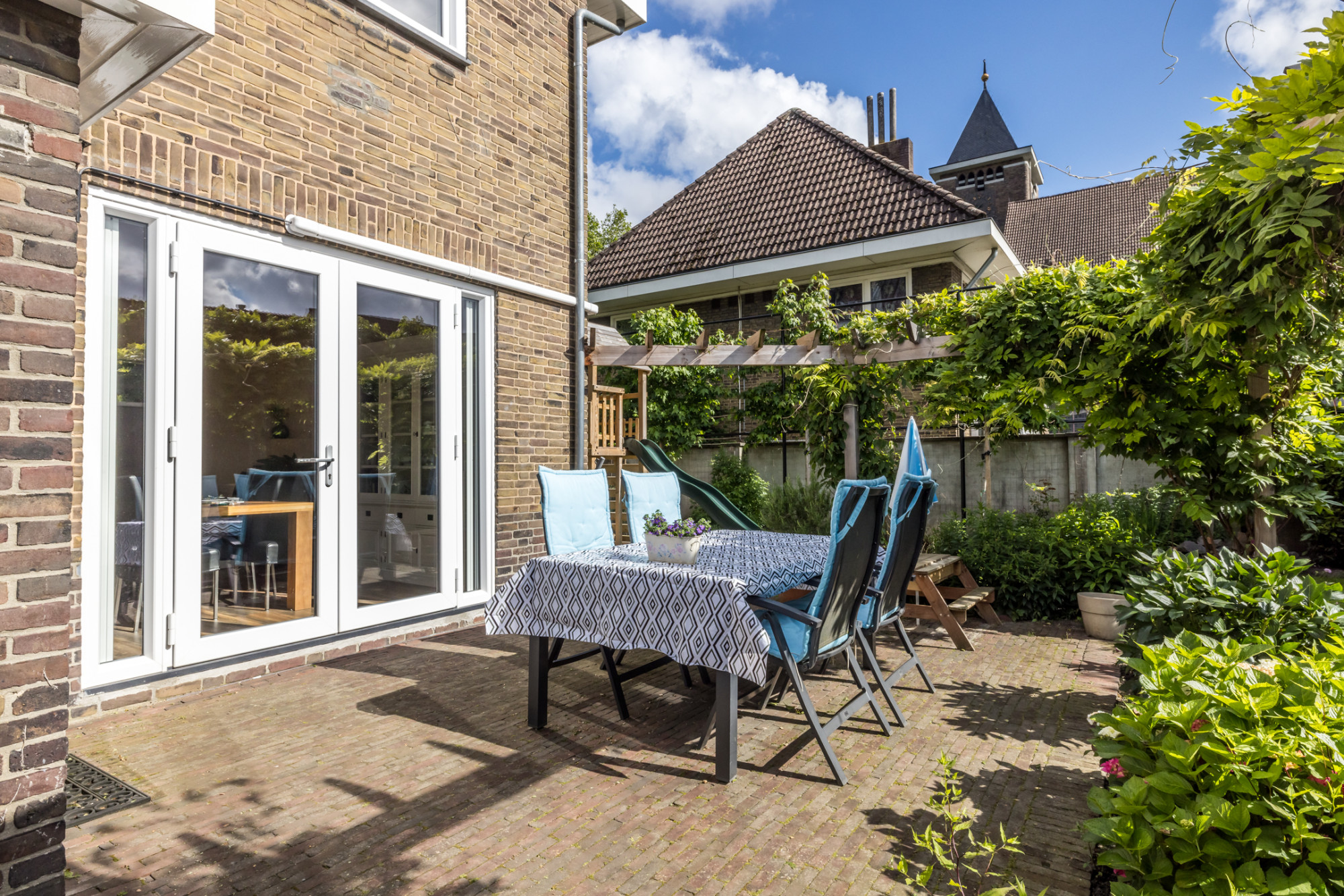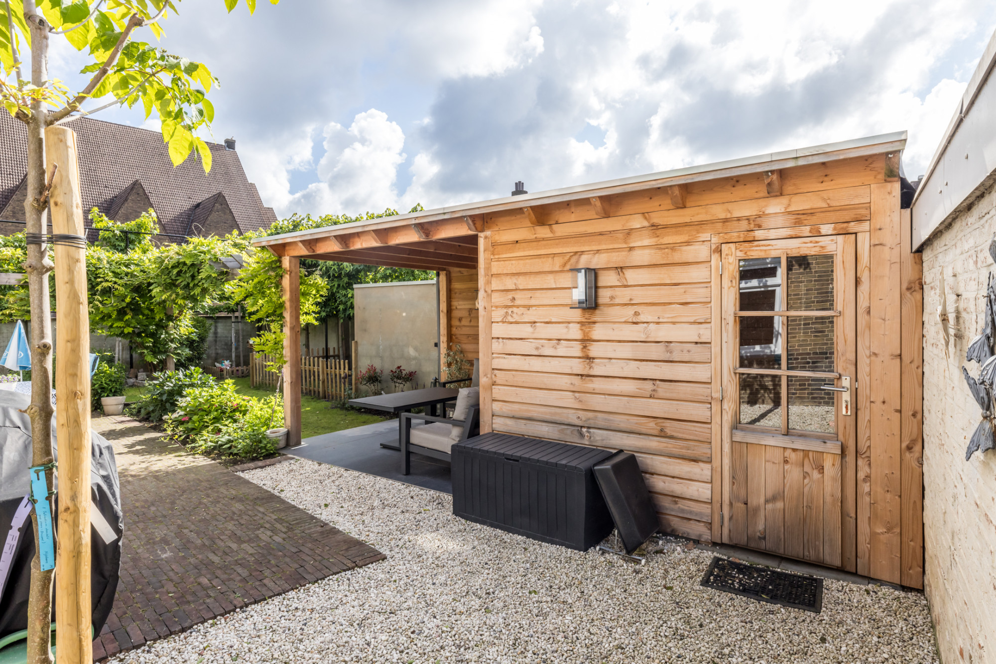 Sfeervol aangelegde tuin met riant terras en buitenberging (2,85 m x 2,77 m) v.v. overdekt zitje. De tuin is vanuit beide kanten middels poort achterom bereikbaar.