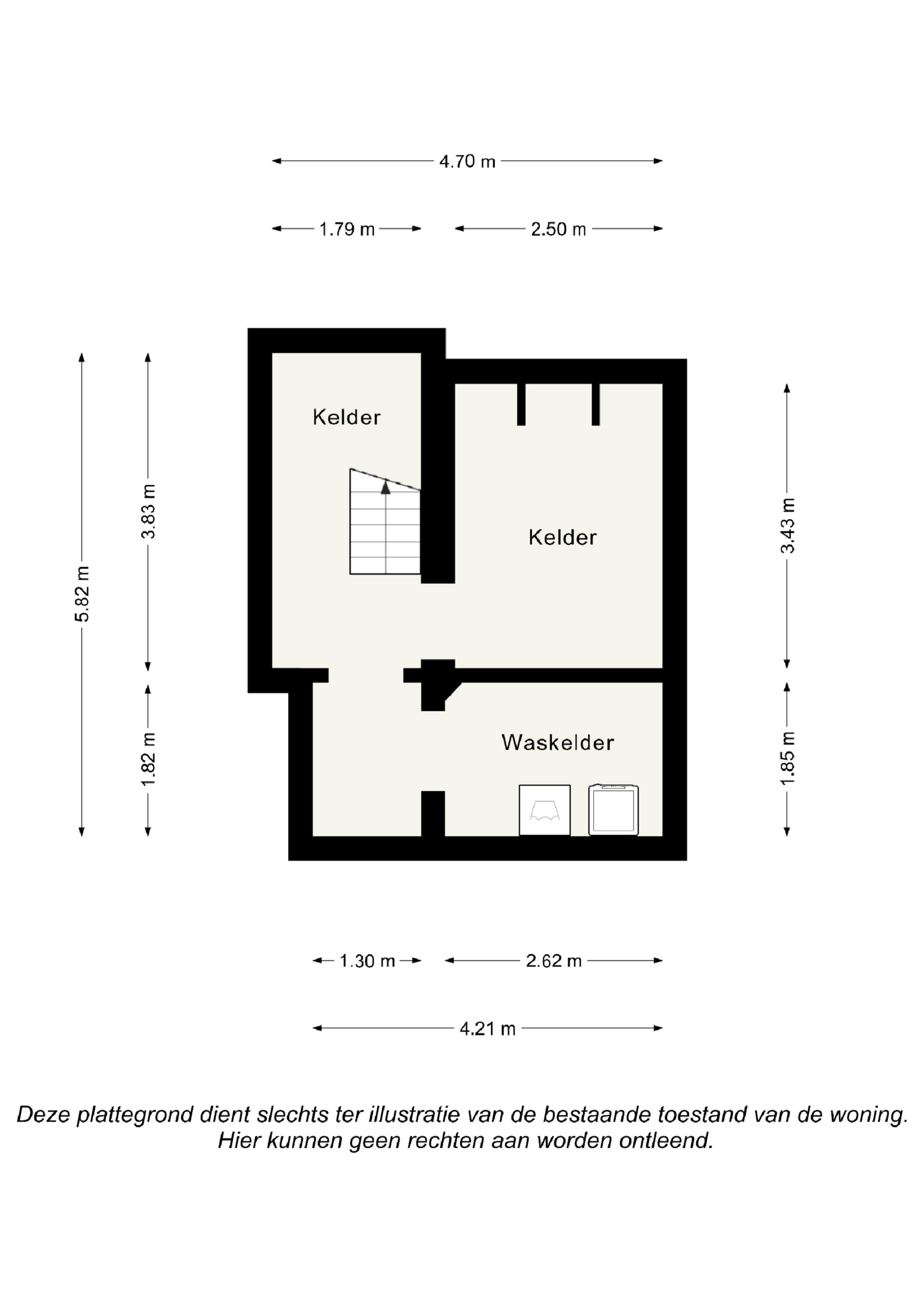 Kelderruimte I (3,83 m x 1,79 m) biedt toegang tot waskelder (4,21 m x 1,85 m) en kelderruimte II (3,43 m x 2,50 m).
