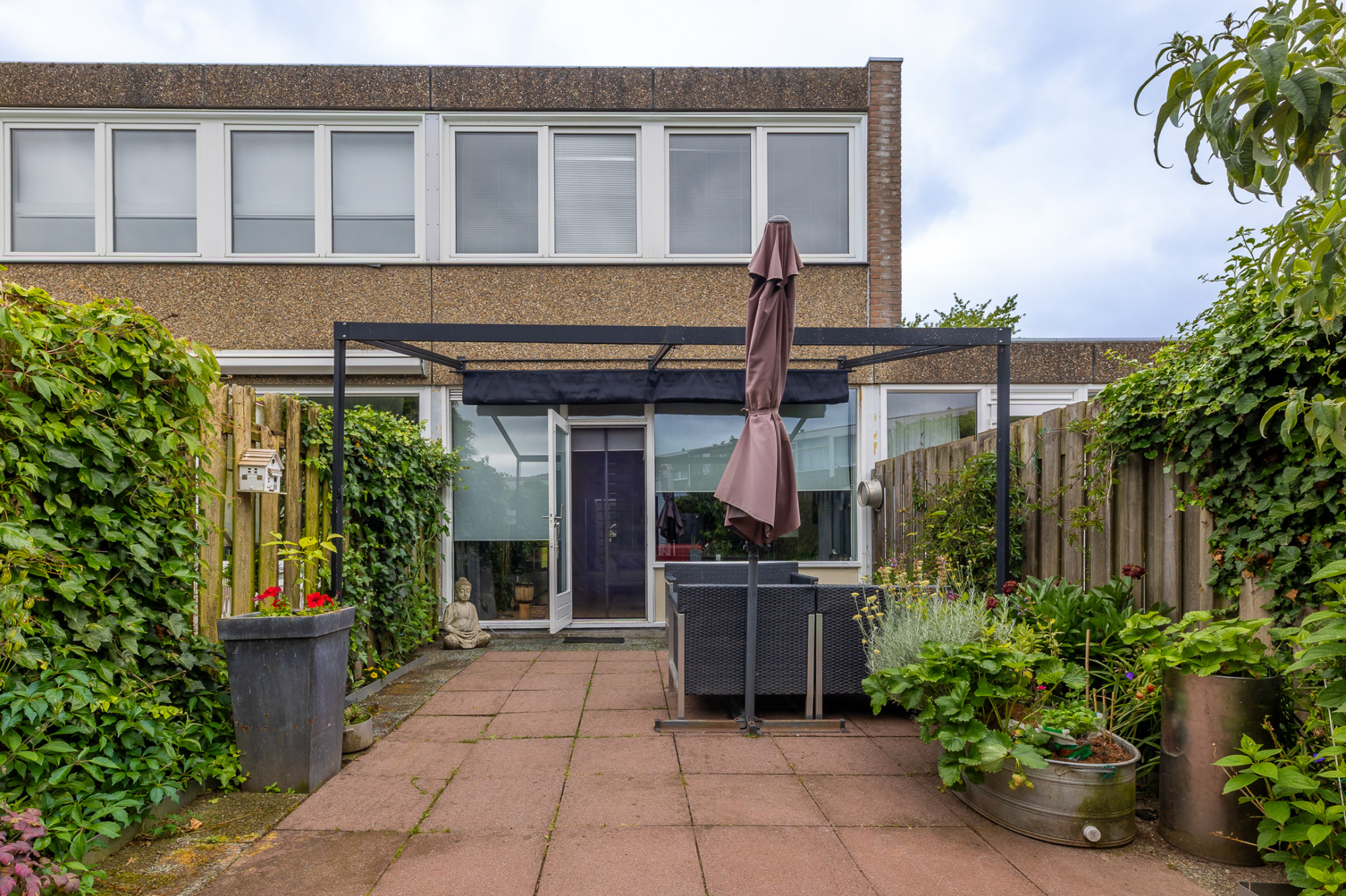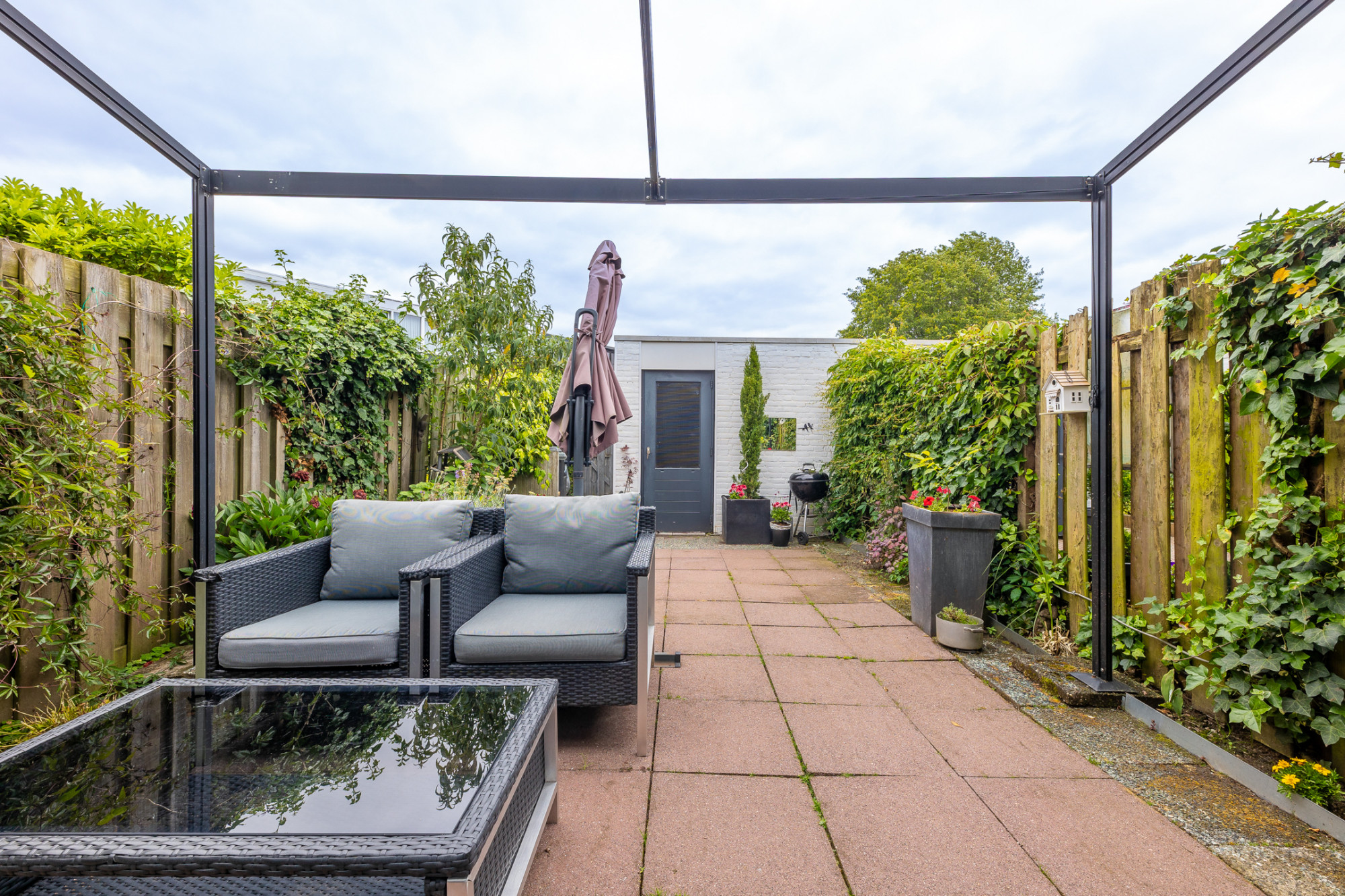 Sfeervolle onderhoudsvriendelijke tuin met toegang tot separate berging (2,91 m x 2,78 m) en middels poort achterom bereikbaar.