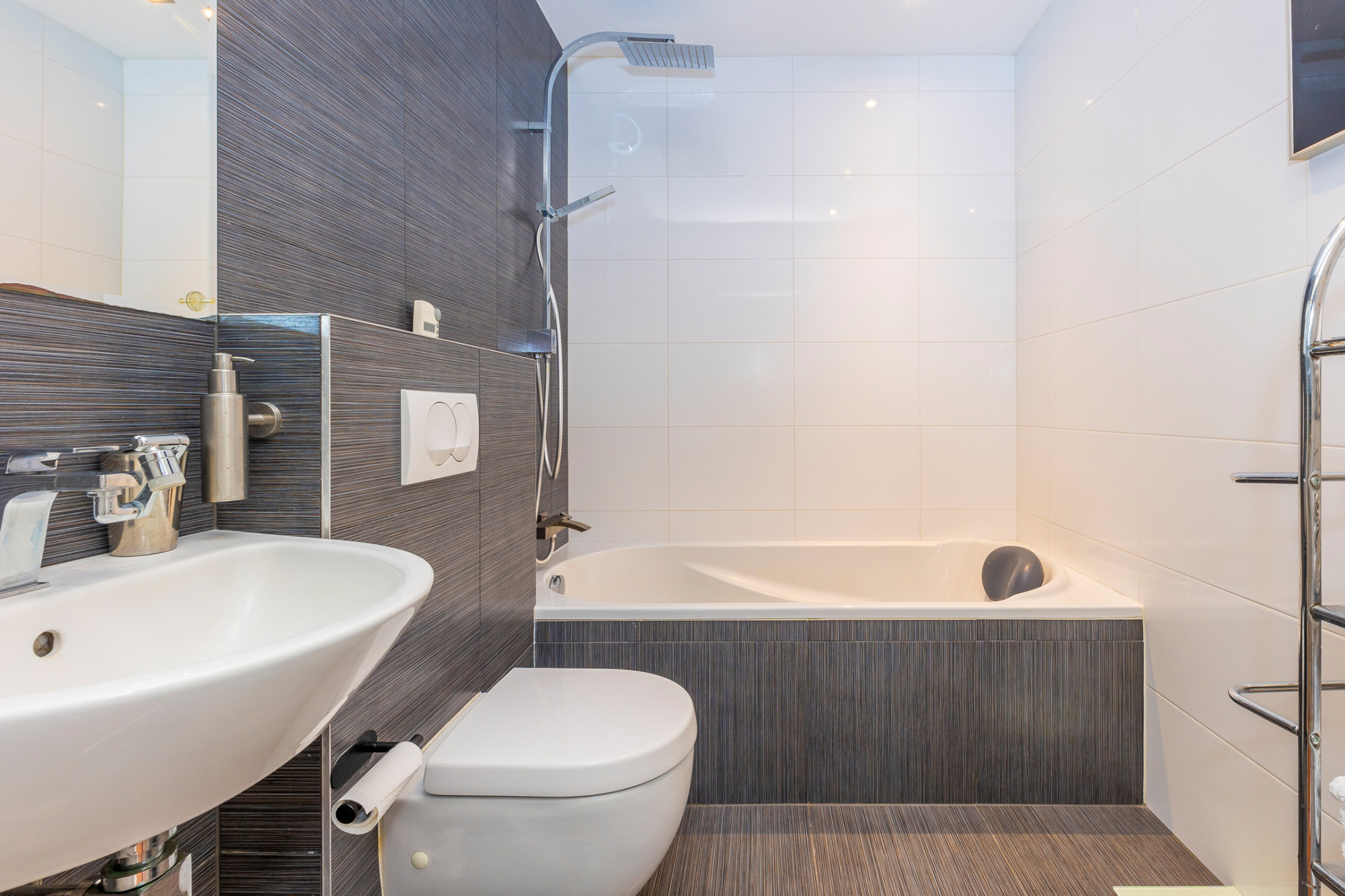 De moderne badkamer (2,27 m x 1,80 m) is v.v. ligbad (met douche functie) 2e toilet en vaste wastafel