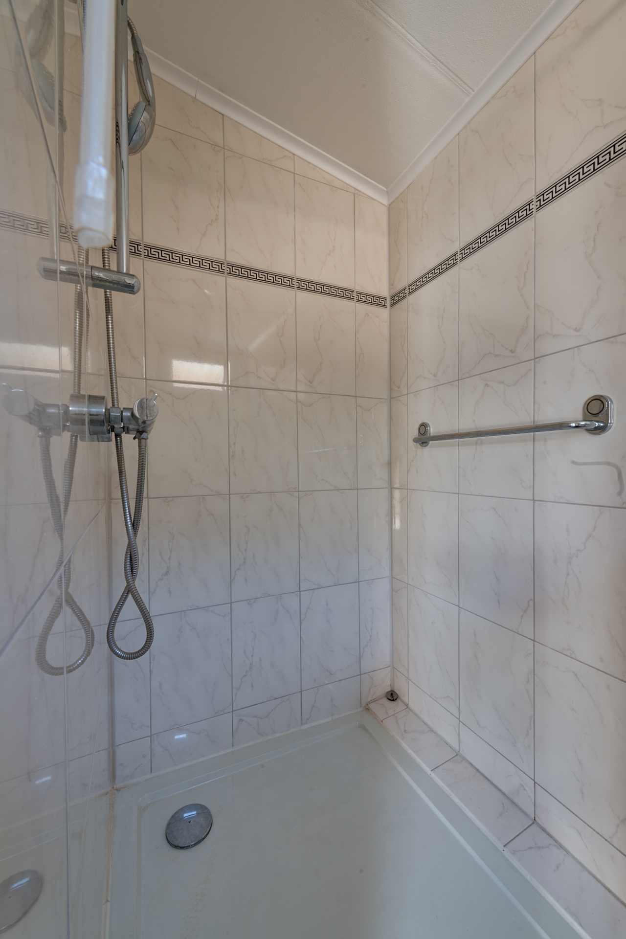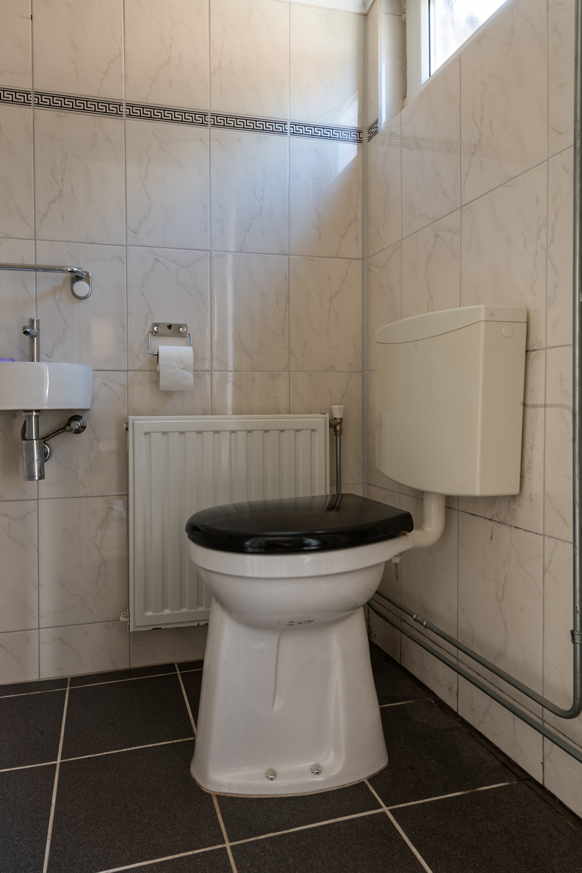 Achter de keuken bevindt zich de geheel betegelde badkamer met douche, toilet en wasbak.