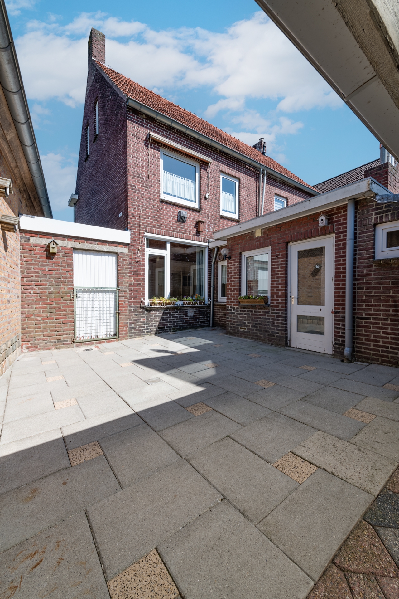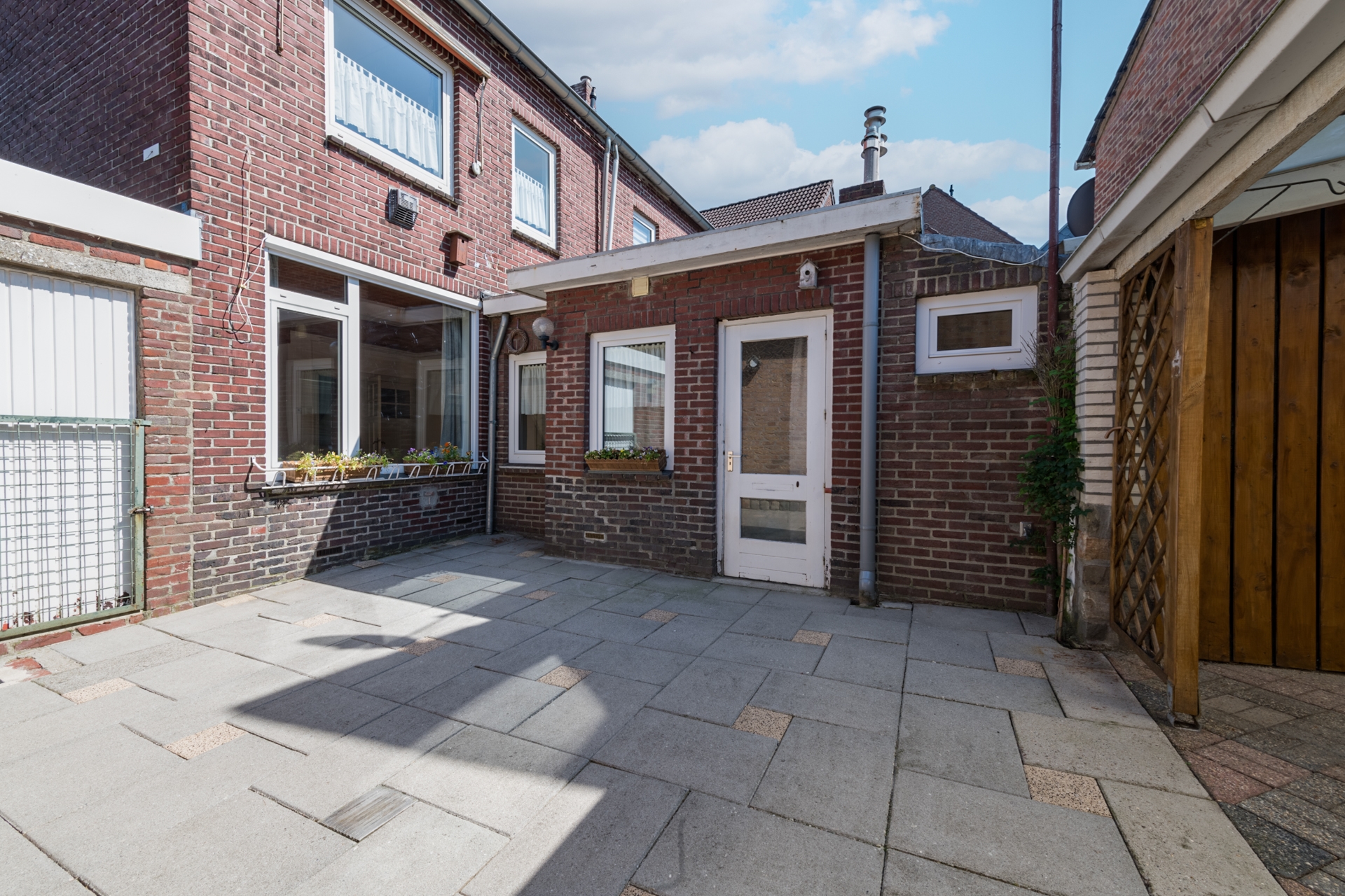 De patiotuin aan de achterzijde is geheel betegeld en is via de garage bereikbaar.