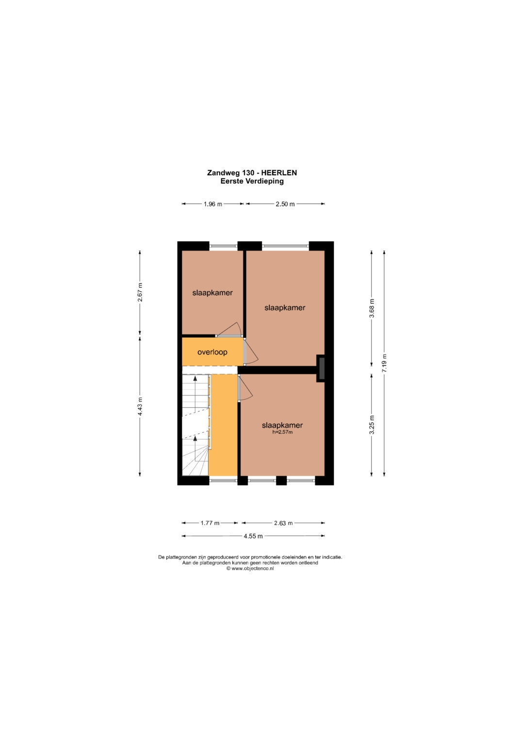 Met een vaste trap komen we op de overloop waaraan zich de 3 slaapkamers bevinden. 2 Slaapkamers aan de achterzijde (250 x 368 en 267 x 196 cm). Aan de voorzijde de andere slaapkamer (325 x 263 cm).