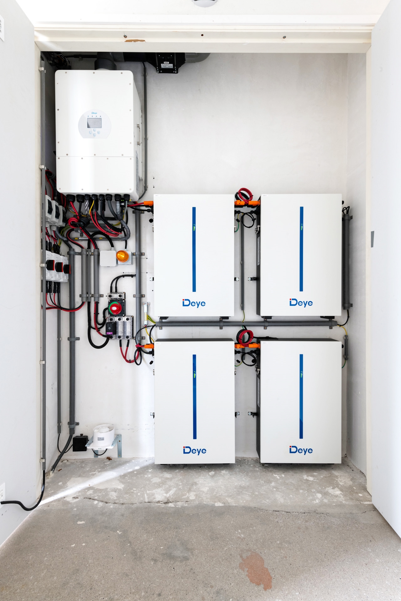 -Energie opslag: Thuis batterijen 4 stuks van elke max 240 A met Hybride Inverter en 36 PVpanelen.
