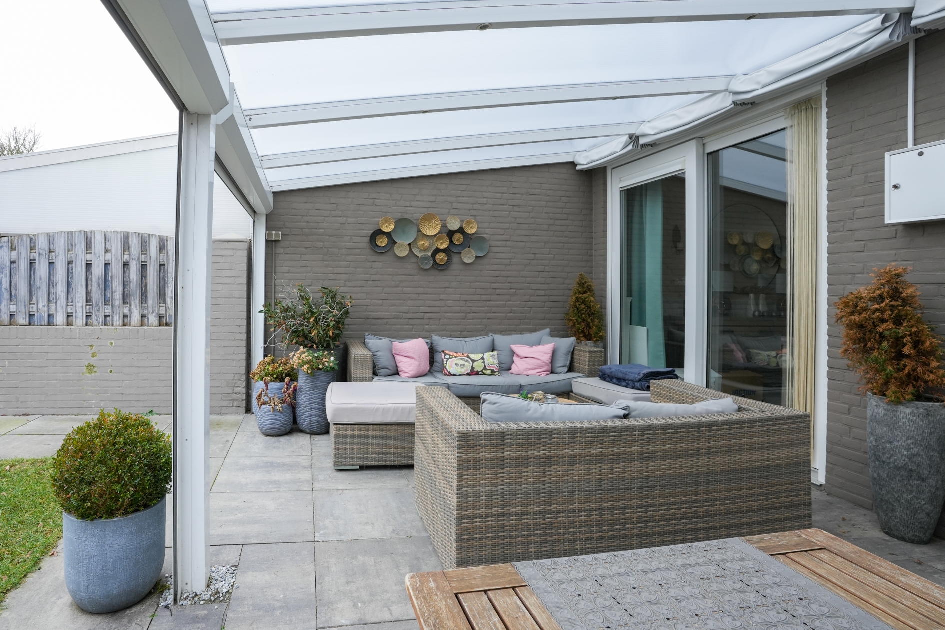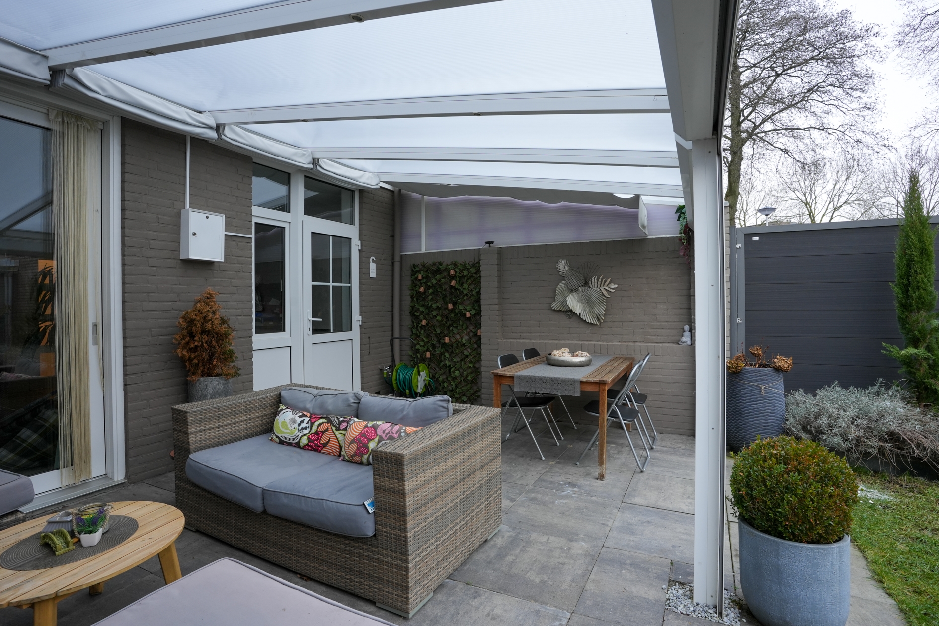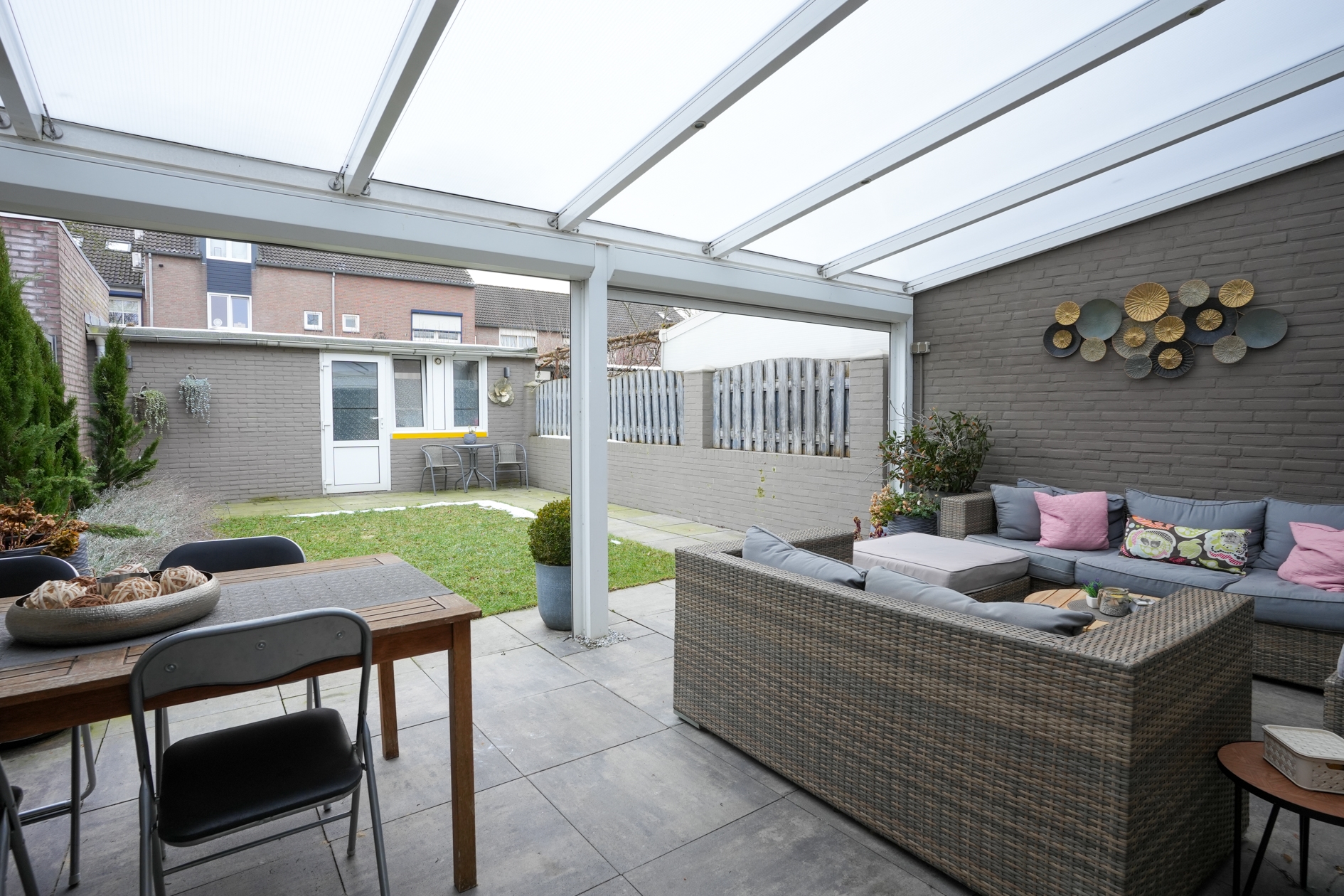 Vanuit de woonkamer als ook de keuken is de zonnige achtertuin met overkapping, berging en eigen achterom bereikbaar.