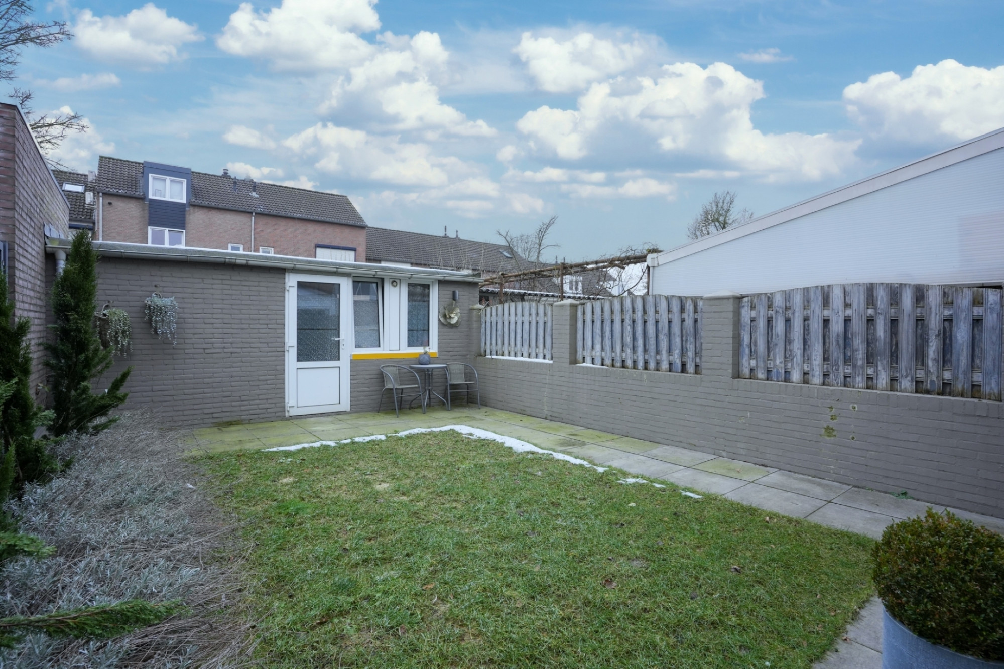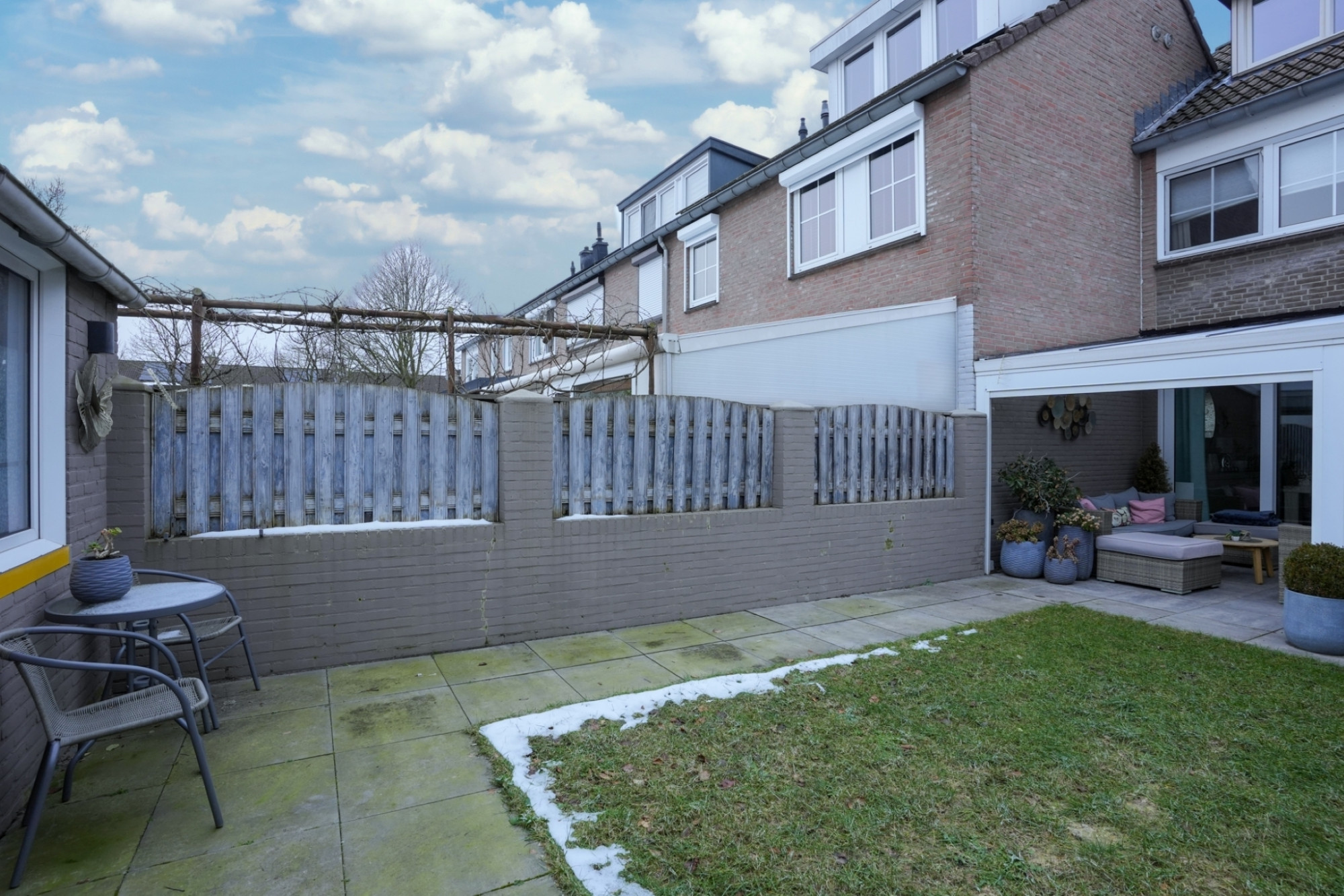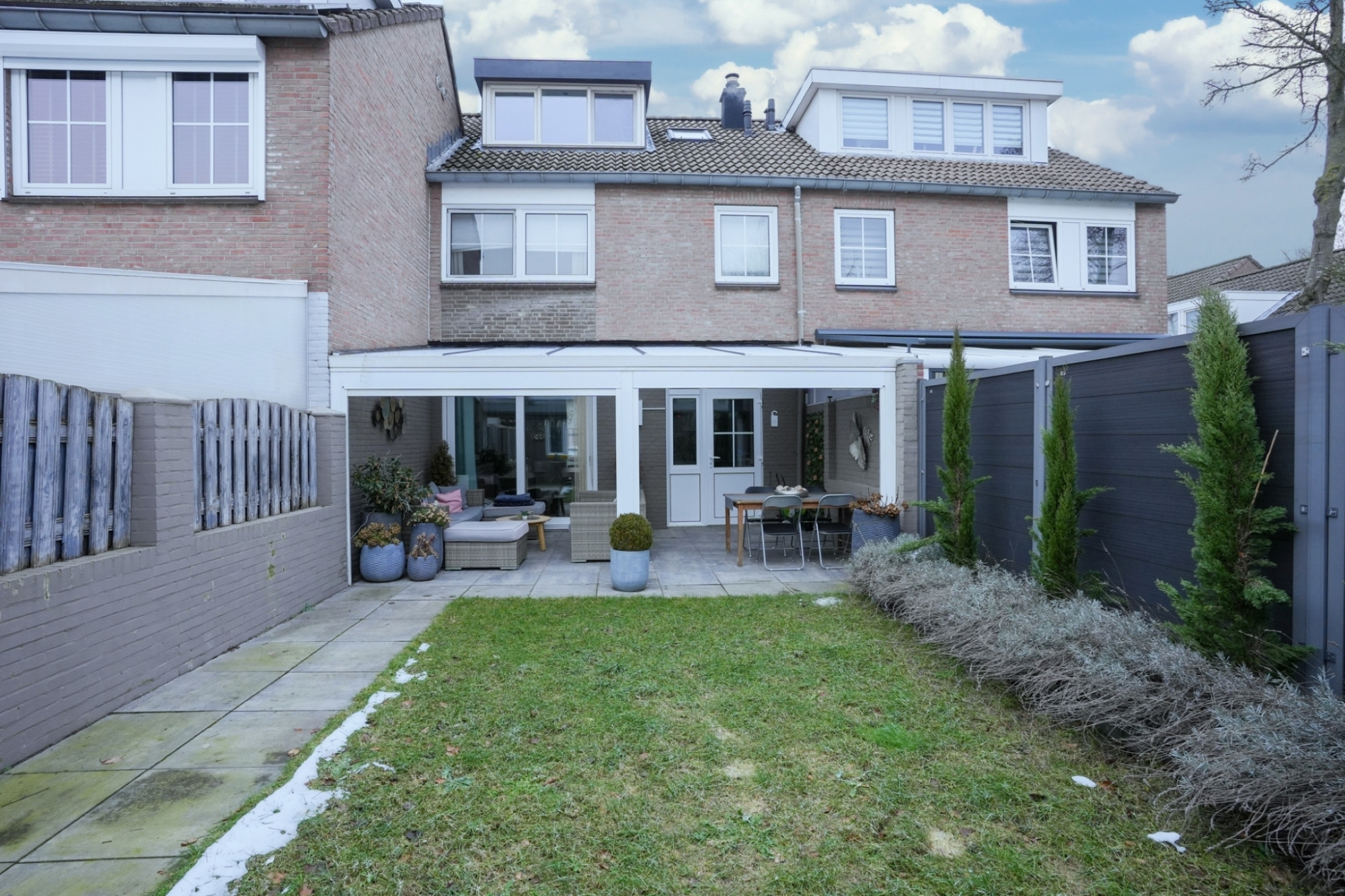 Vanuit de woonkamer als ook de keuken is de zonnige achtertuin met overkapping, berging en eigen achterom bereikbaar.