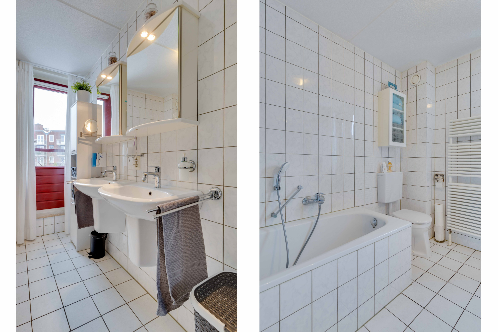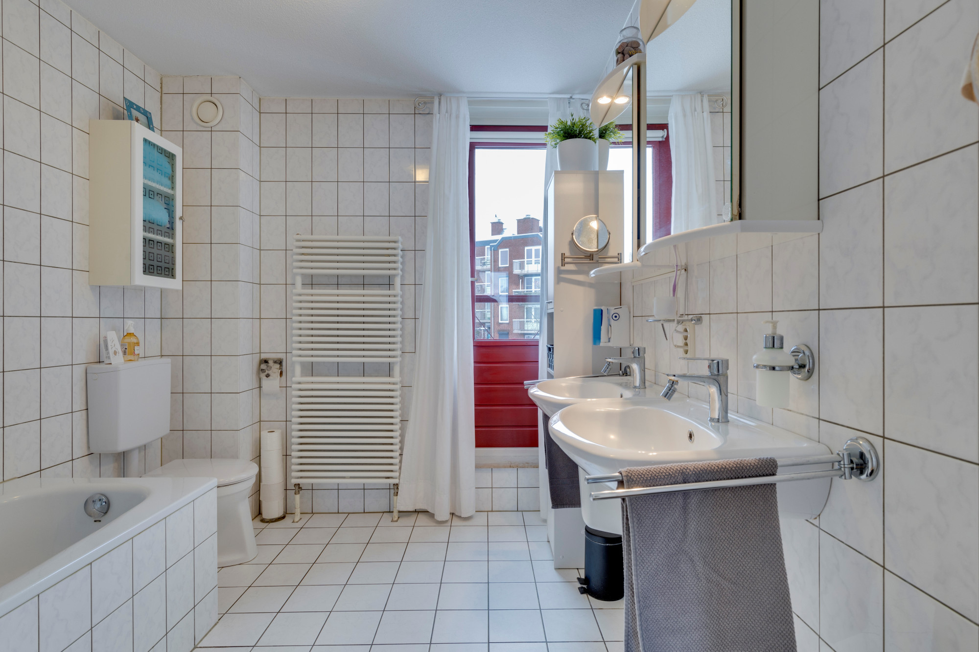 Geheel betegelde badkamer met 2e toilet, dubbele vaste wastafel, ligbad en designradiator.