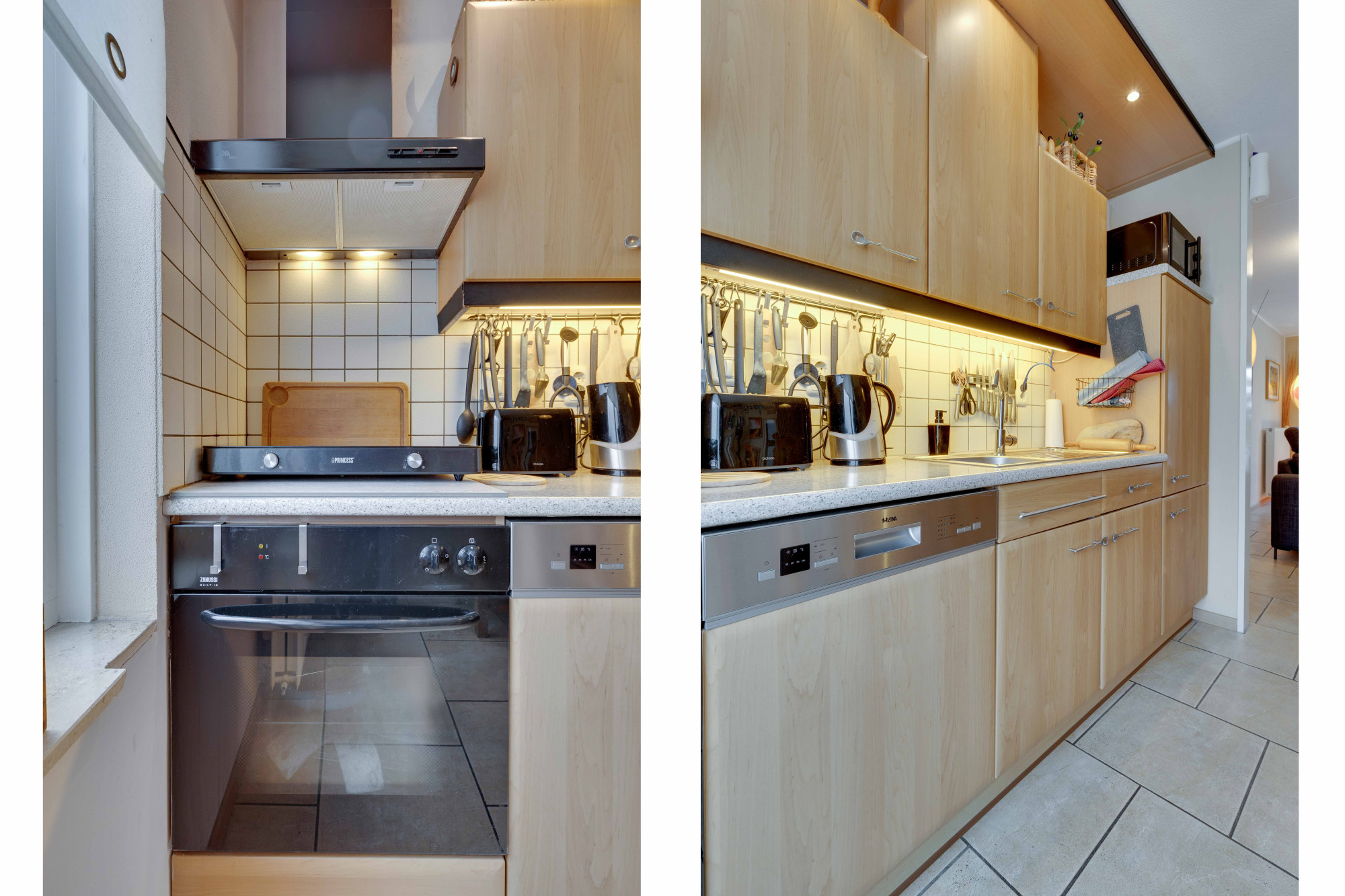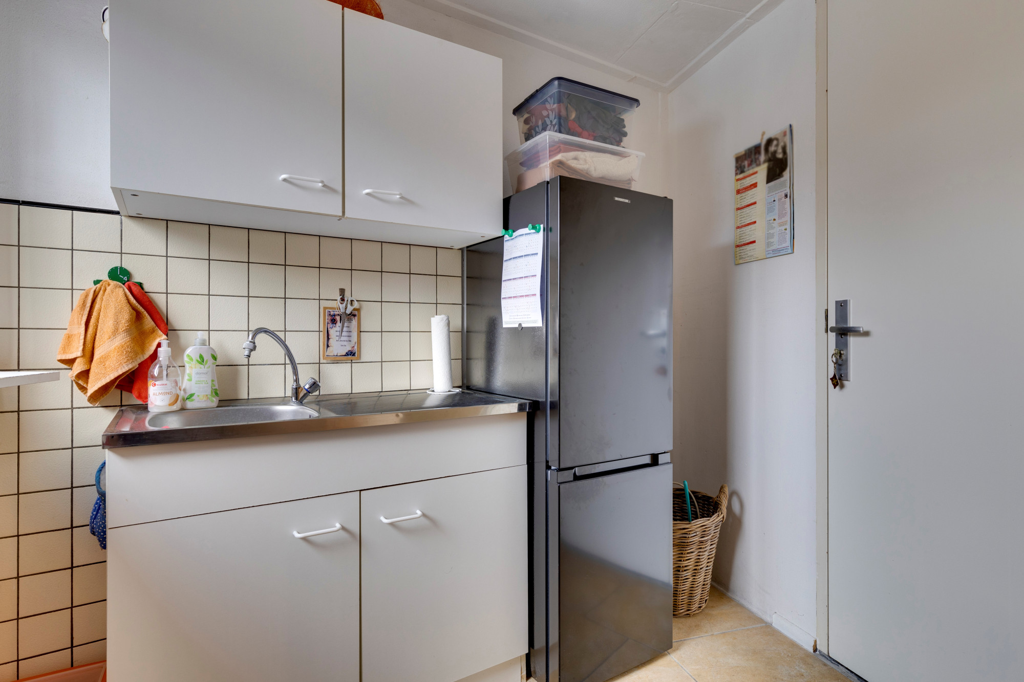 Bijkeuken voorzien van plavuizenvloer, kitchenette, buitendeur naar het terras en de tuin, aansluitpunten voor wasmachine en droger en een inpandige toegang naar de ruime geïsoleerde garage met houten toegangspoort.