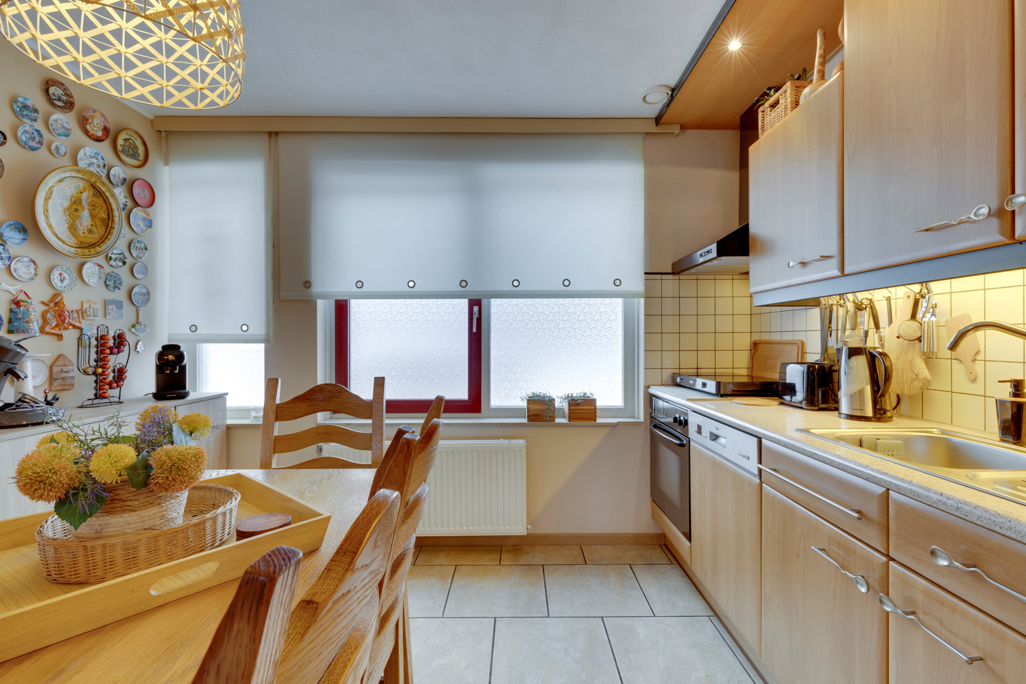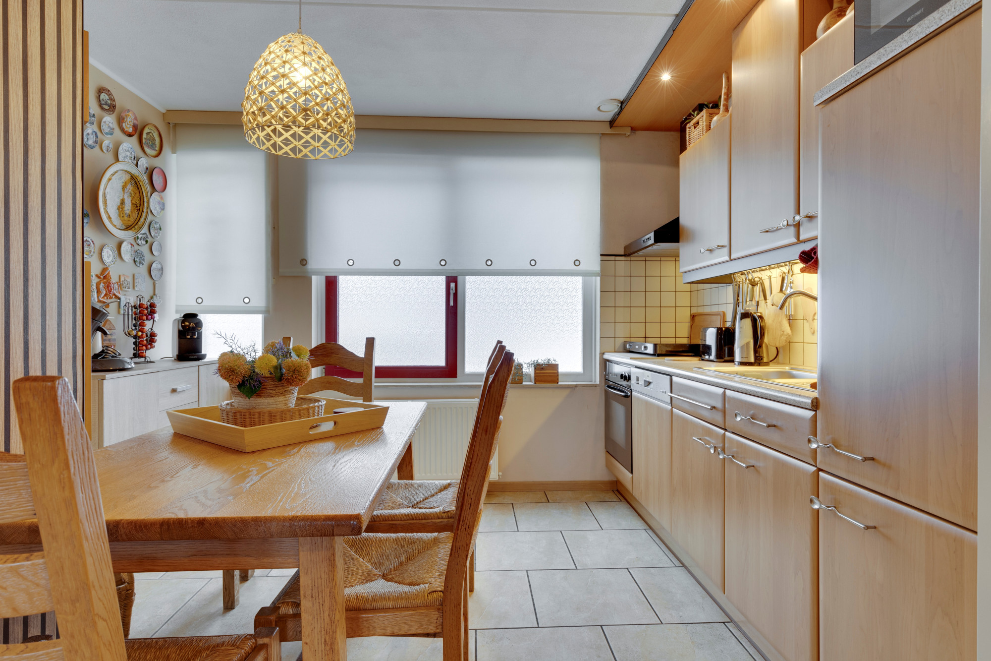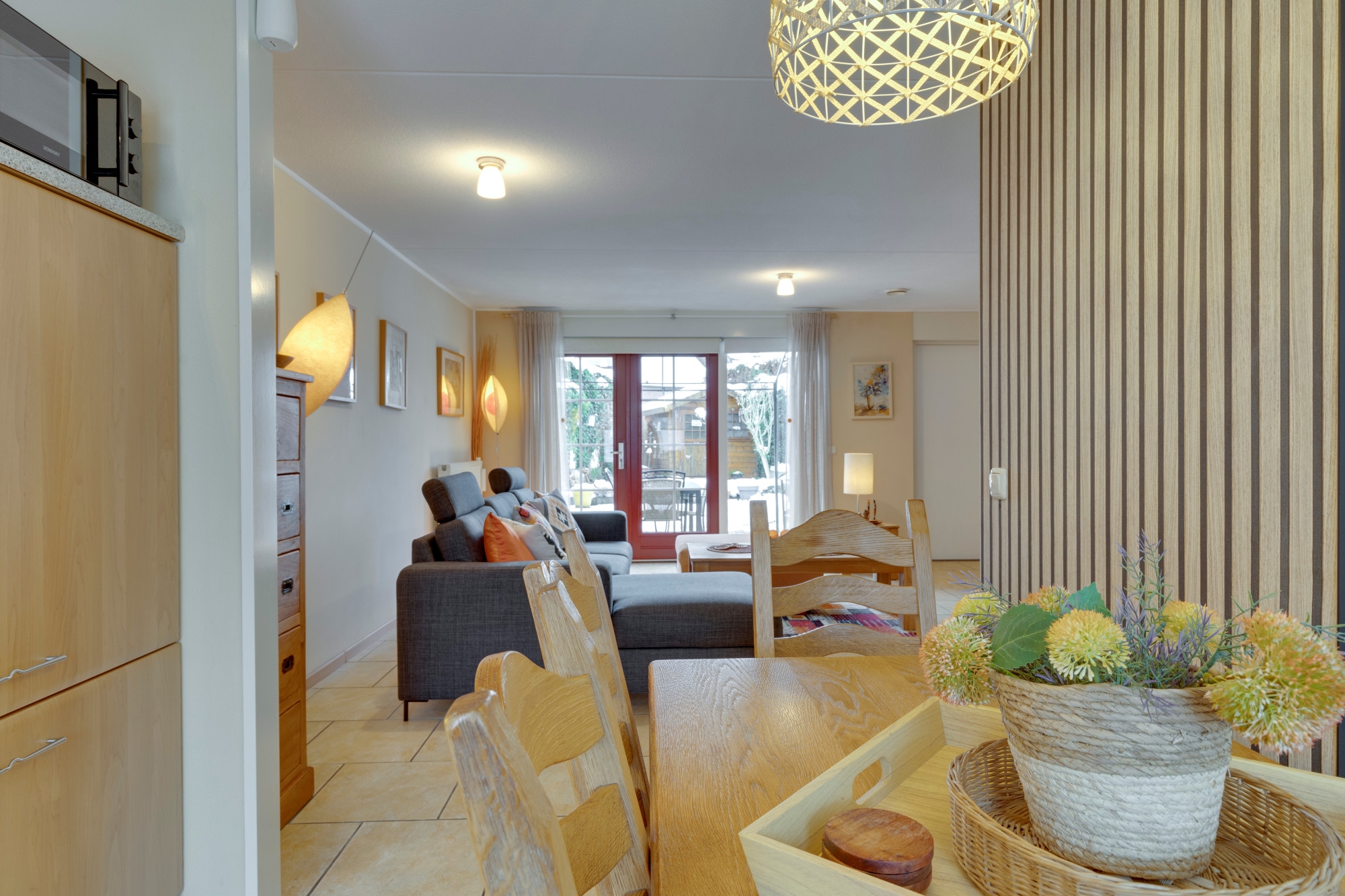 Woonkamer met plavuizenvloer en openslaande deuren naar het terras en de tuin. Open keuken met plavuizenvloer en keukeninstallatie in hoekopstelling v.v. oven, vaatwasser en wasemkap.