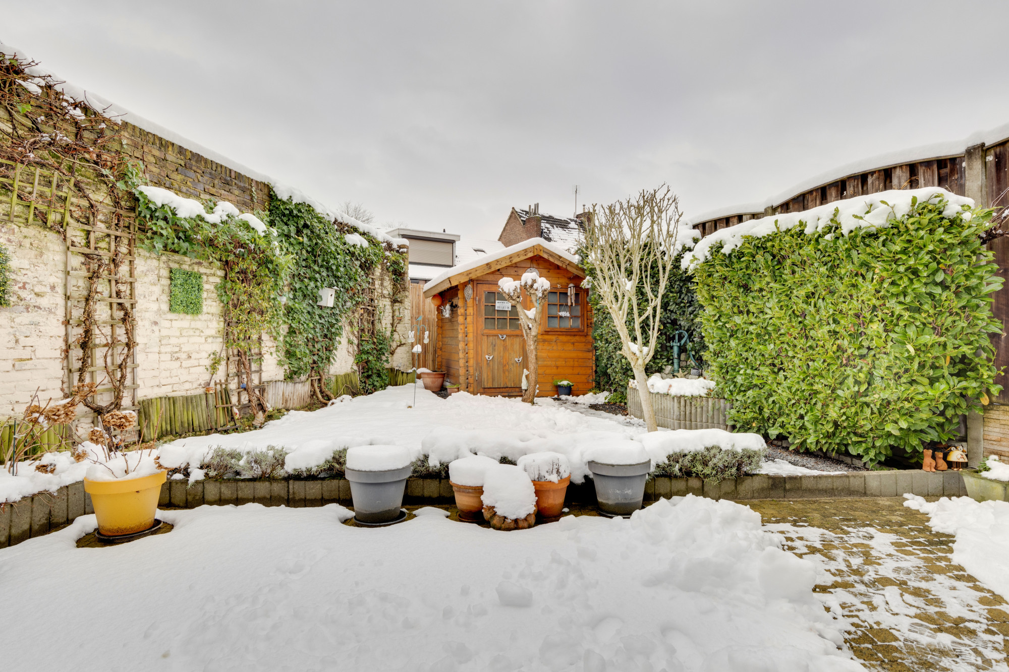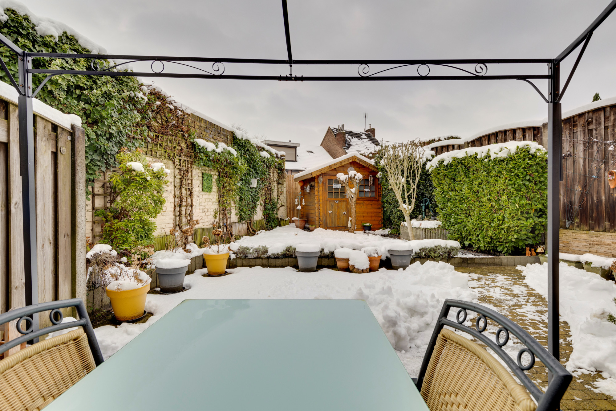 Ruim terras en en keurig aangelegde tuin met houten tuinhuis.