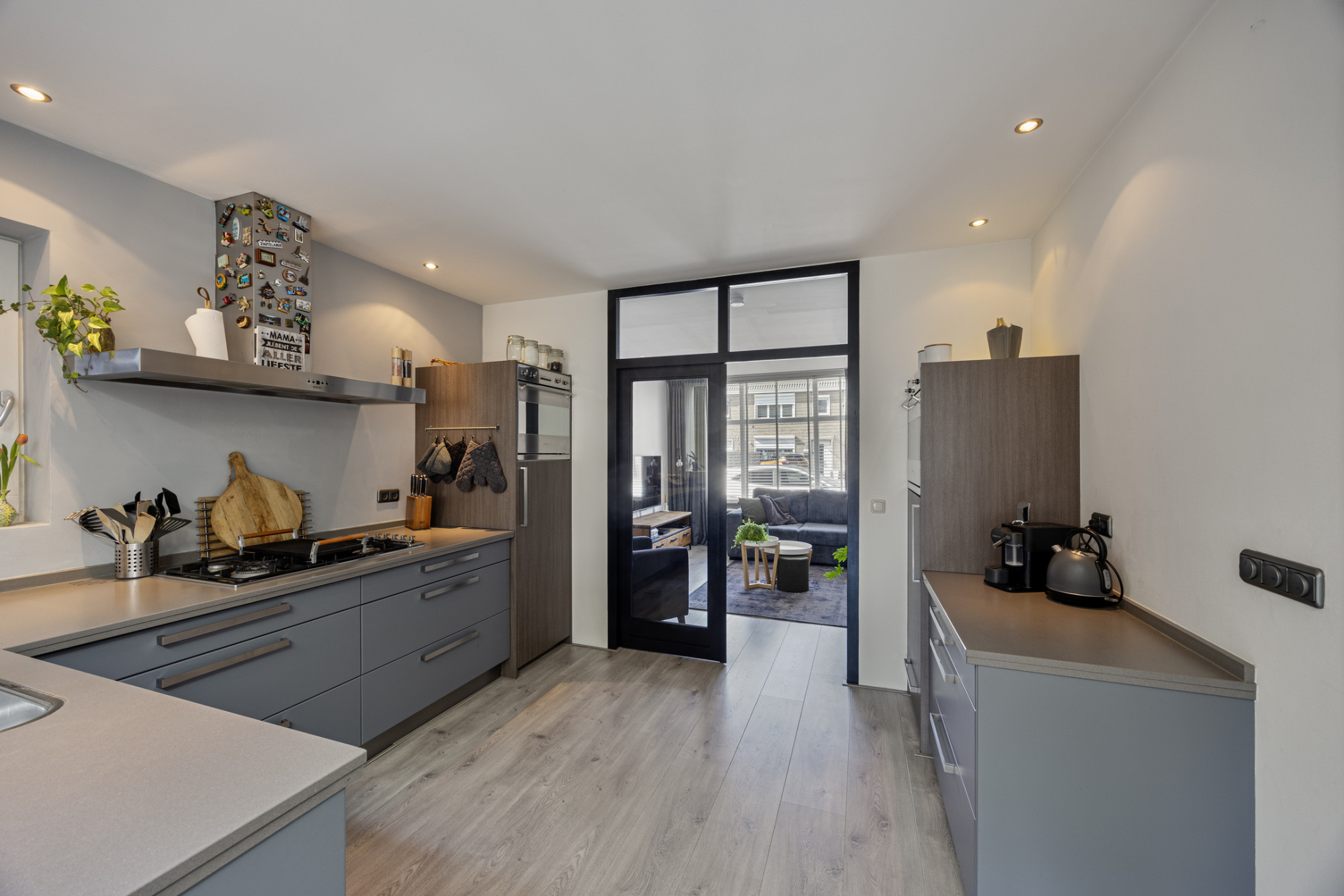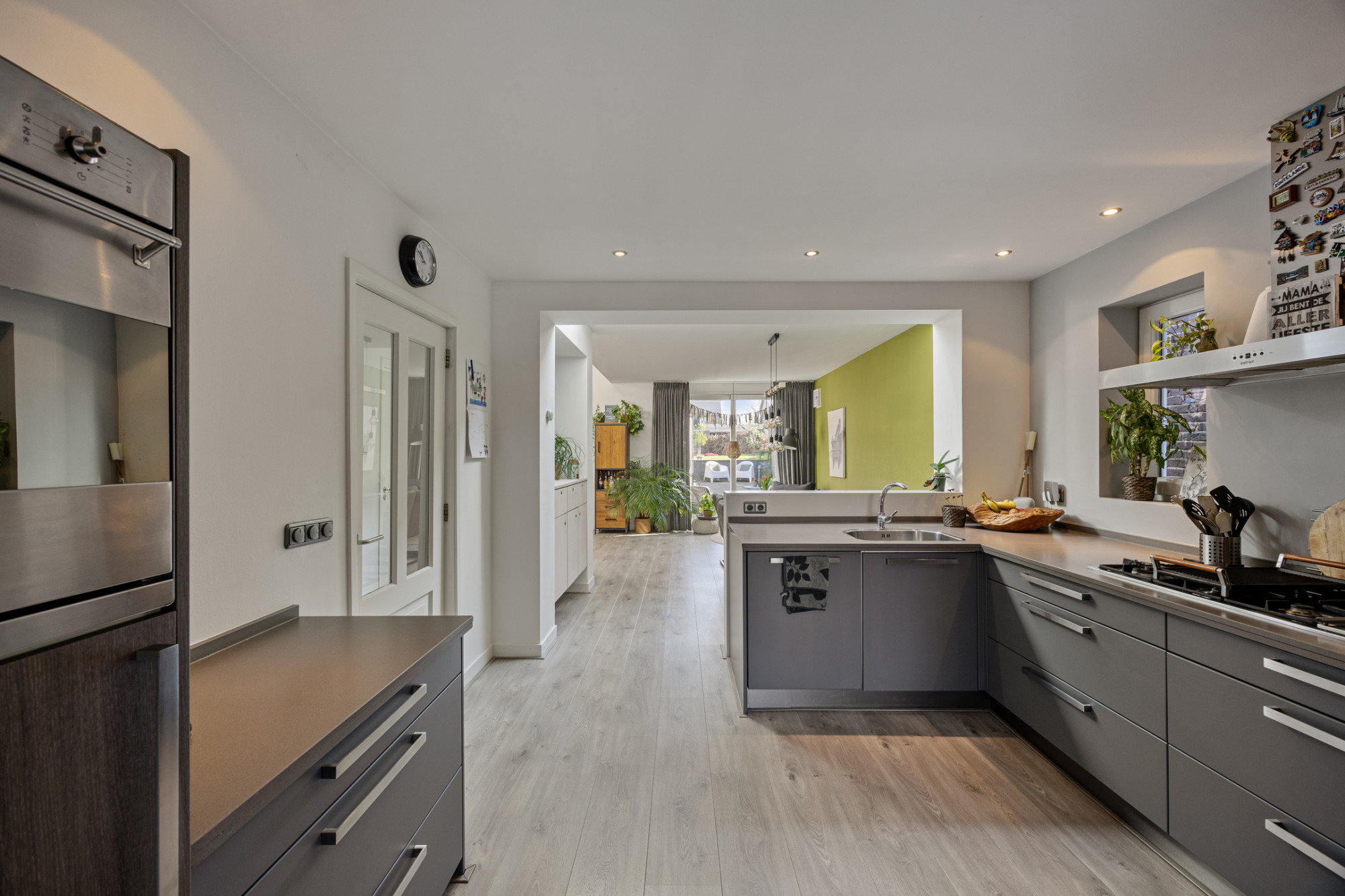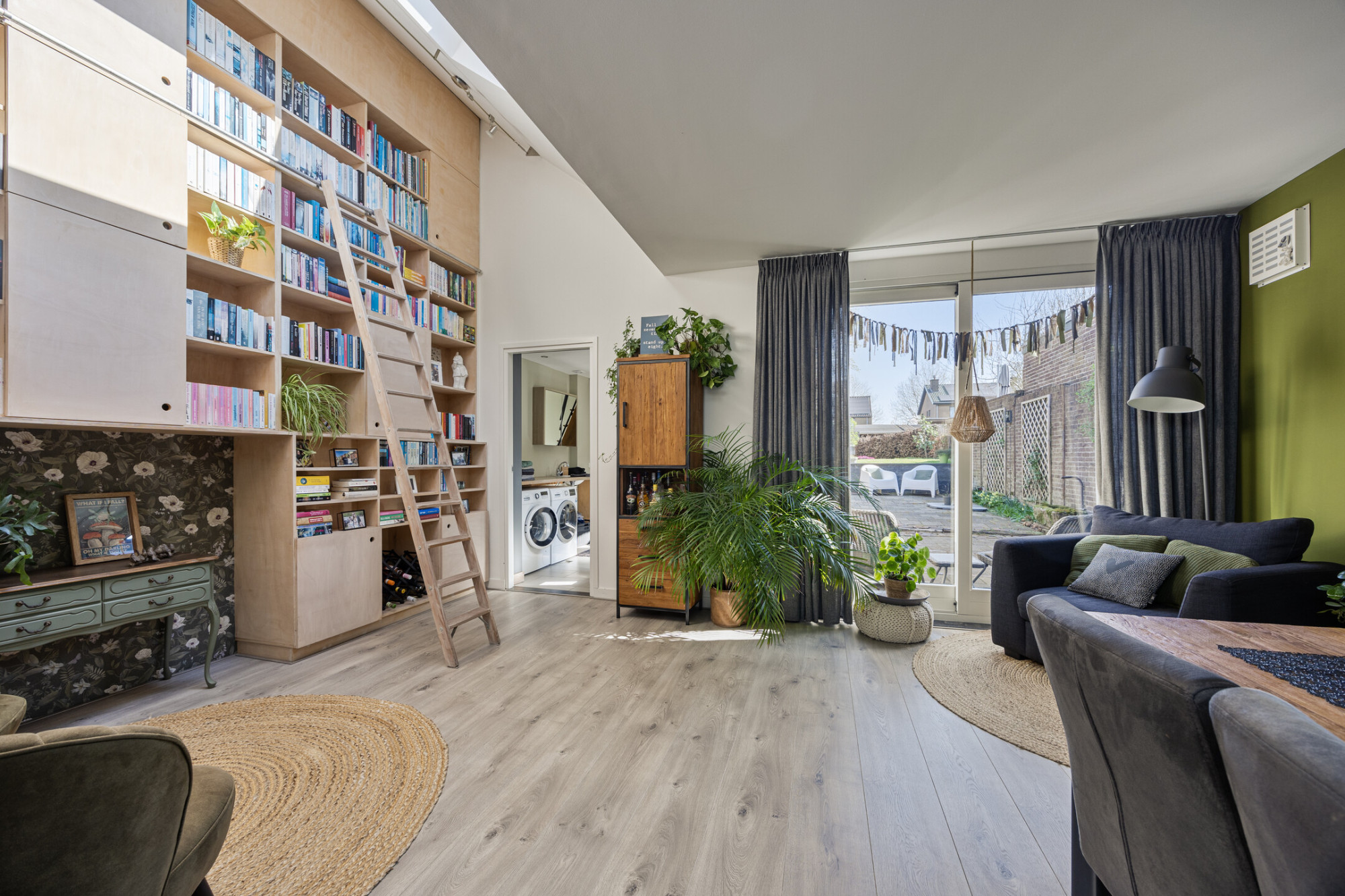 Overdekte entree met glas in lood elementen. Ruime inkomhal met verdiepingstrap, meterkast en toiletruimte voorzien van hangcloset en fonteintje. Woonkamer met houtkachel aan voorzijde gelegen met doorloop naar een open keuken gedeelte voorzien van een luxe keukeninstallatie. Vanuit het keukengedeelte een doorloop naar de aanbouw met eetkamer en 2e woonkamer. De aanbouw beschikt over een lichtstraat, een schuifpui naar de achtertuin en een kastenwand tot in de nok (circa 4,5m hoog). In de bijkeuken bevindt zich een keurige douchegelegenheid en zijn er de aansluitingen van het witgoed. Bergzolder op de bijkeuken is bereikbaar via vlizotrap. Hier bevindt zich de cv installatie (Vaillant, huurtoestel)