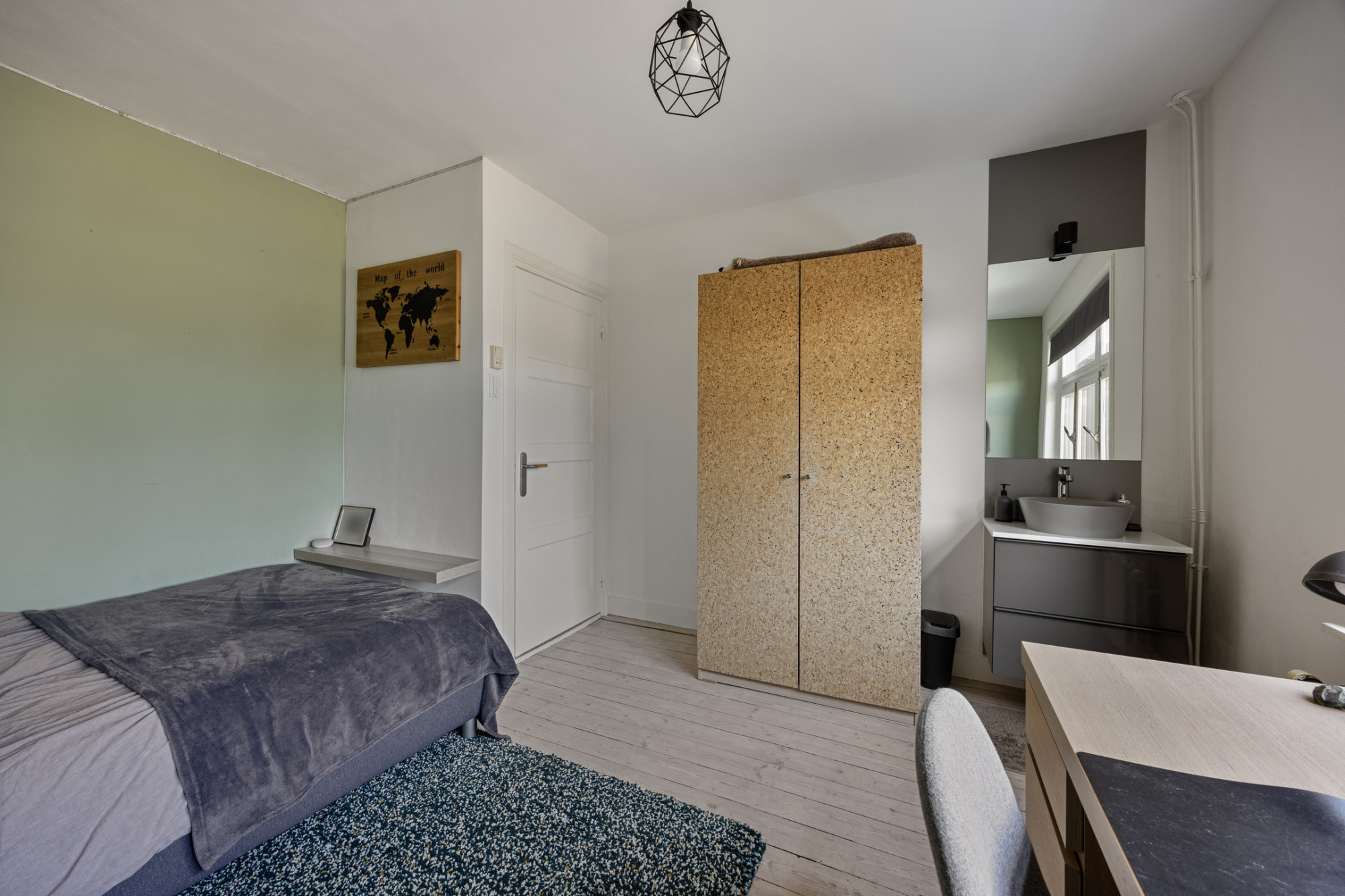 Overloop met toegang naar 2 slaapkamers (13m2) en (7m2). Badkamer voorzien van inloopdouche, hangtoilet en wastafel.