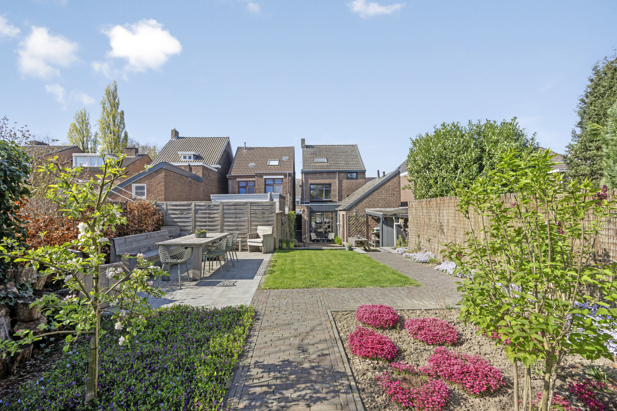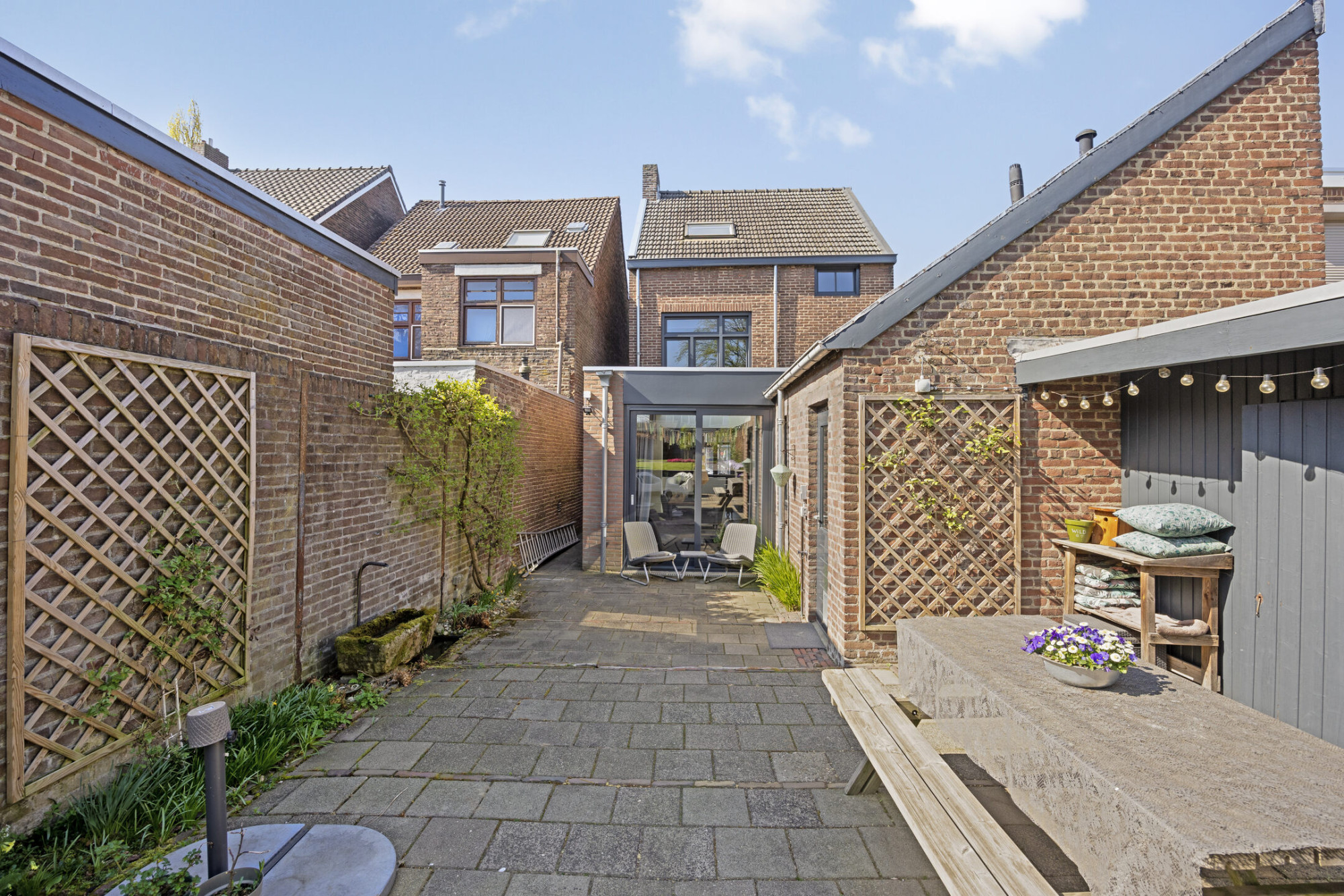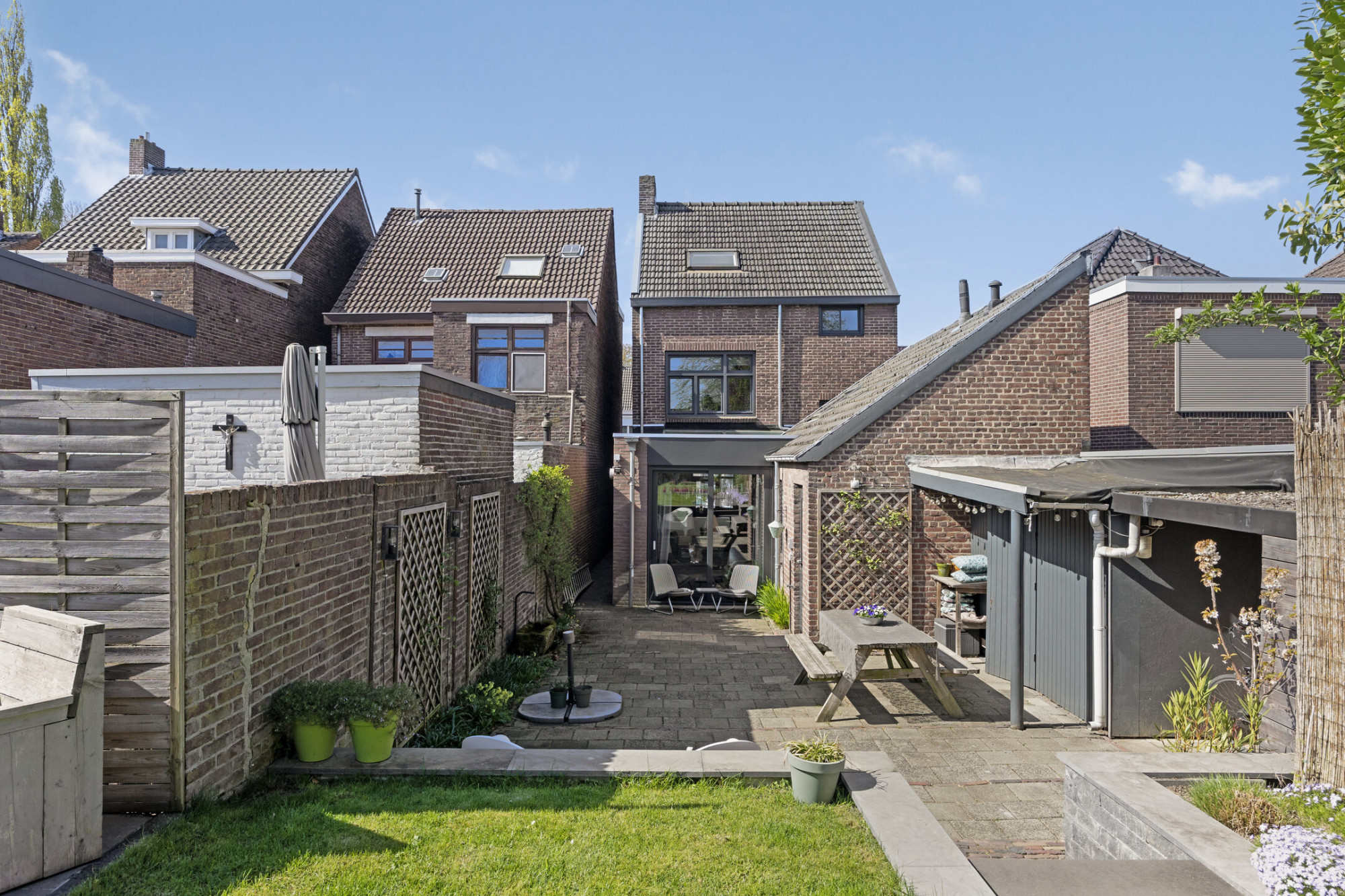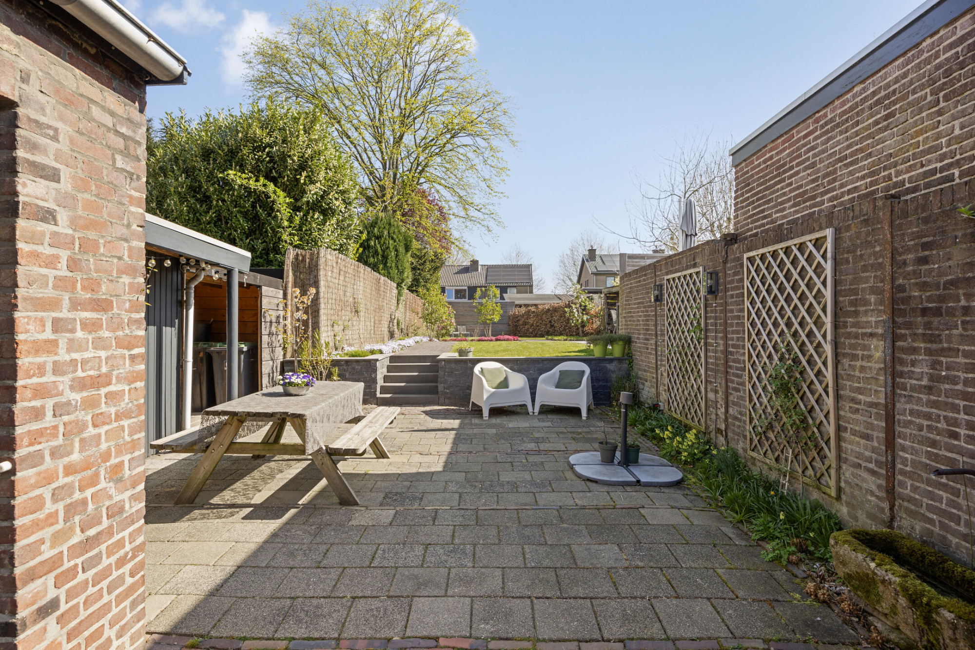 Aan rechterzijde van de woning is middels een afsluitbaar poortje een doorgang naar de achtertuin. Ook via de woning is de achtertuin te bereiken. De achtertuin is ruim en beschikt over terras, diverse beplantingen en gazon. De tuin is circa 35m diep