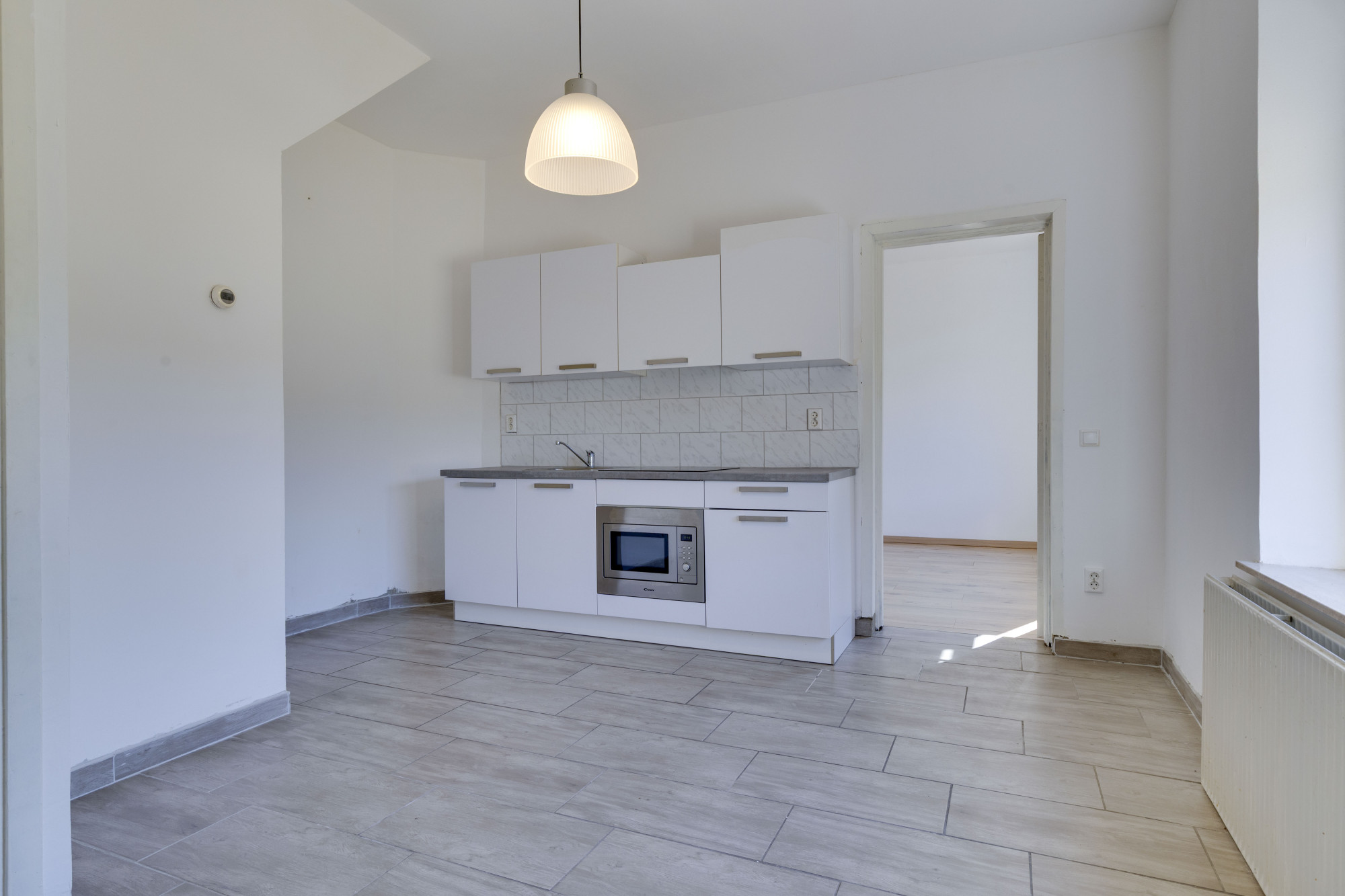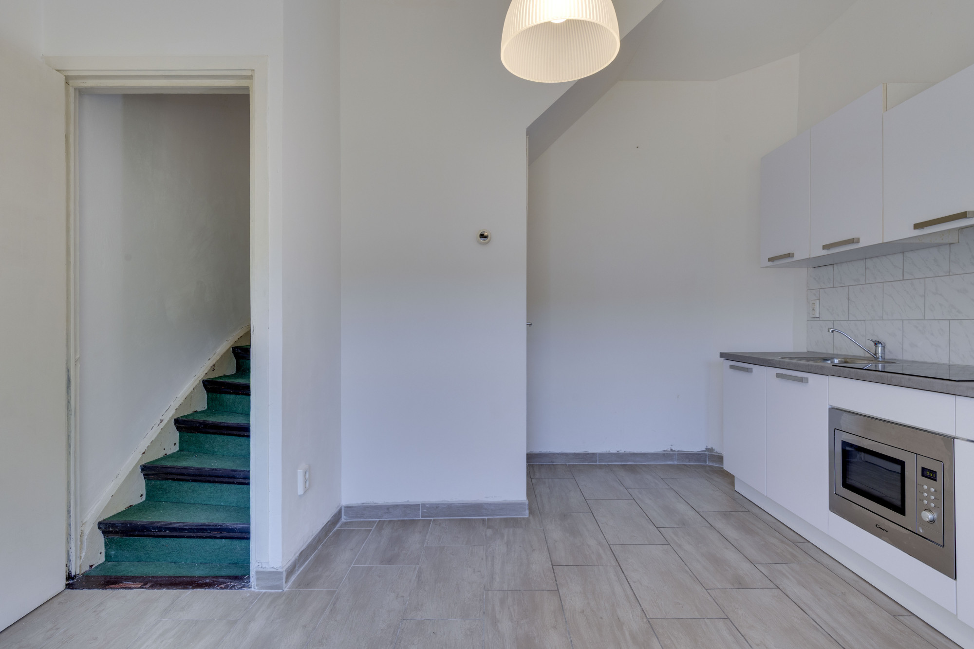 De aangrenzende keuken is voorzien van een eenvoudig keukenblok en tegelvloer.