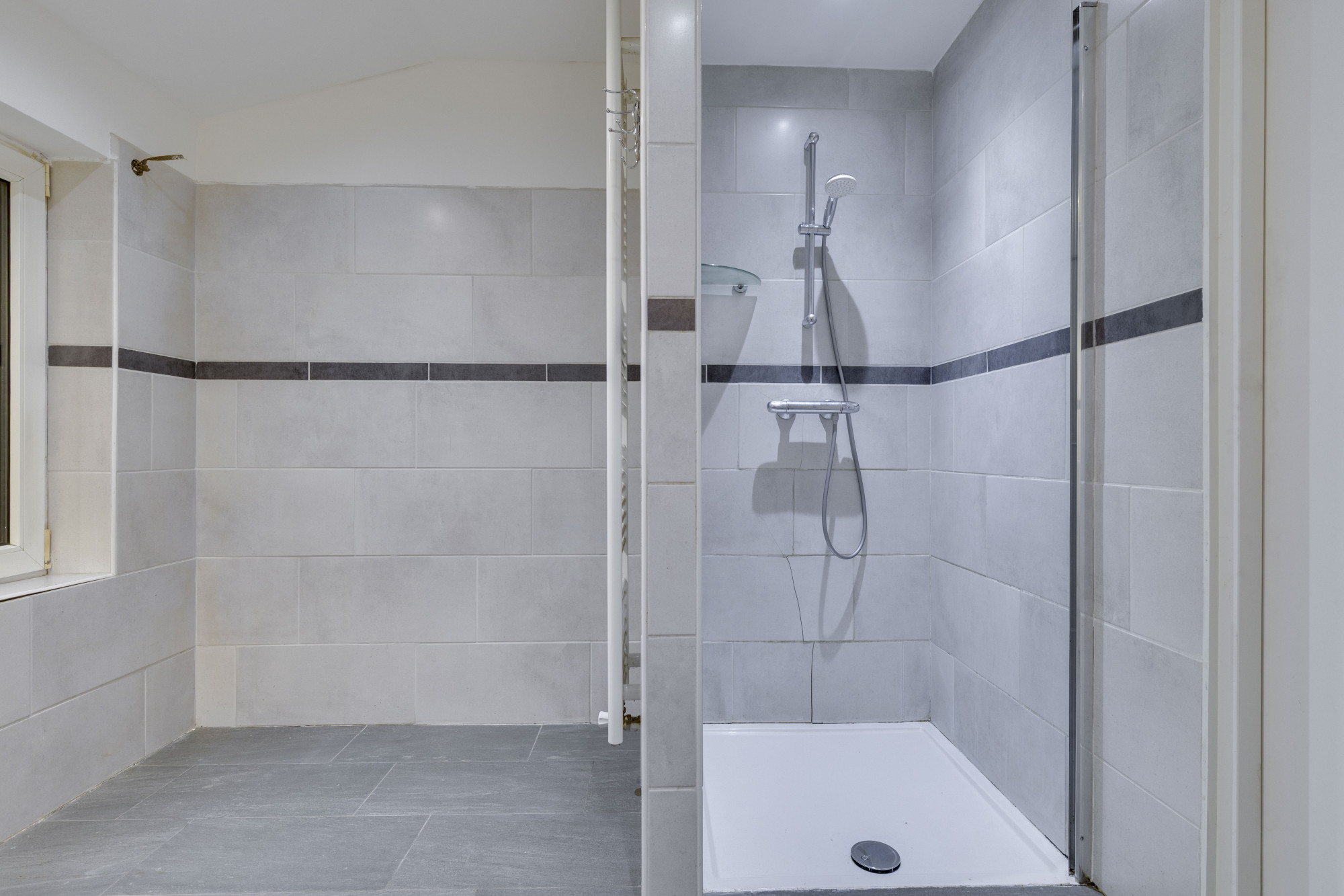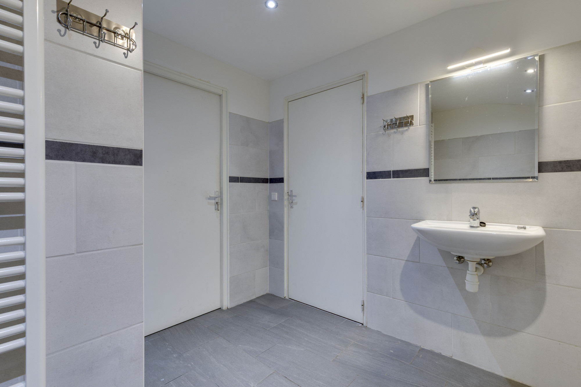 De badkamer is uitgerust met een douche en vaste wastafel. Tevens is er een separate inpandige bergruimte aanwezig.