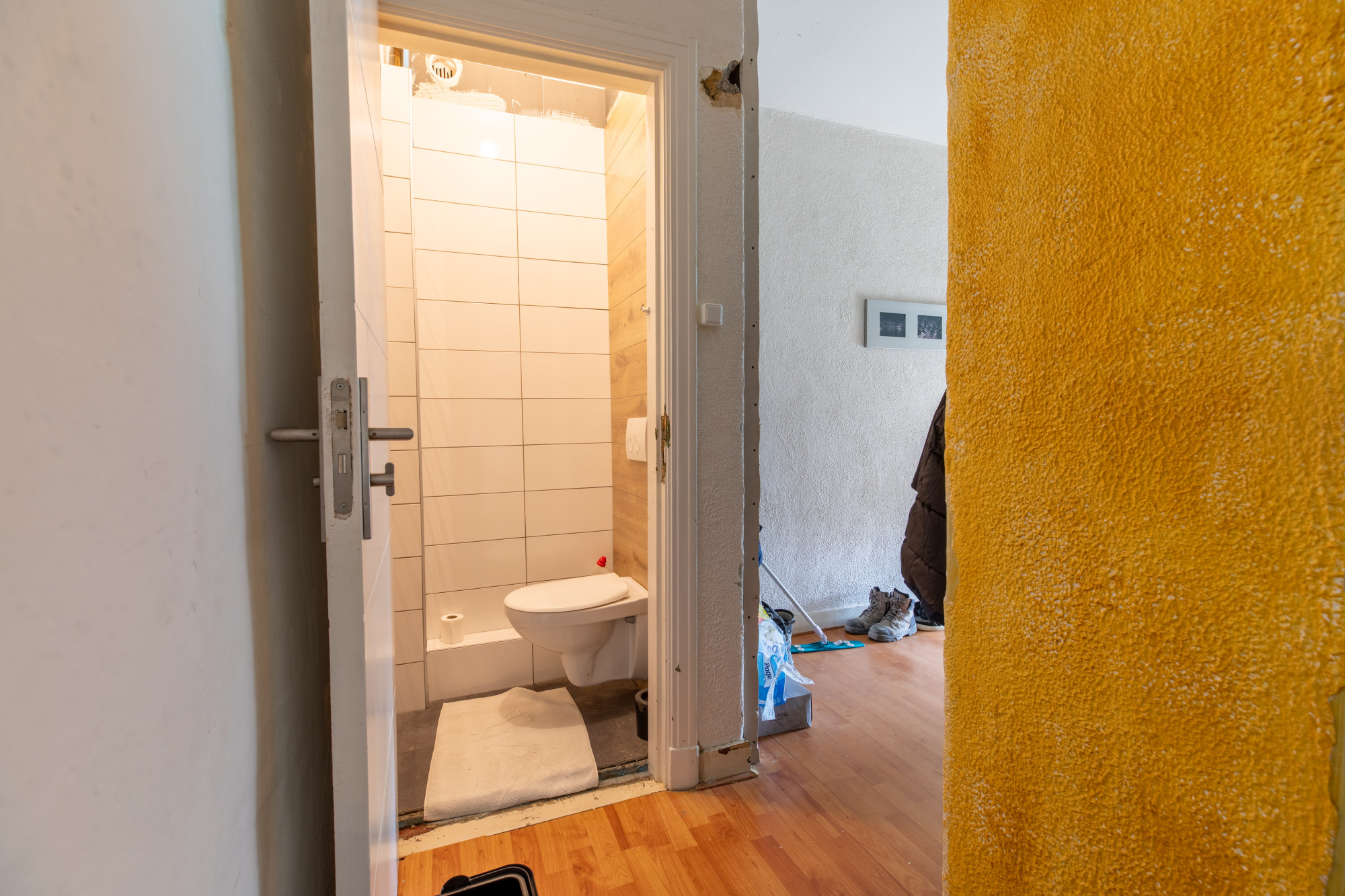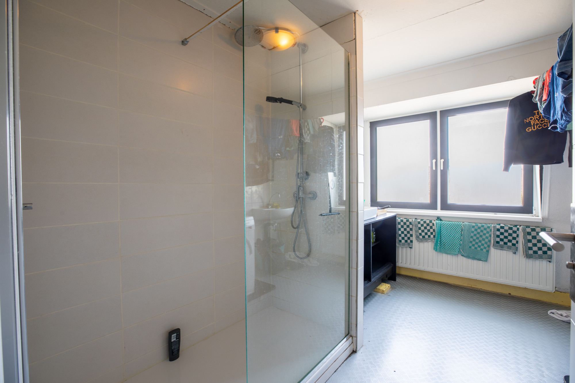 Badkamer (3.70 x 2.72 m) met inloopdouche, vaste wastafel en witgoed aansluiting..