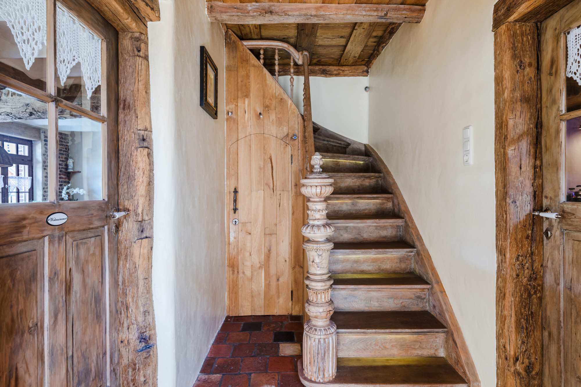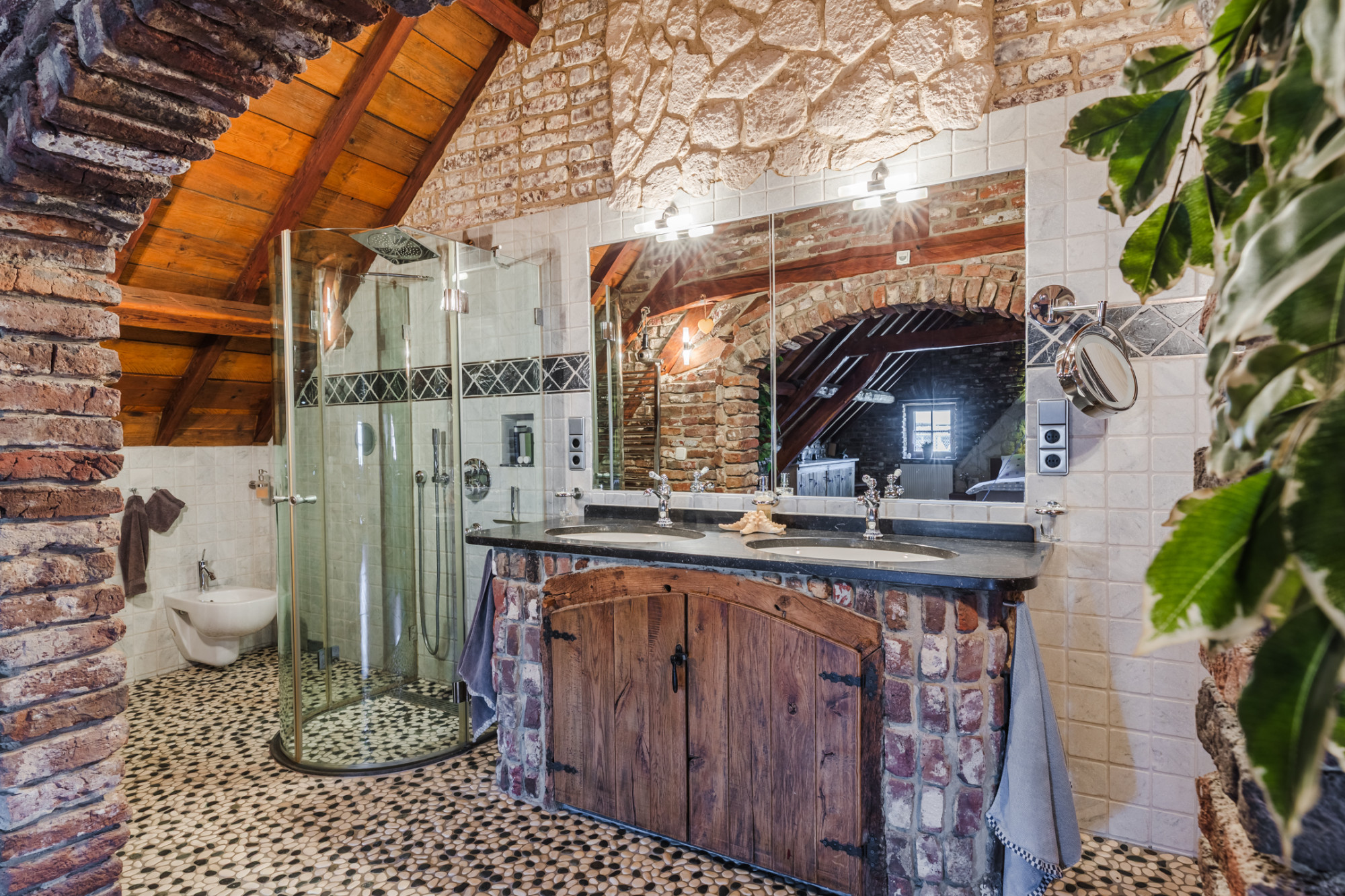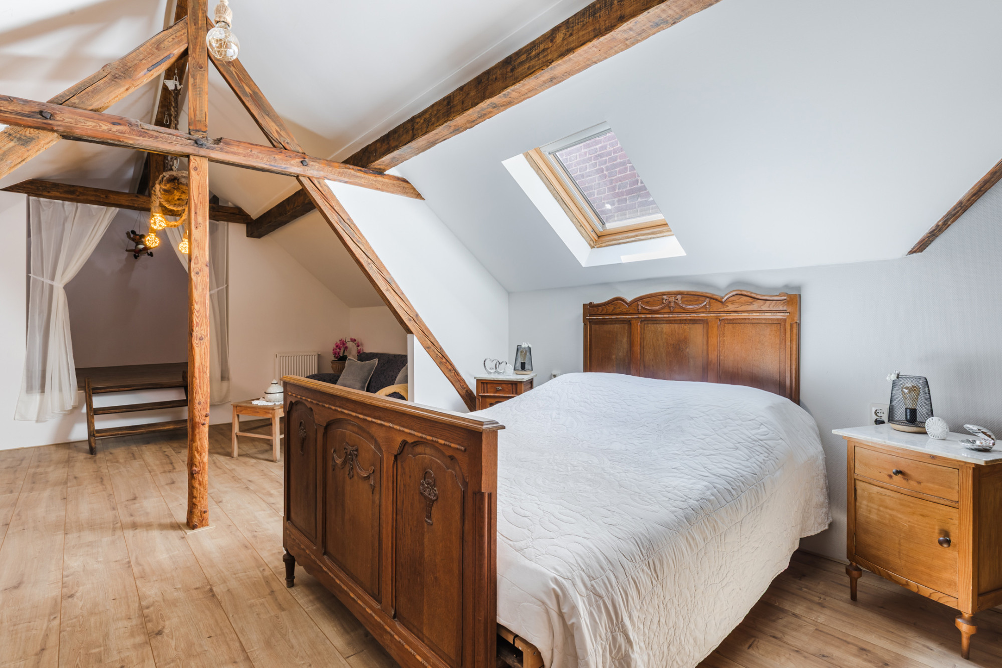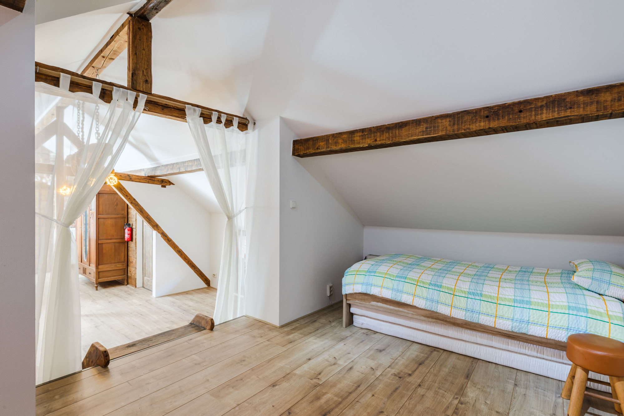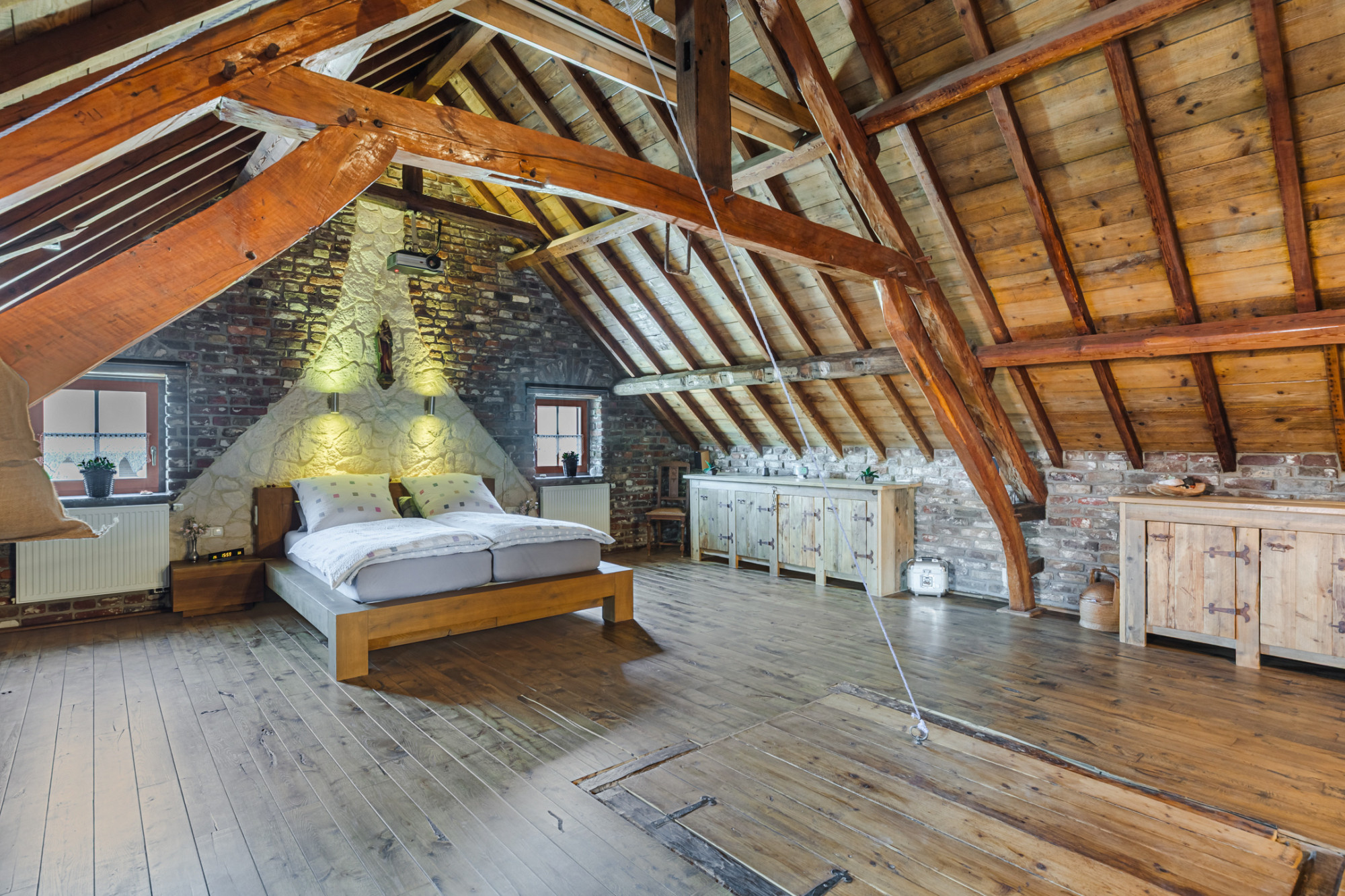 Im Obergeschoss befindet sich ein romantisches Schlafzimmer mit sichtbaren Holzbalken und Gebälk. Das Badezimmer ist liebevoll gestaltet mit Holzelementen, Naturstein und Mosaikfliesen.