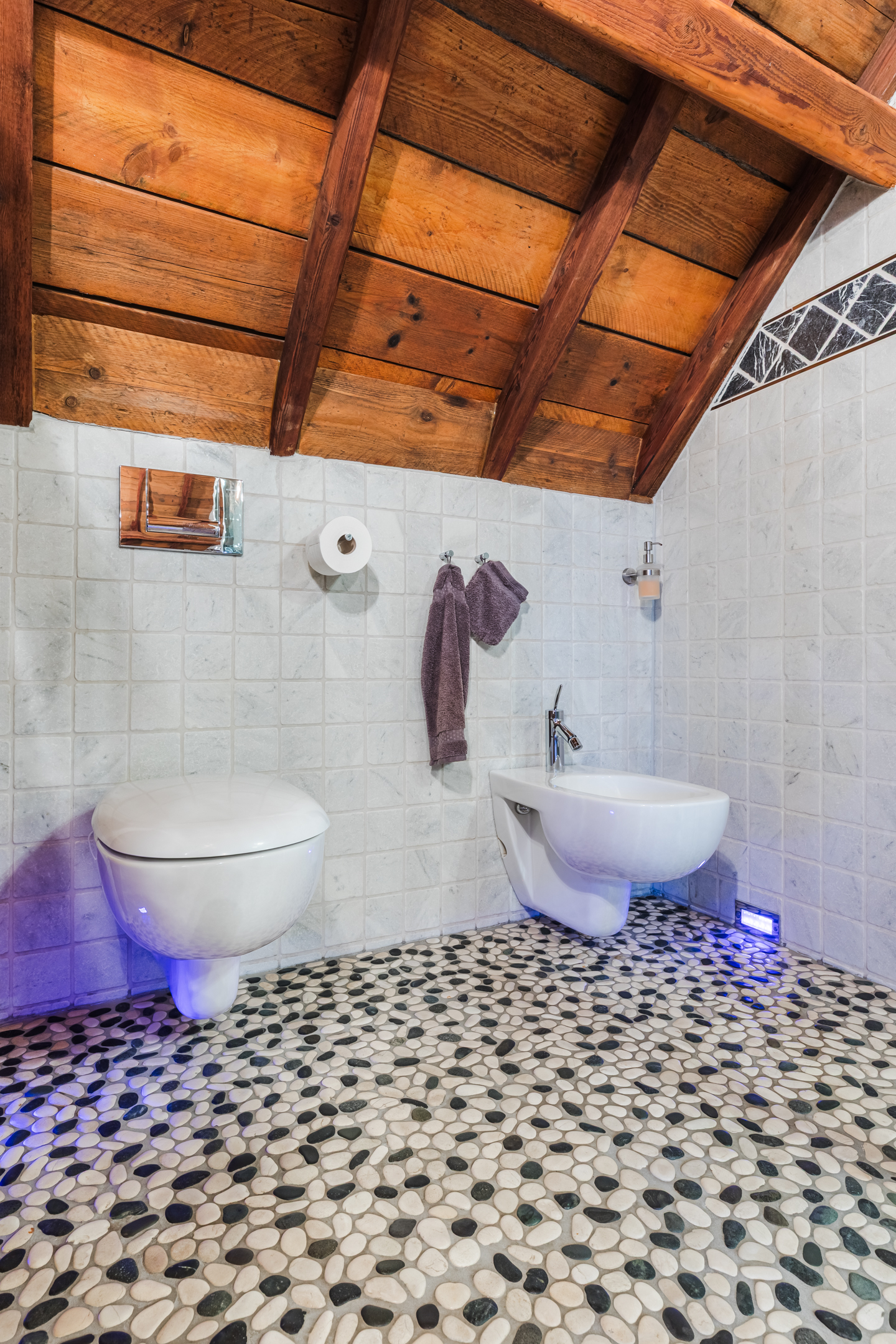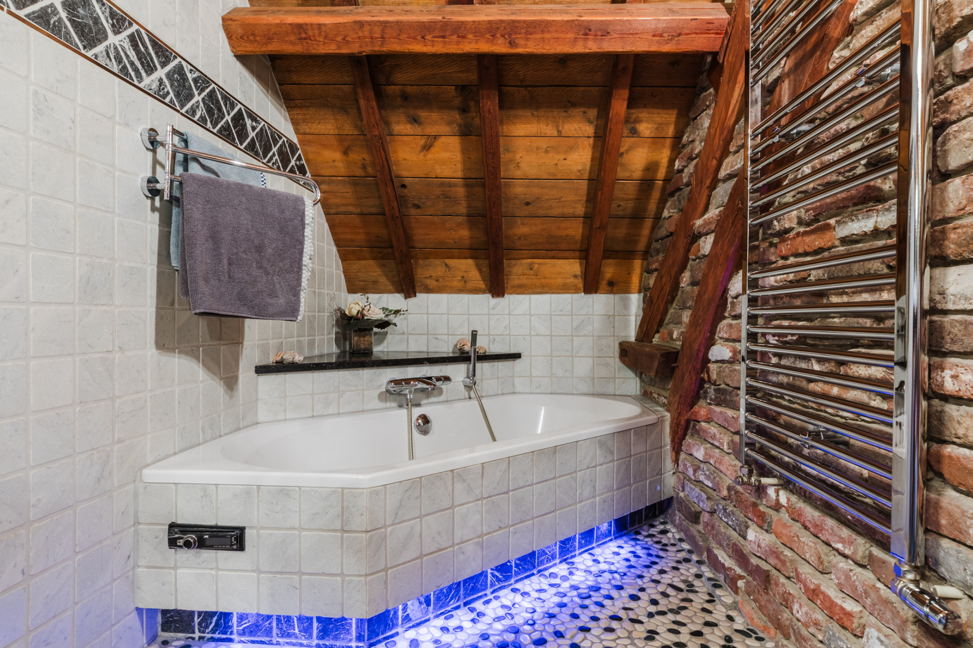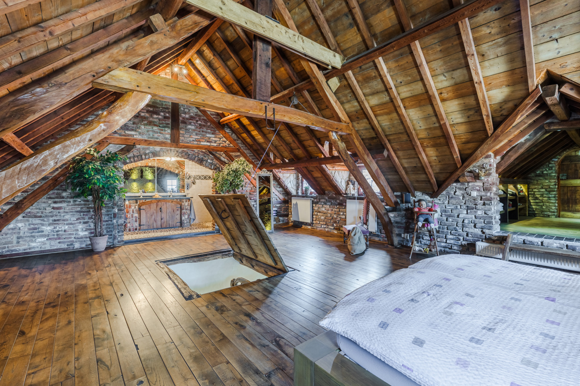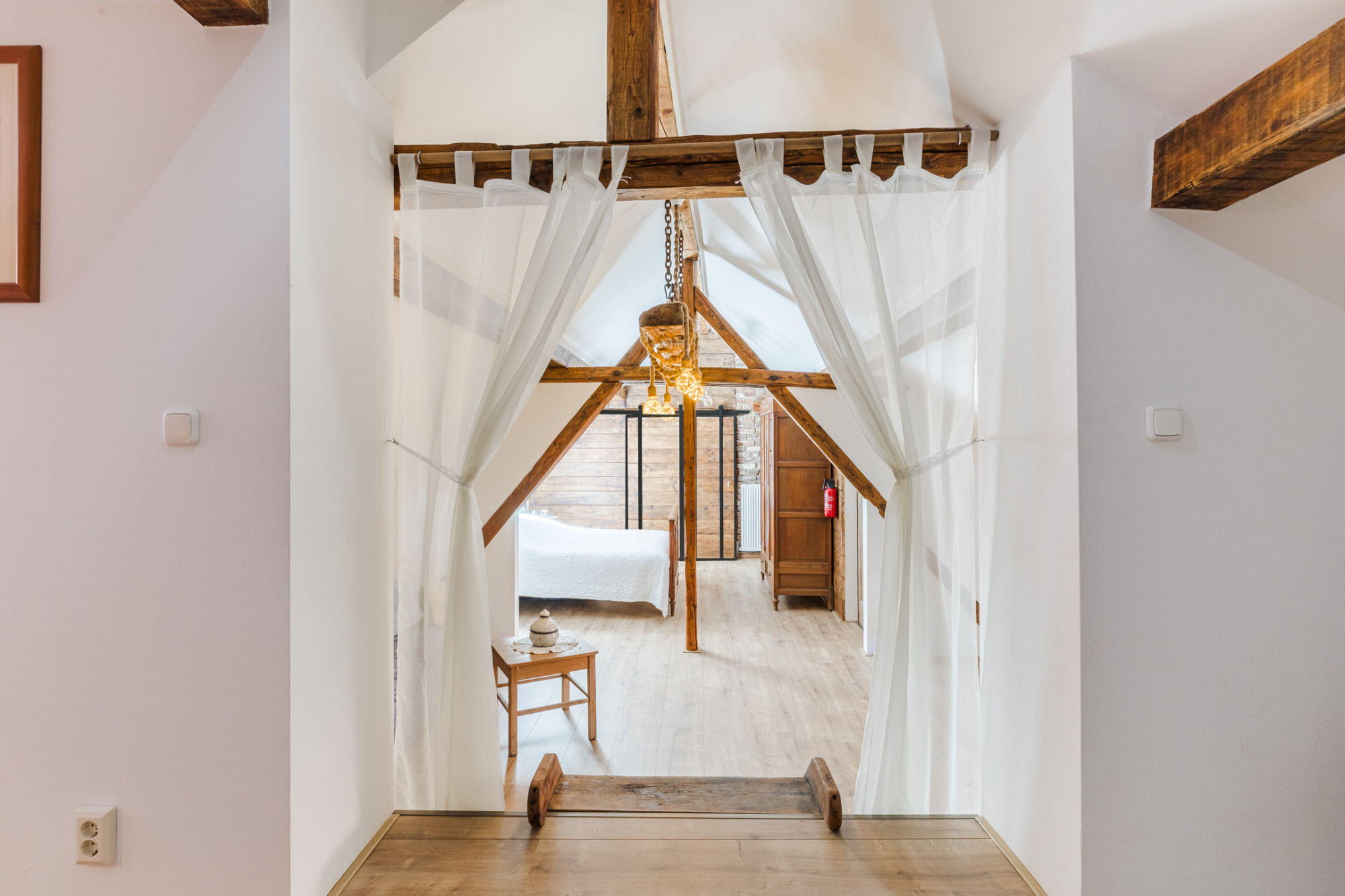 Im Obergeschoss befindet sich ein romantisches Schlafzimmer mit sichtbaren Holzbalken und Gebälk. Das Badezimmer ist liebevoll gestaltet mit Holzelementen, Naturstein und Mosaikfliesen.
