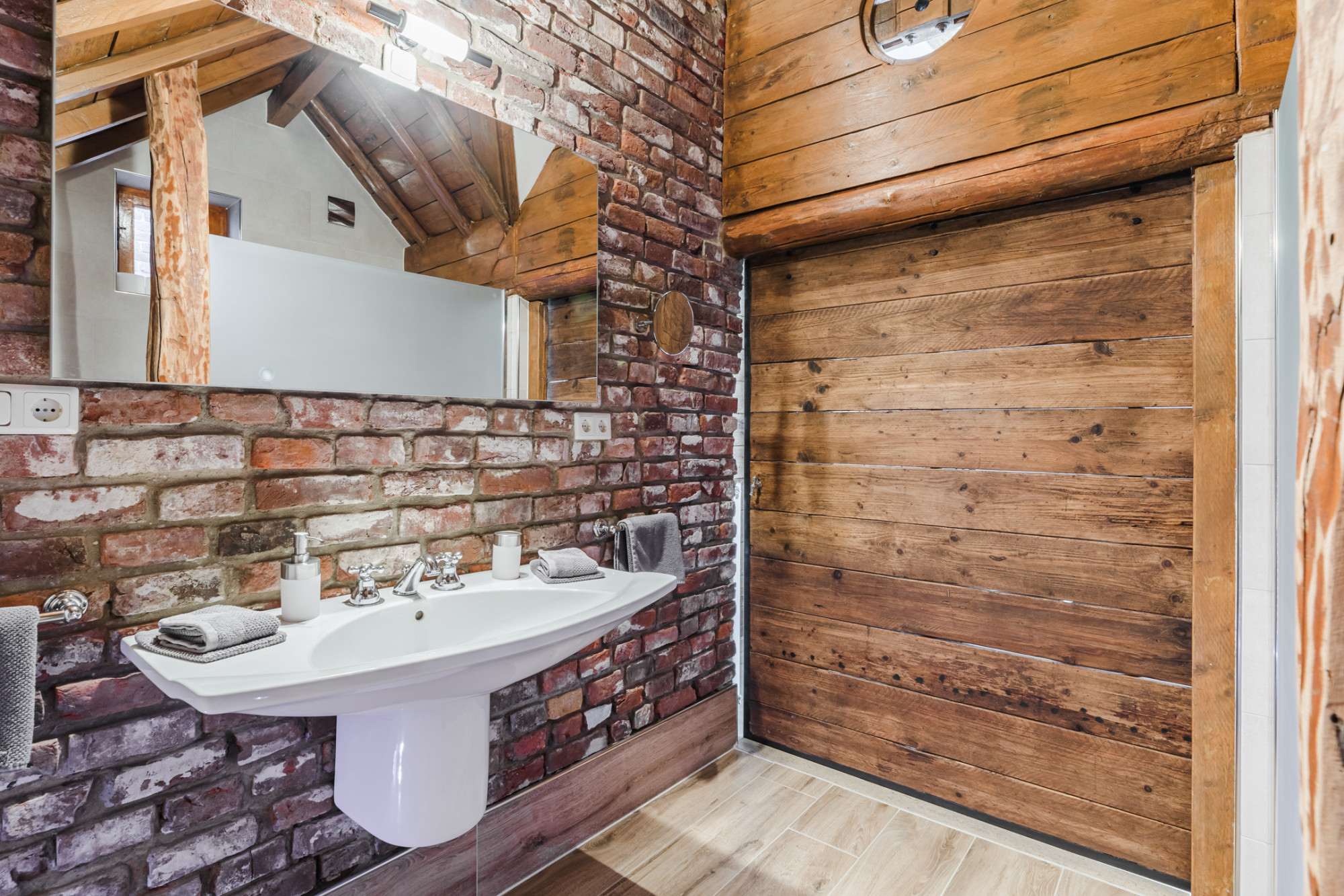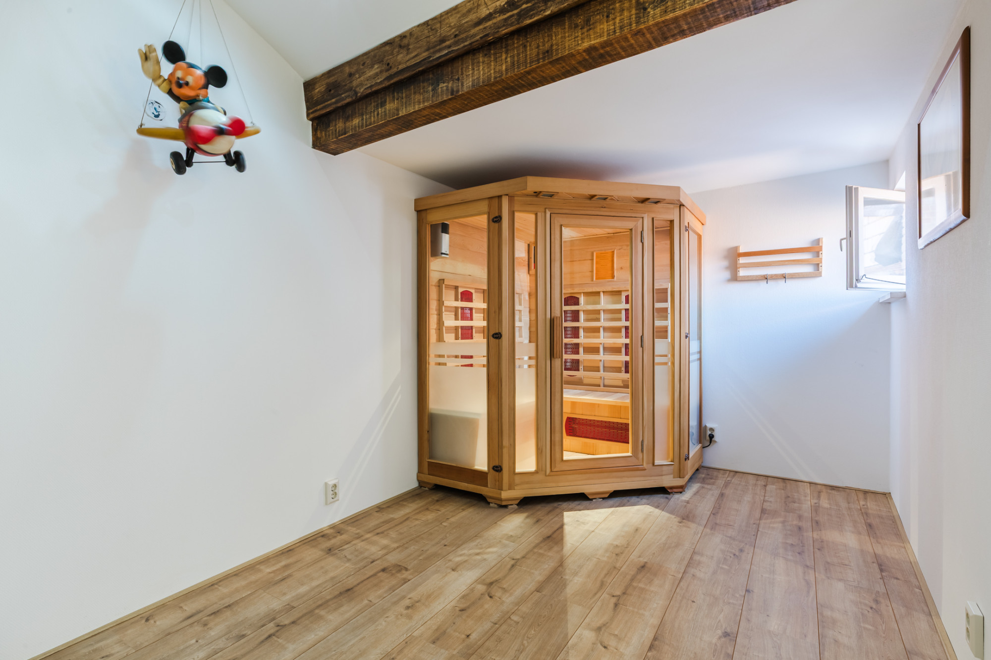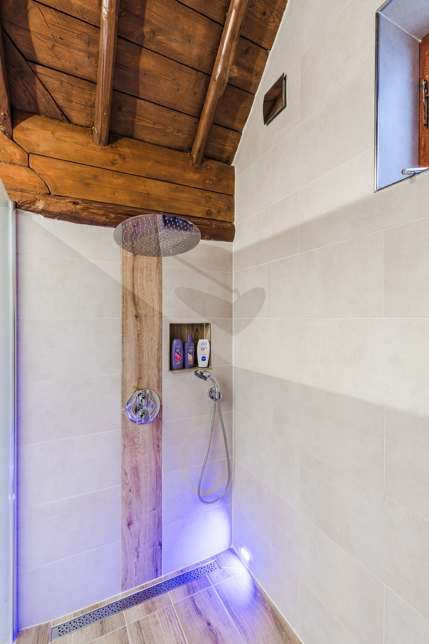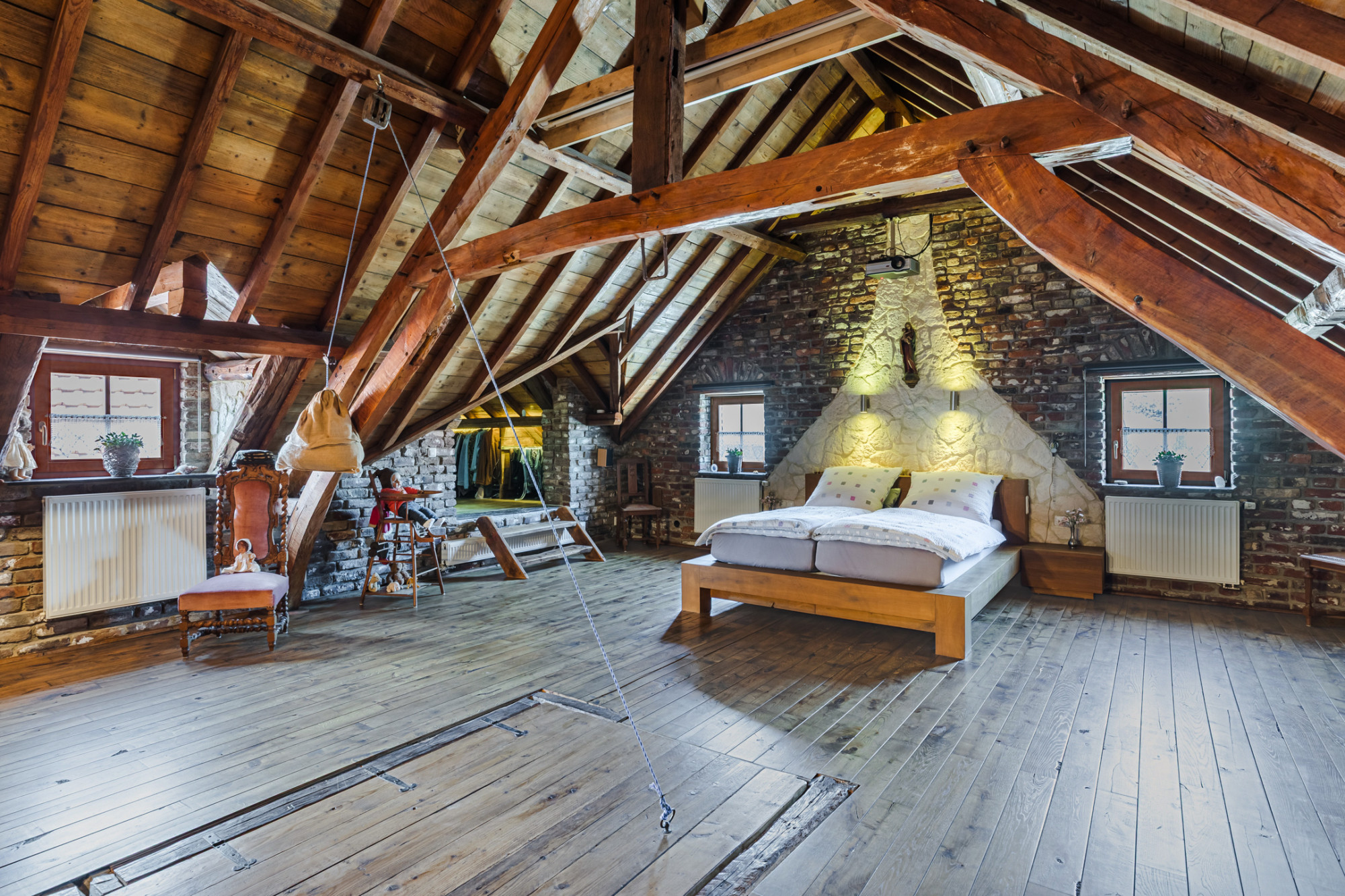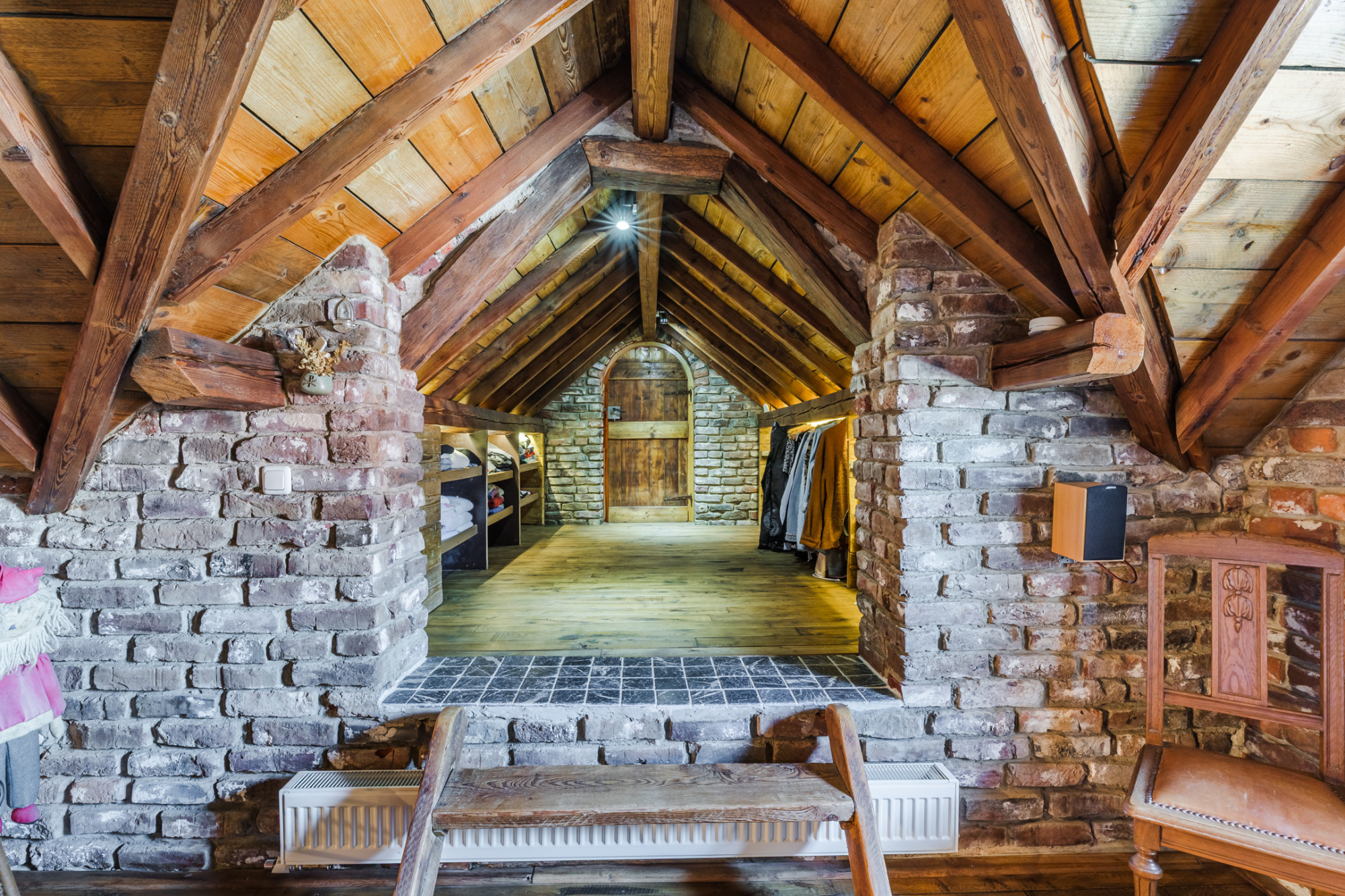 Im Obergeschoss befindet sich ein romantisches Schlafzimmer mit sichtbaren Holzbalken und Gebälk. Das Badezimmer ist liebevoll gestaltet mit Holzelementen, Naturstein und Mosaikfliesen.