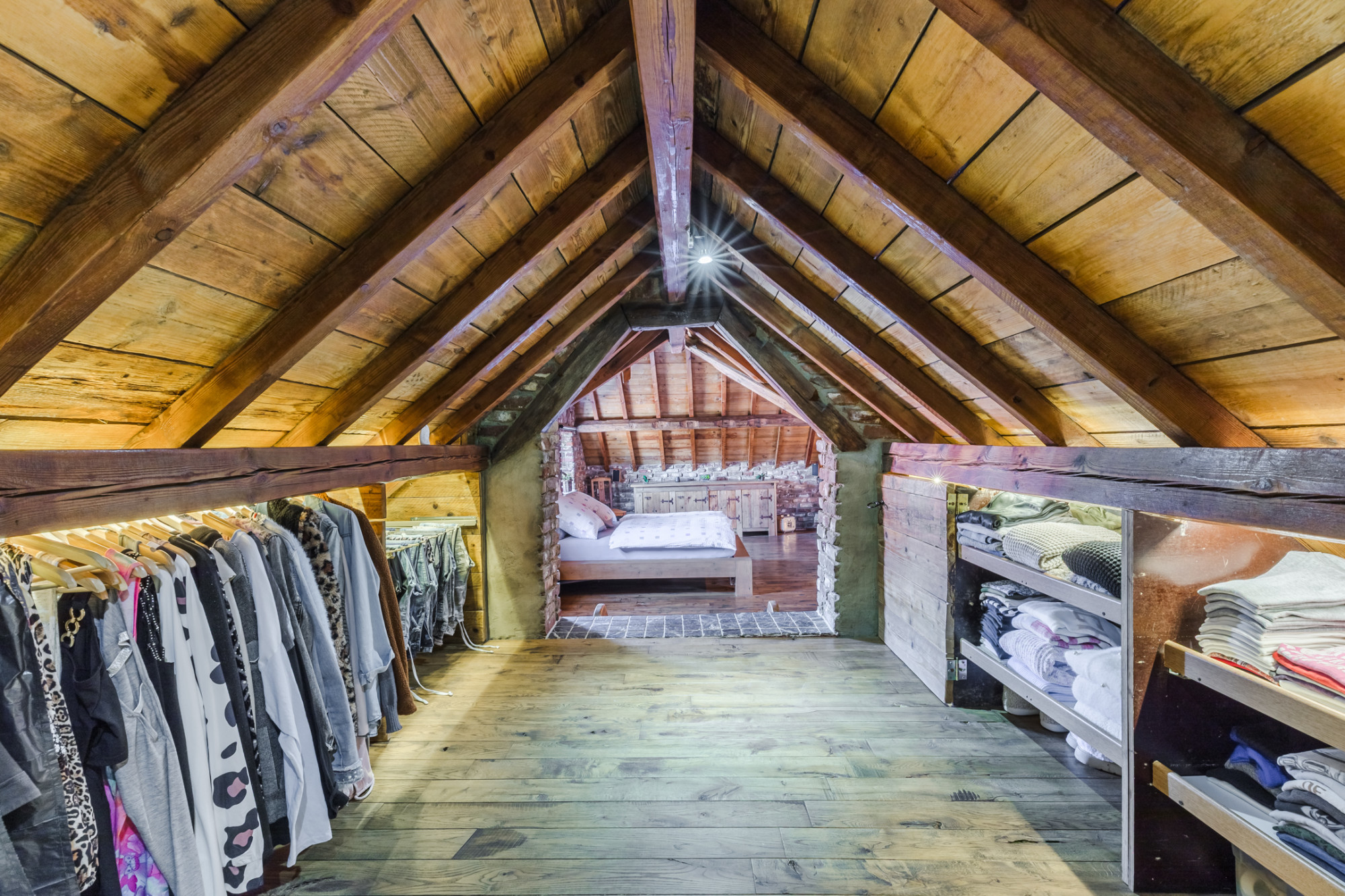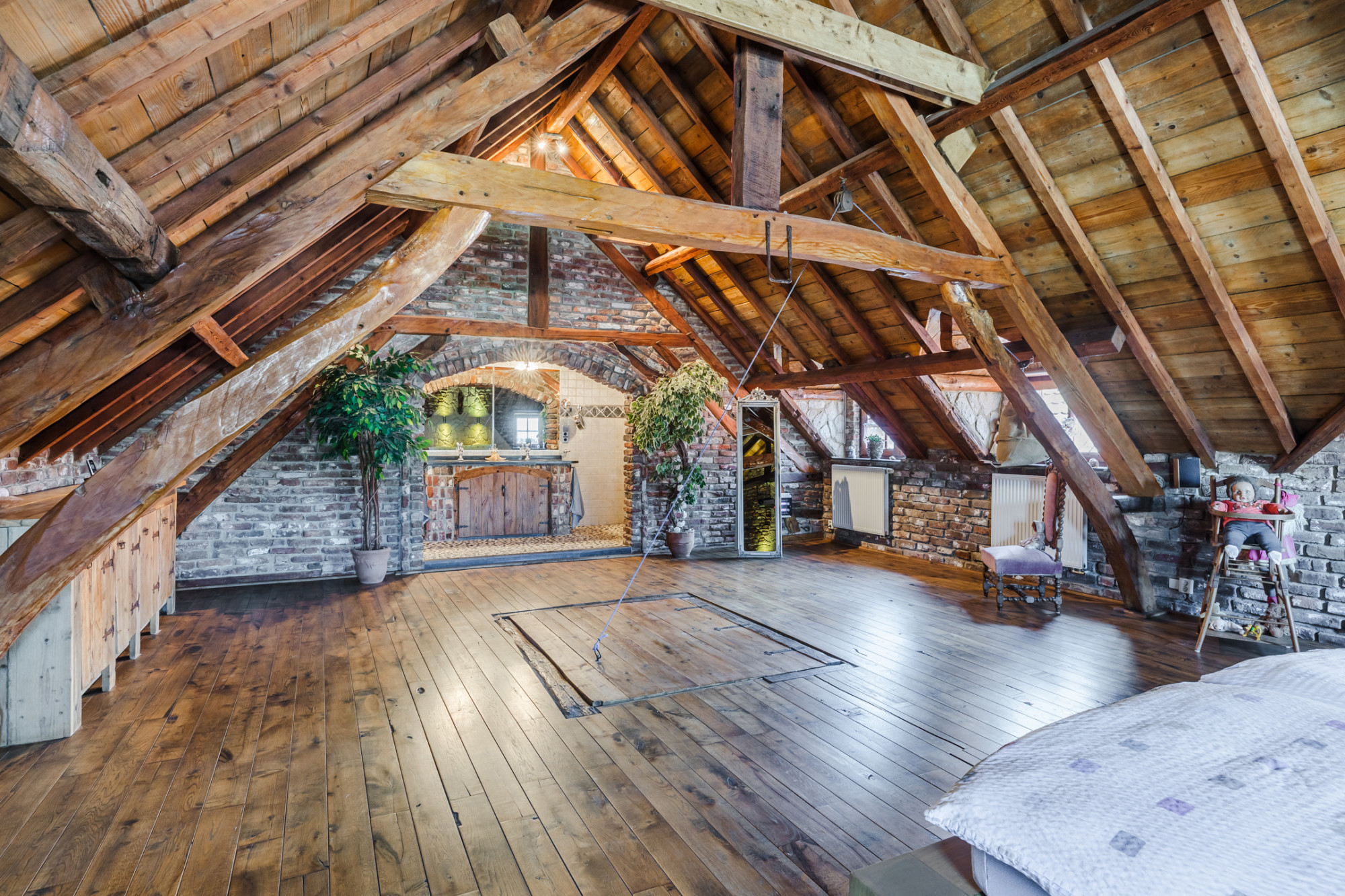 Sehr großzügiges Schlafzimmer mit Holzböden, Klimaanlage, offenem Dachstuhl, Dachgauben und sichtbarer Holzkonstruktion.