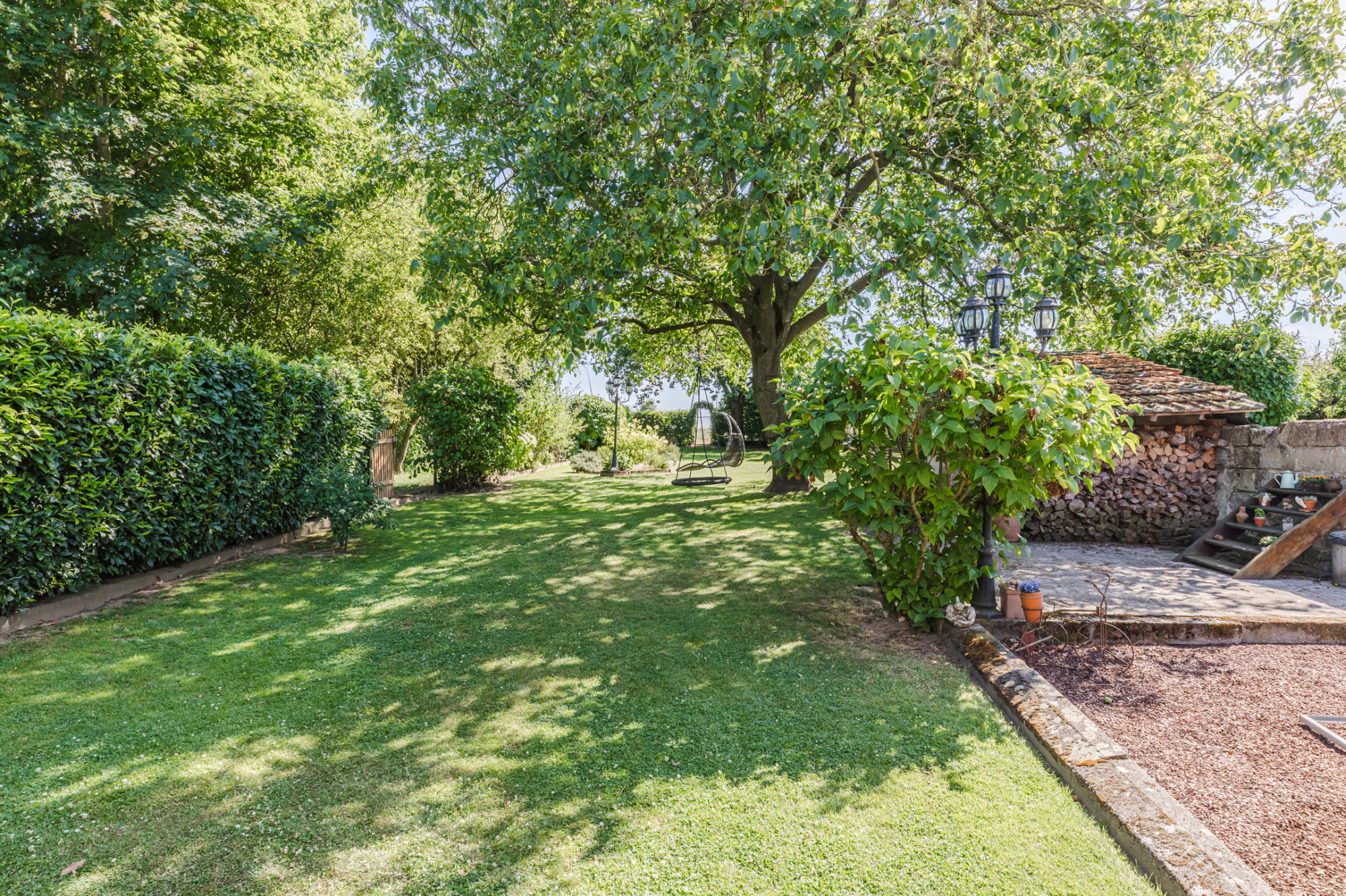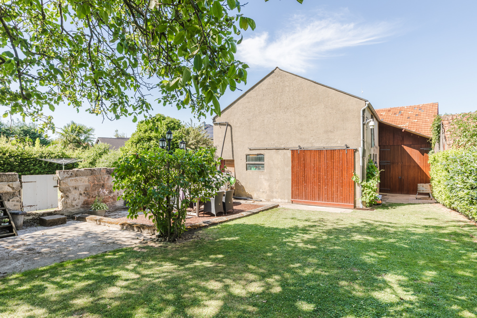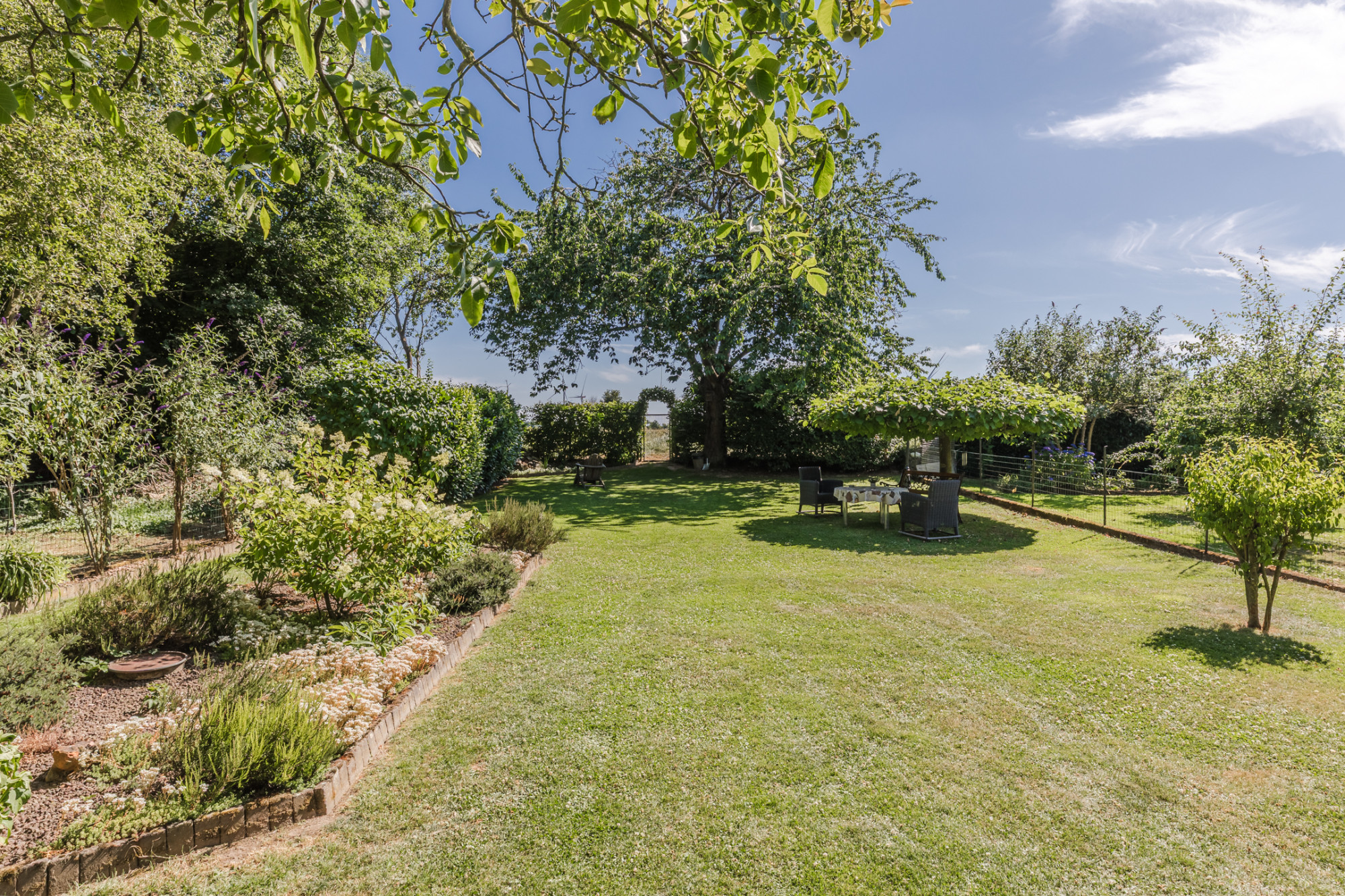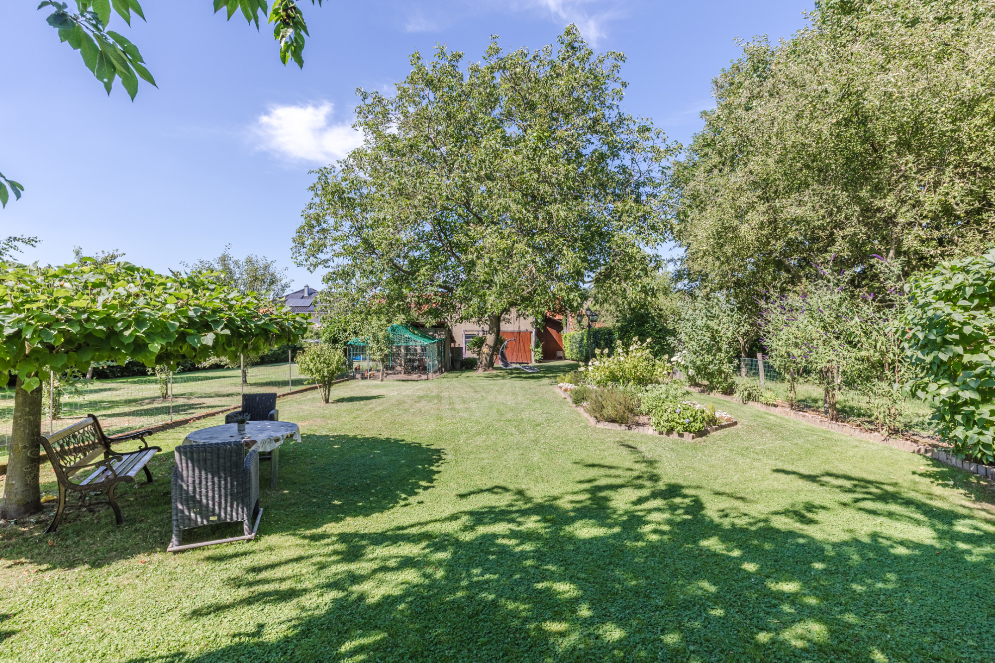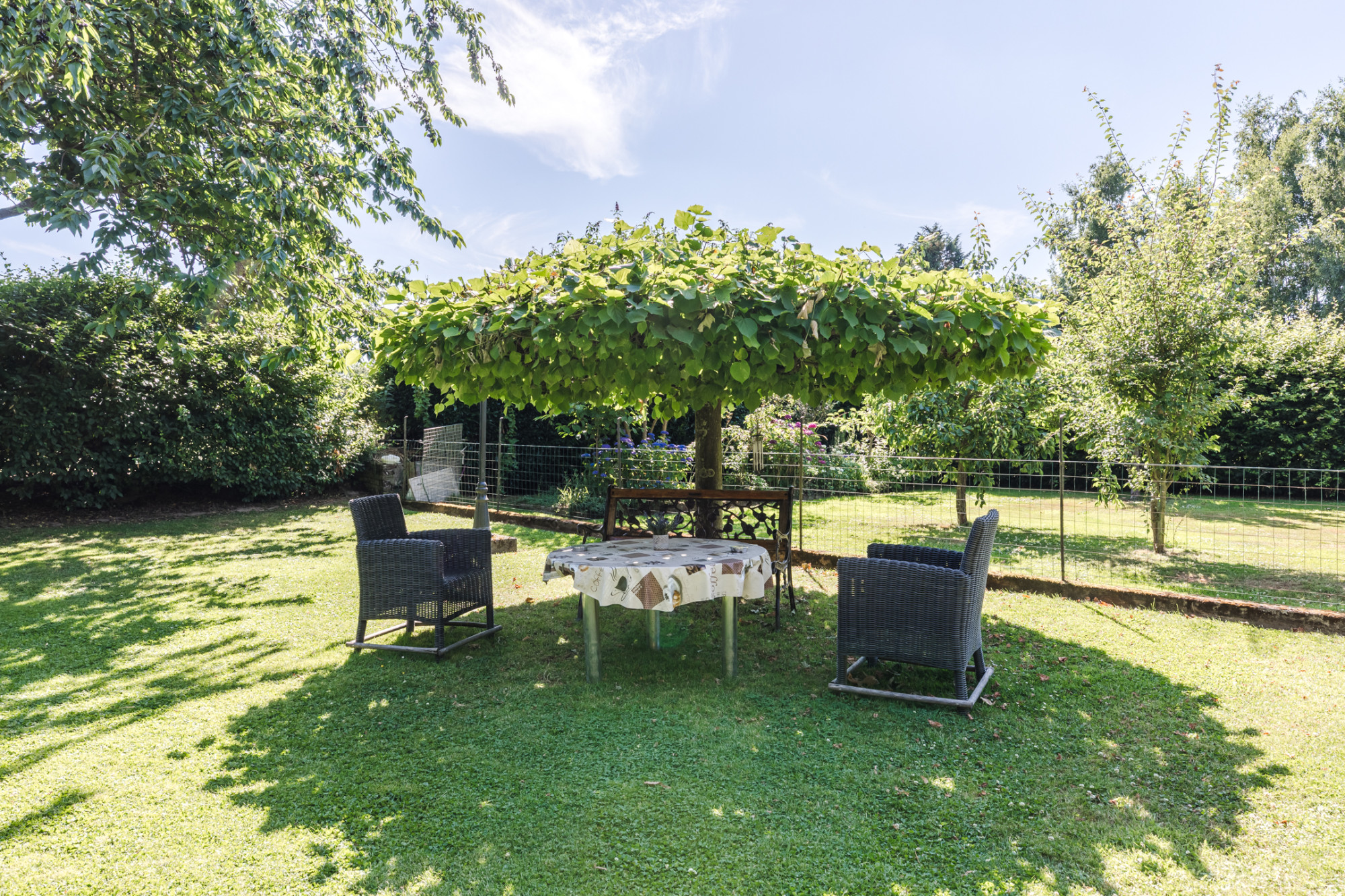 Hintergarten mit Bauerngartencharakter, Bäumen, Hecken, Sträuchern, Blumenbeeten, überdachtem Holzlager und Terrasse – zugänglich über die Scheune.
