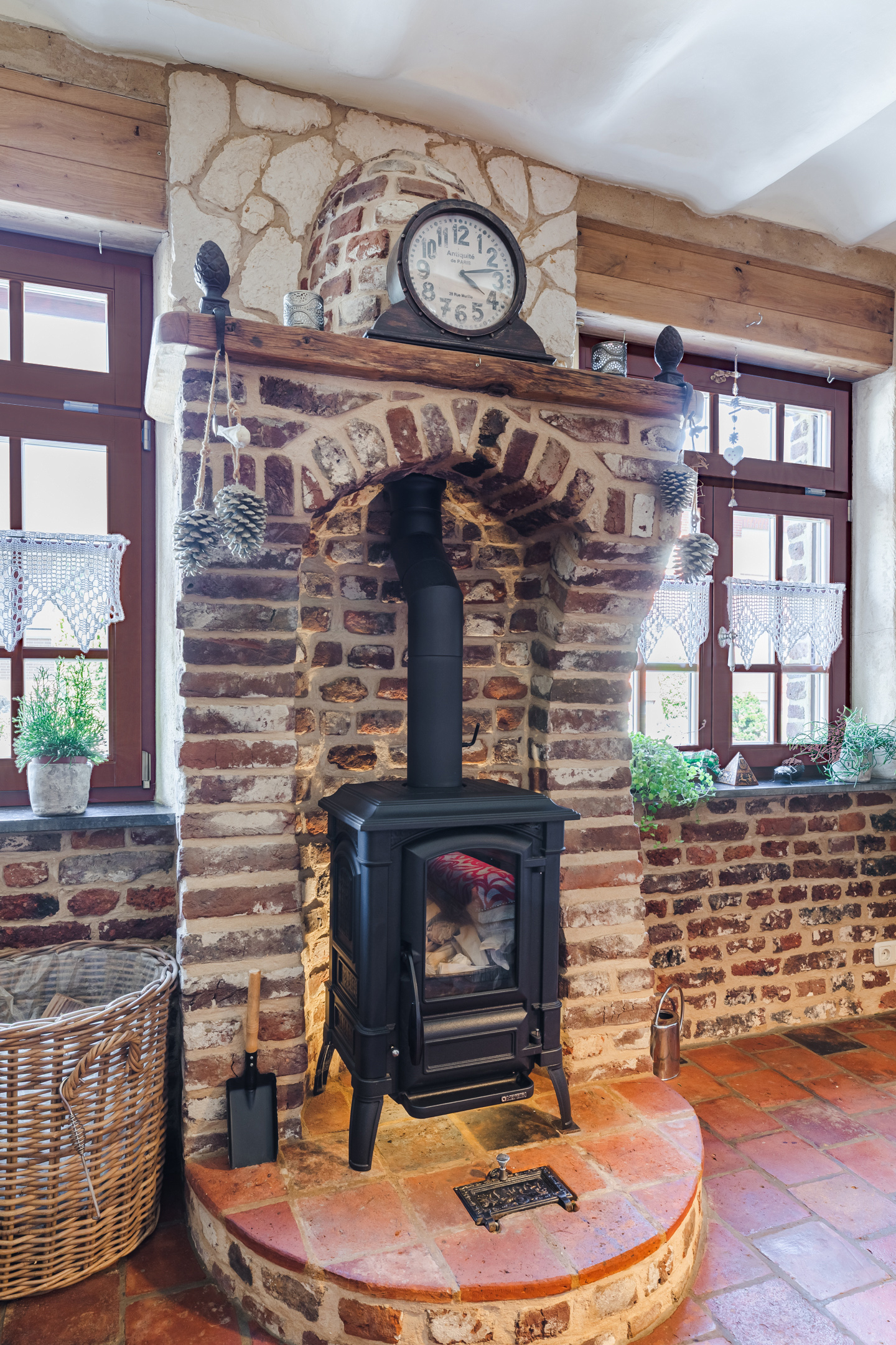 Wohnzimmer mit Terrakottaboden und Kamin mit Holzofen.