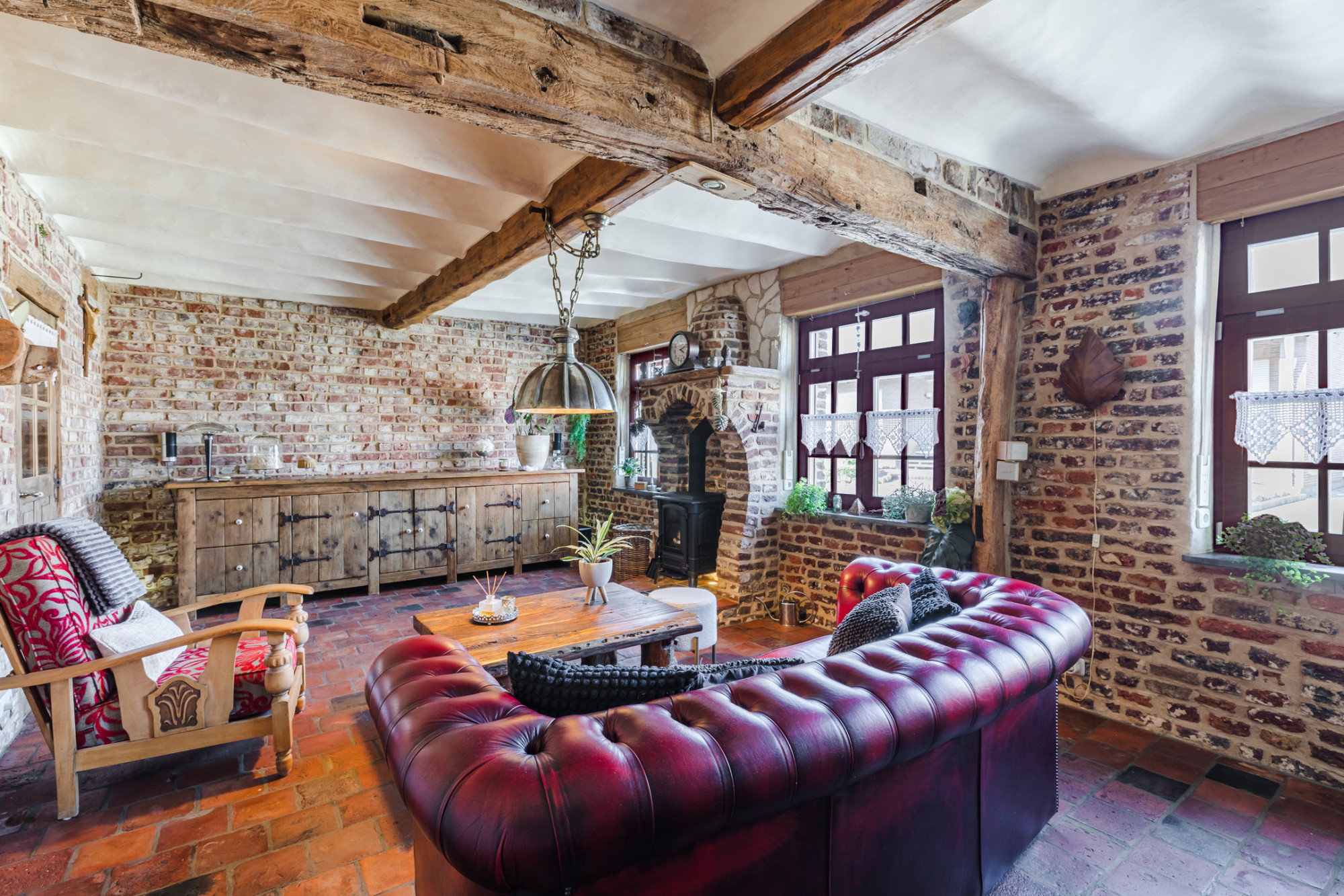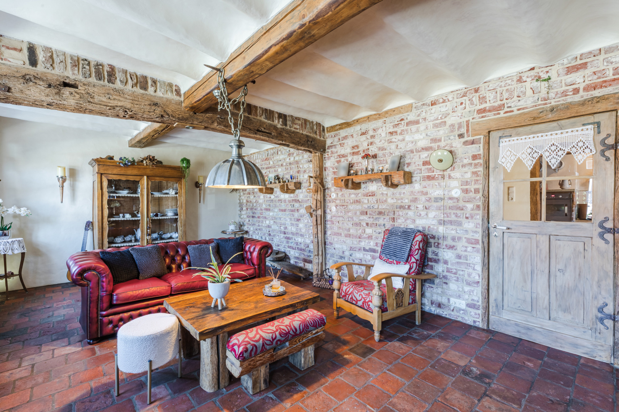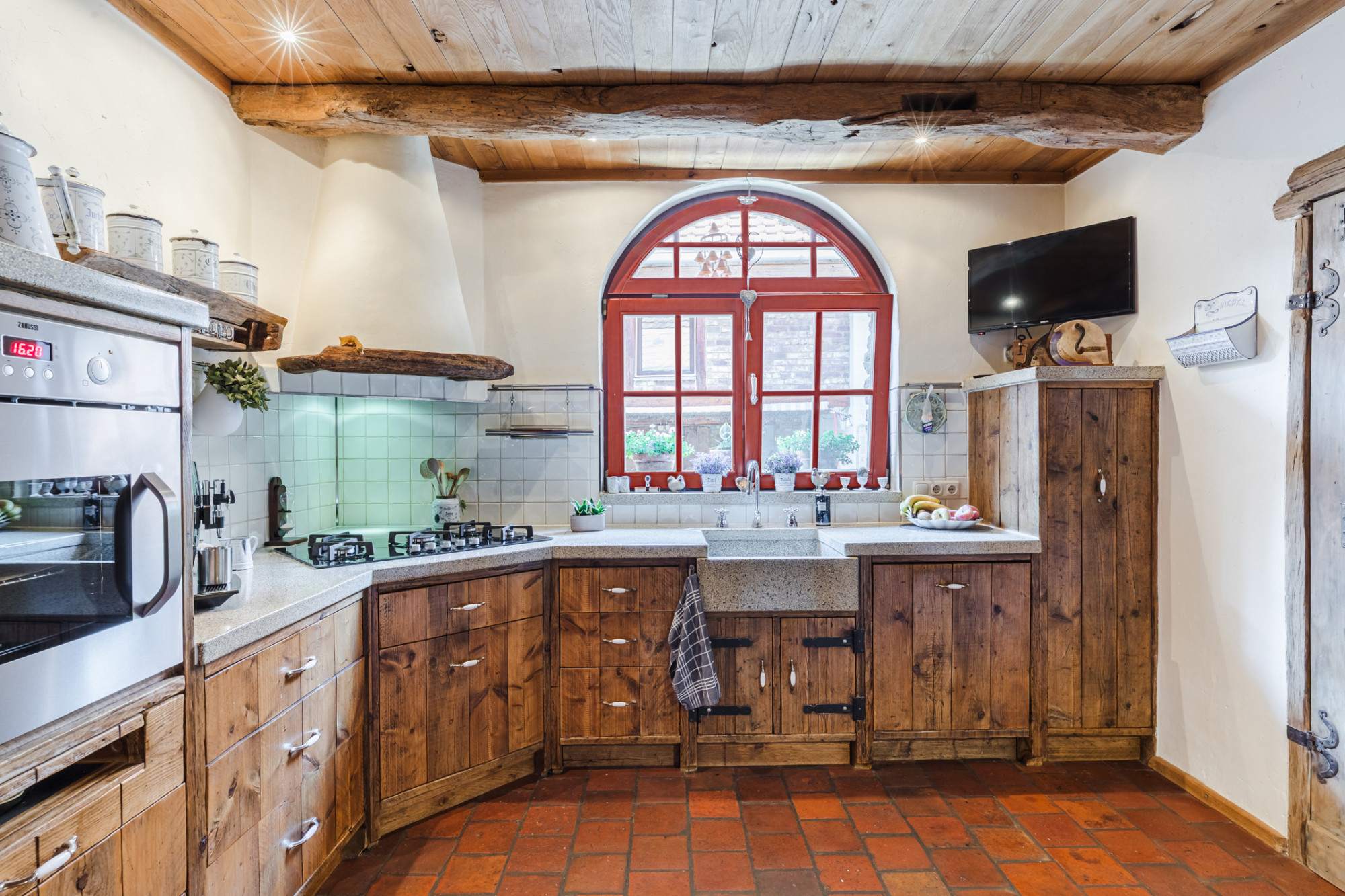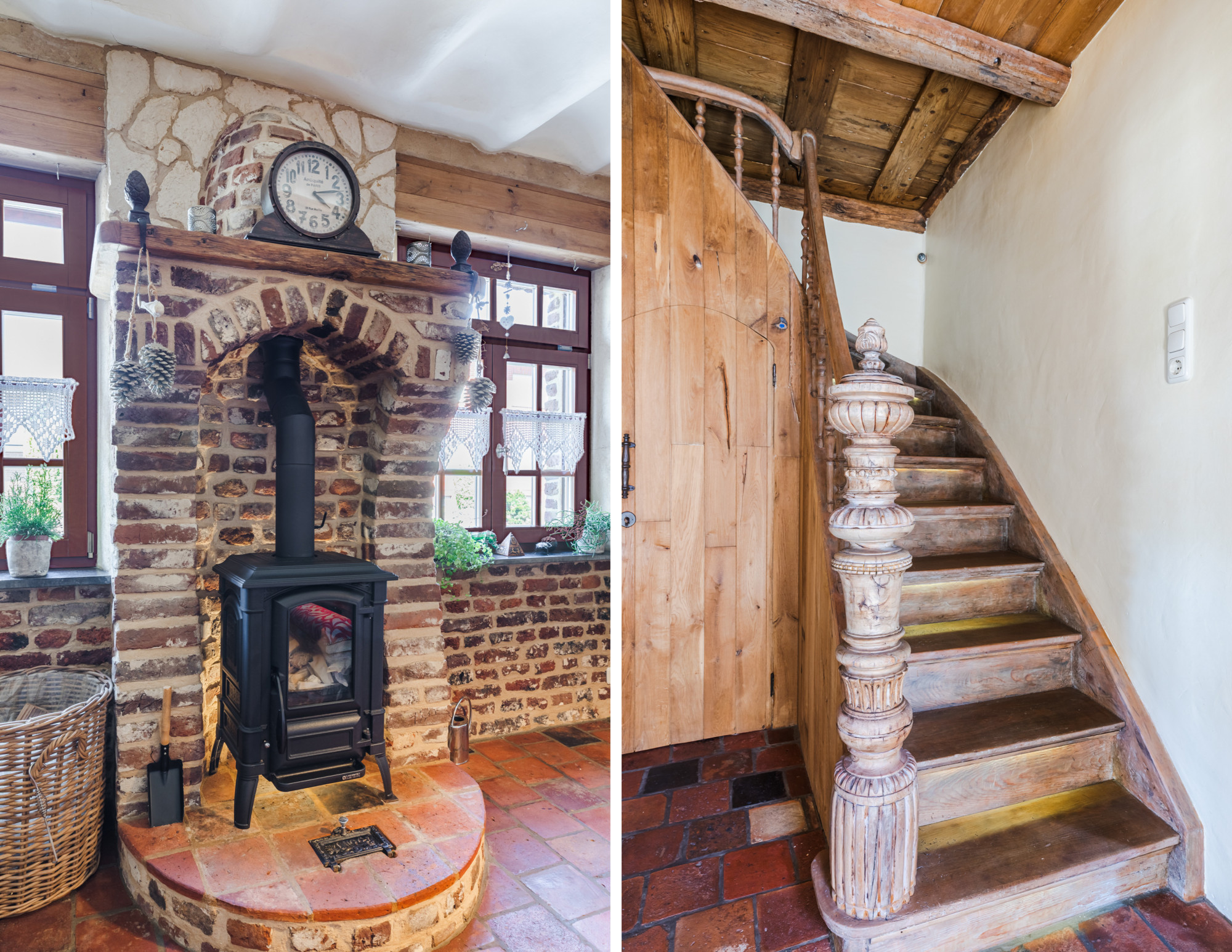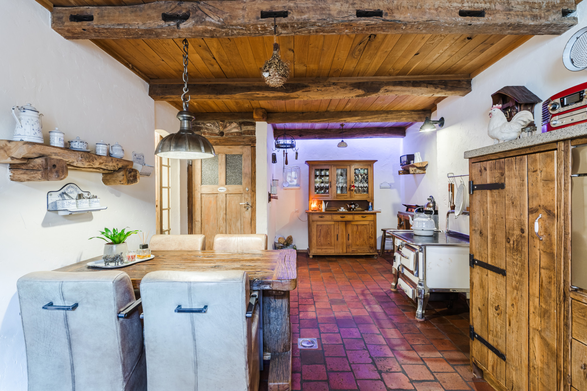 Im Inneren erwartet Sie eine großzügige Wohnküche sowie ein gemütliches Wohnzimmer mit Terrakottaboden, Holzofen und Fußbodenheizung. Im gesamten Haus wurden antike Baumaterialien und authentische Details verwendet, was für eine warme und einzigartige Ausstrahlung sorgt.