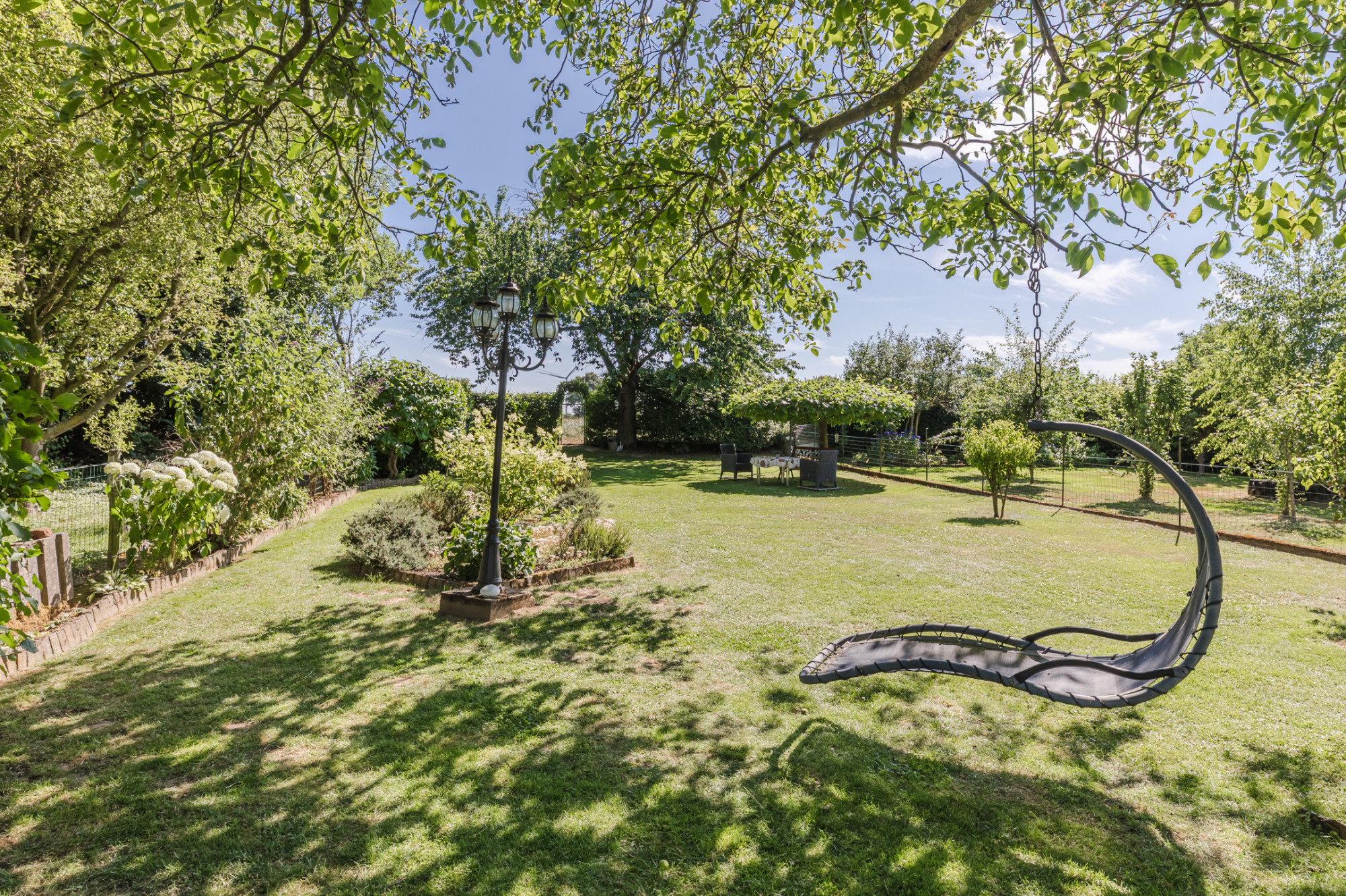 Der Außenbereich bietet einen wunderschönen Bauerngarten mit alten Bäumen, mehreren Sitzplätzen und einer idyllischen Schaukel unter einem großen Baum. Der hintere Teil des Grundstücks darf als Weide genutzt werden (aktuell noch Ackerland), auf dem ein Pferd gehalten werden darf.*
