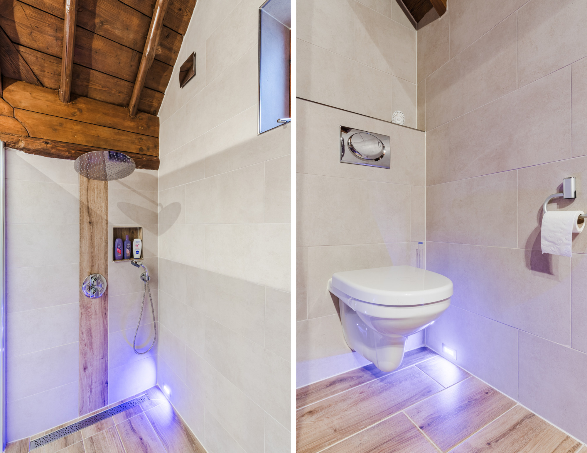 Luxuriöses Badezimmer mit Walk-in-Dusche, Waschbecken und WC.