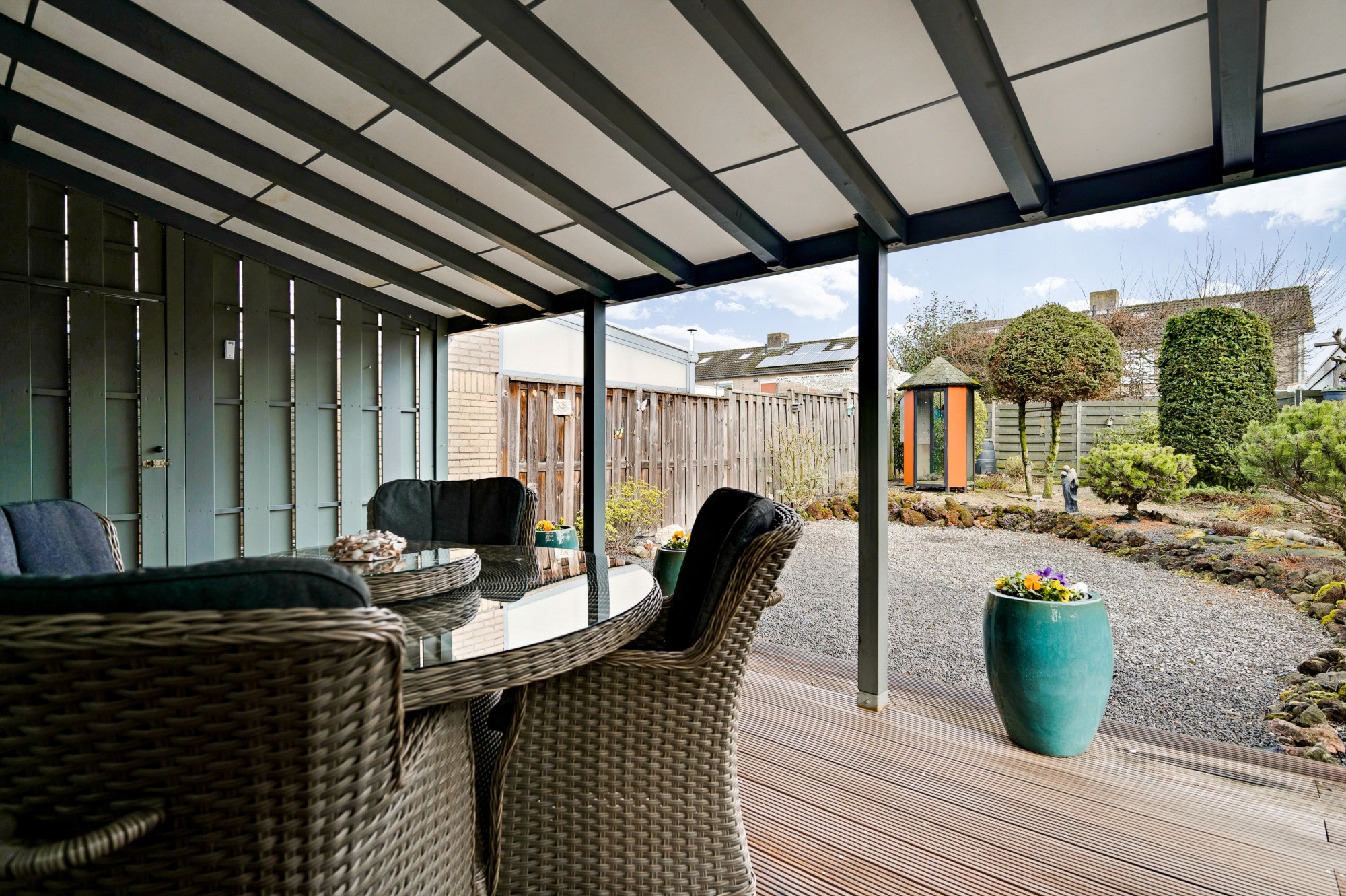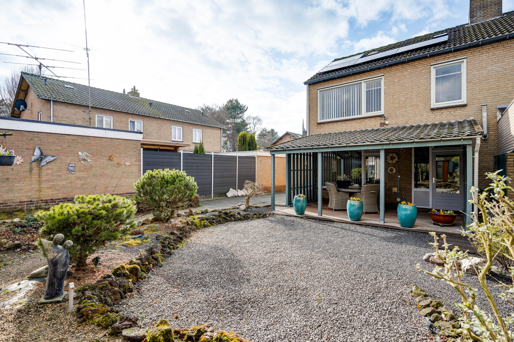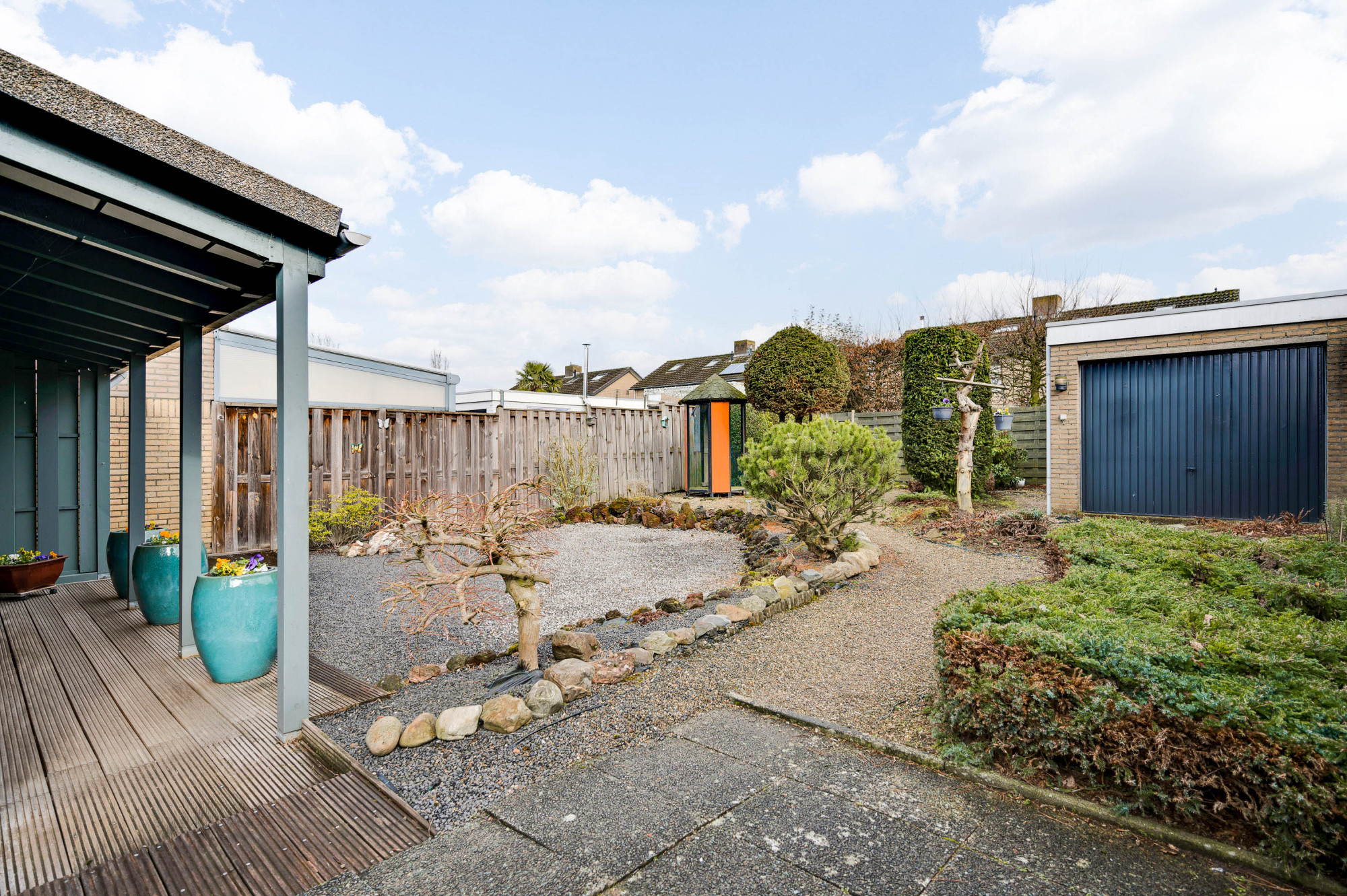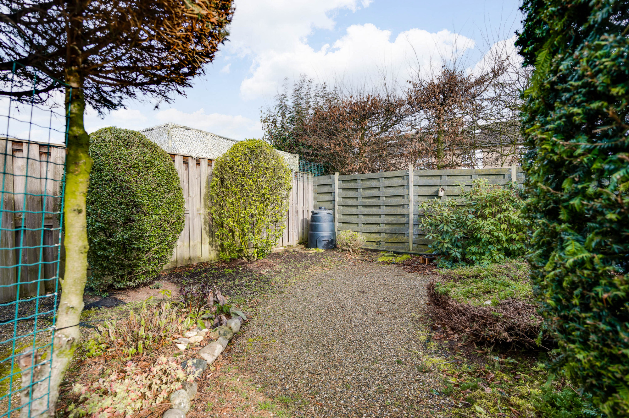 De woning beschikt over een onderhoudsvriendelijke voortuin en een diepe oprit die middels een poort leidt naar de achtertuin. De achtertuin is fraai ingericht met een overkapping met vlonderplanken, bestrating en borders. Hier bevindt zich ook de vrijstaande garage, die plaats biedt voor een auto of extra opslagruimte.