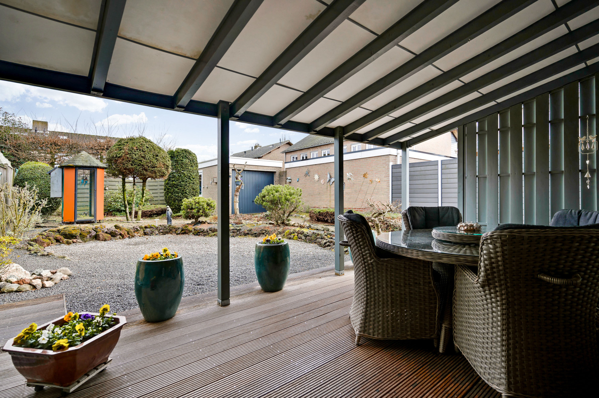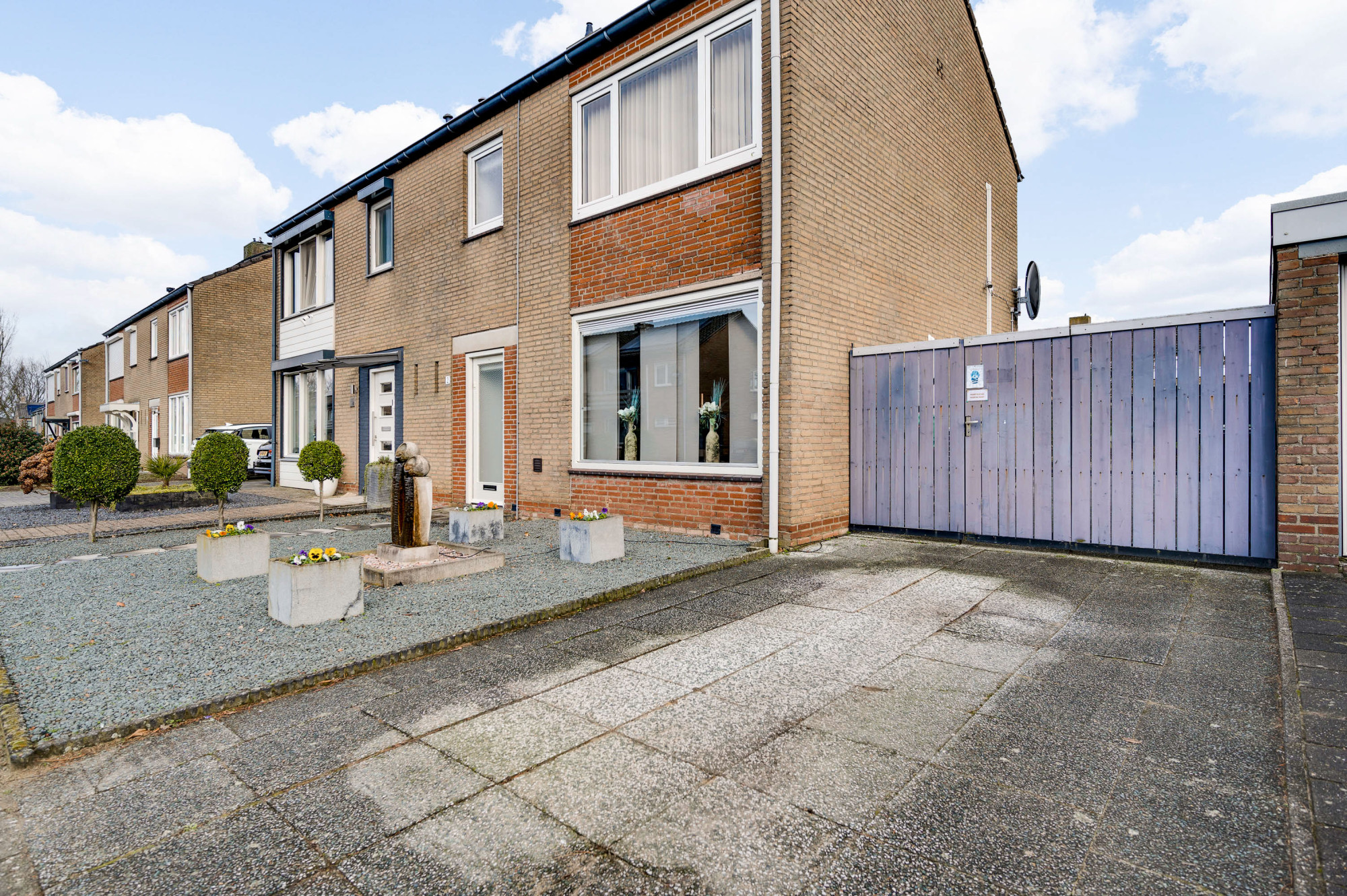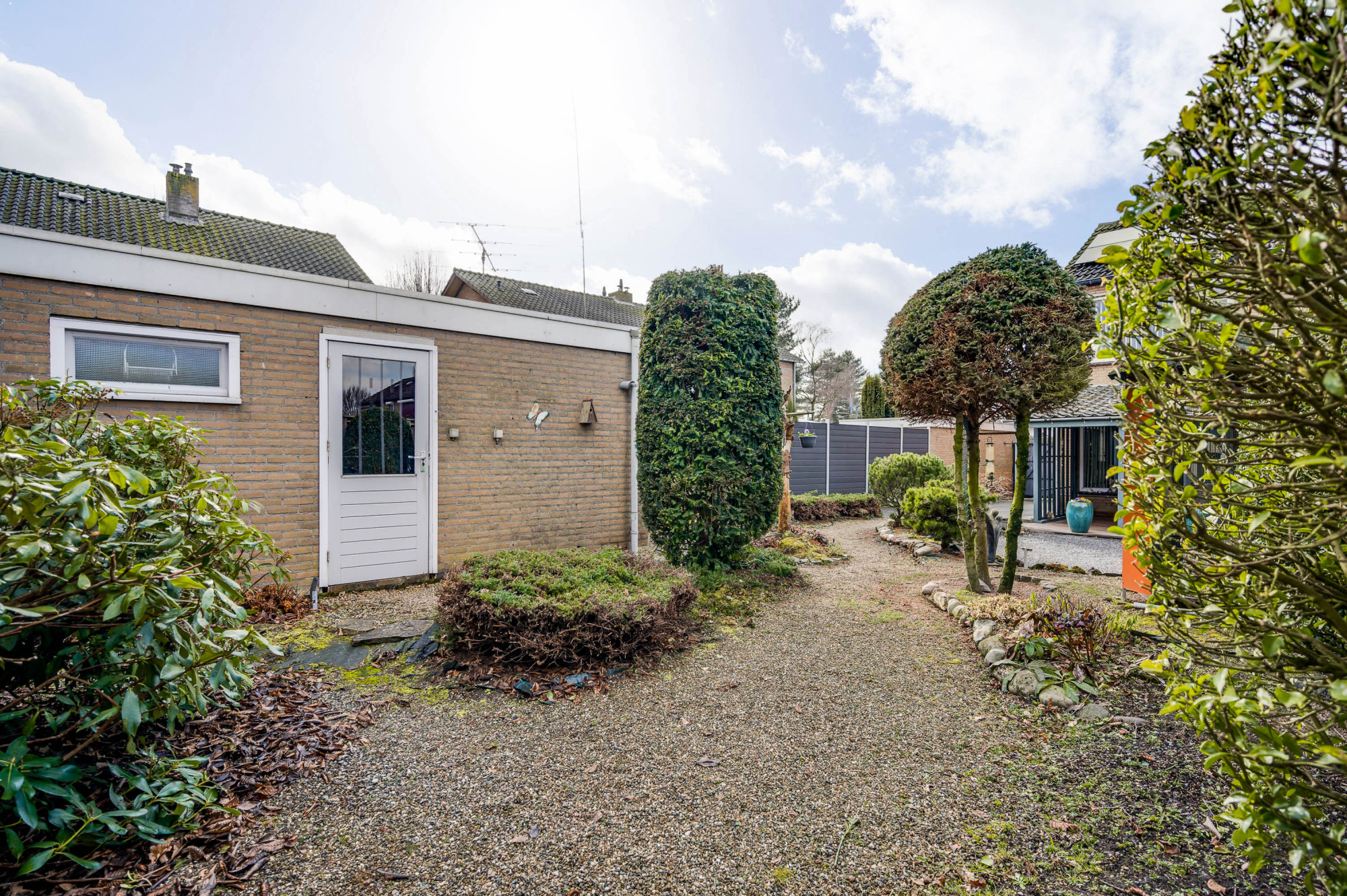 De woning beschikt over een onderhoudsvriendelijke voortuin en een diepe oprit die middels een poort leidt naar de achtertuin. De achtertuin is fraai ingericht met een overkapping met vlonderplanken, bestrating en borders. Hier bevindt zich ook de vrijstaande garage, die plaats biedt voor een auto of extra opslagruimte.