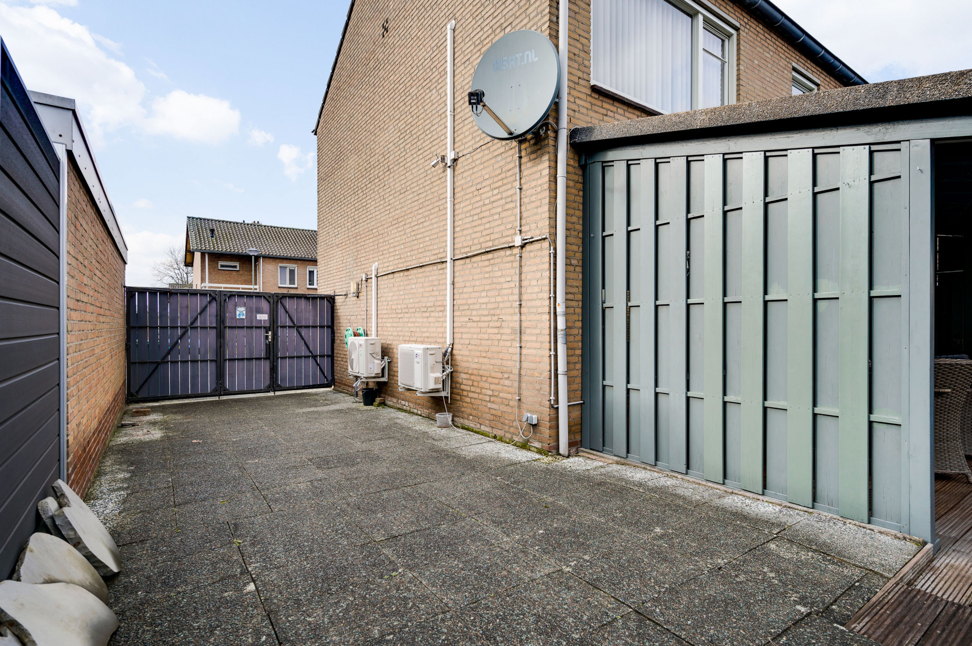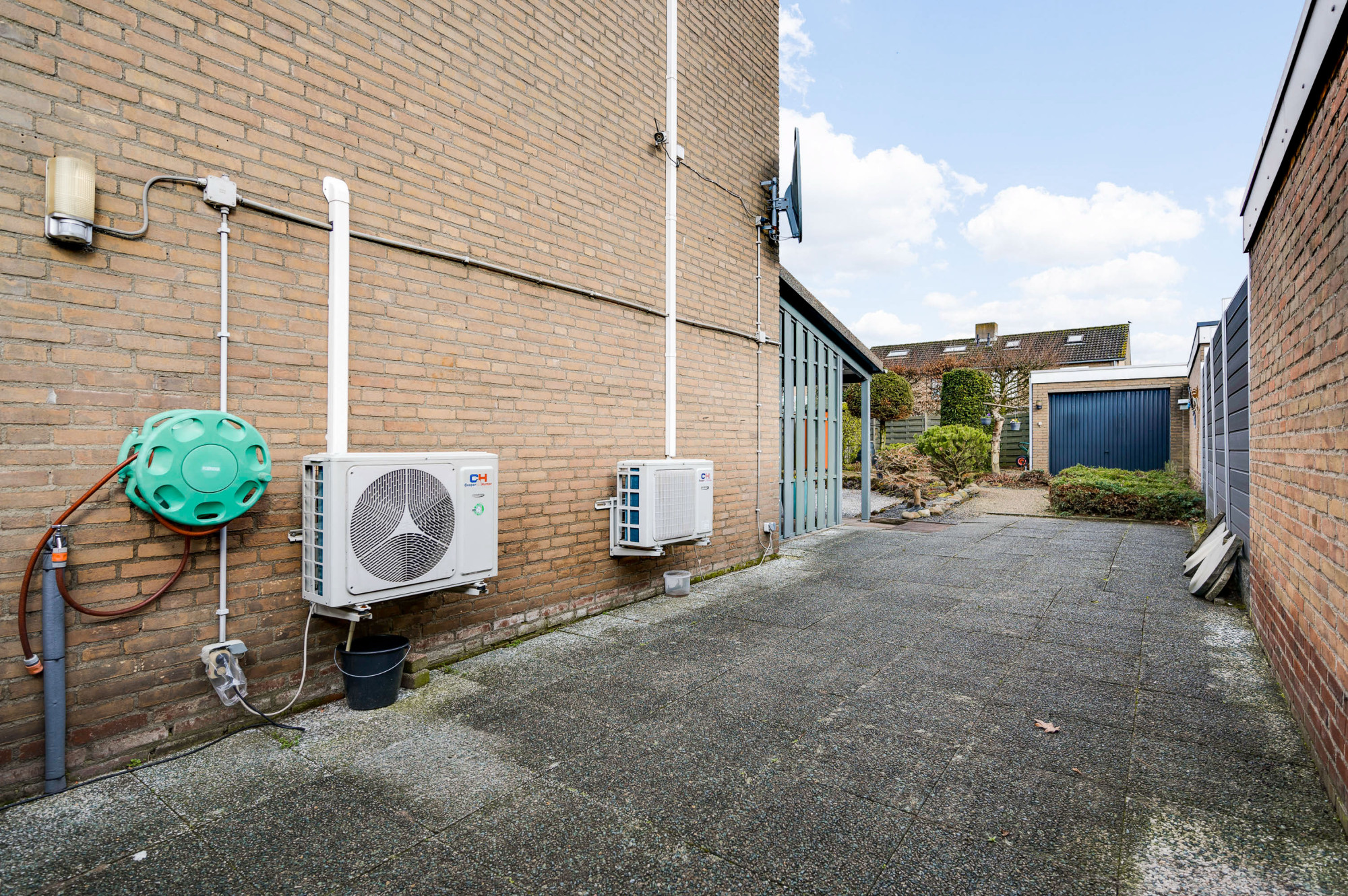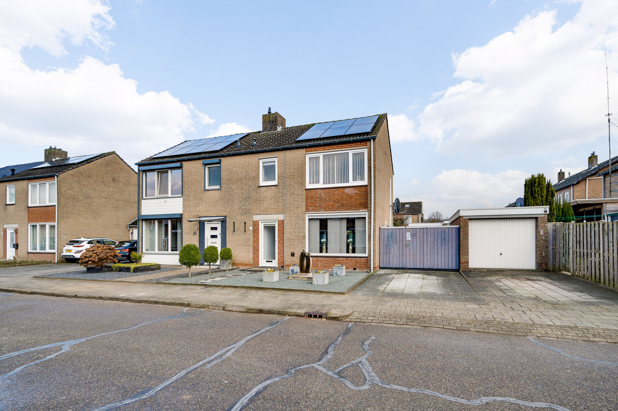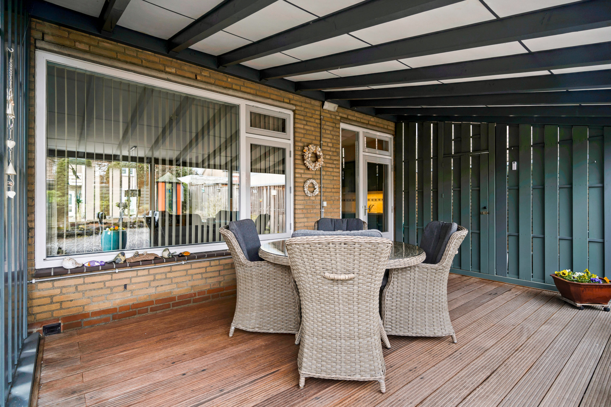 De woning beschikt over een onderhoudsvriendelijke voortuin en een diepe oprit die middels een poort leidt naar de achtertuin. De achtertuin is fraai ingericht met een overkapping met vlonderplanken, bestrating en borders. Hier bevindt zich ook de vrijstaande garage, die plaats biedt voor een auto of extra opslagruimte.