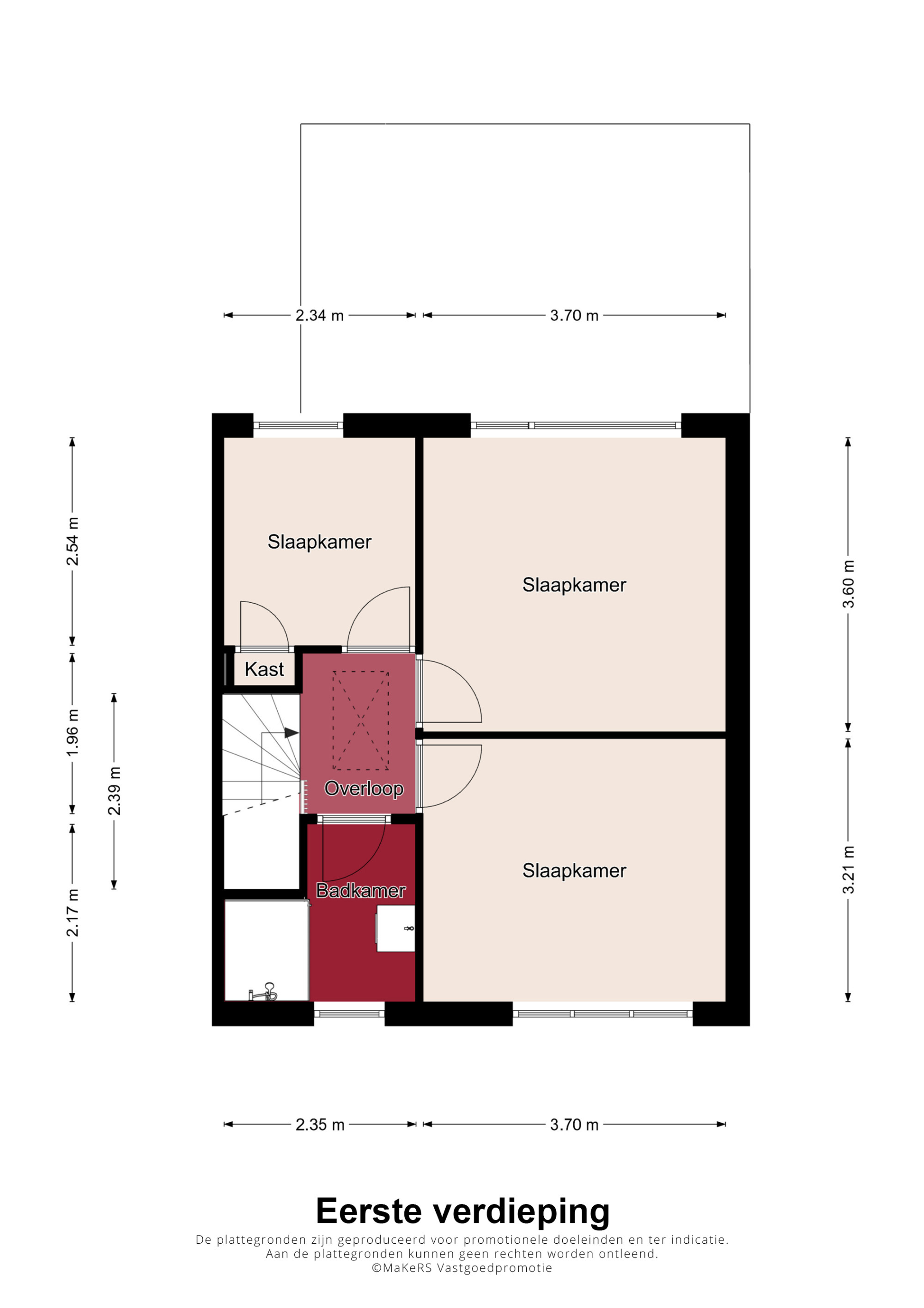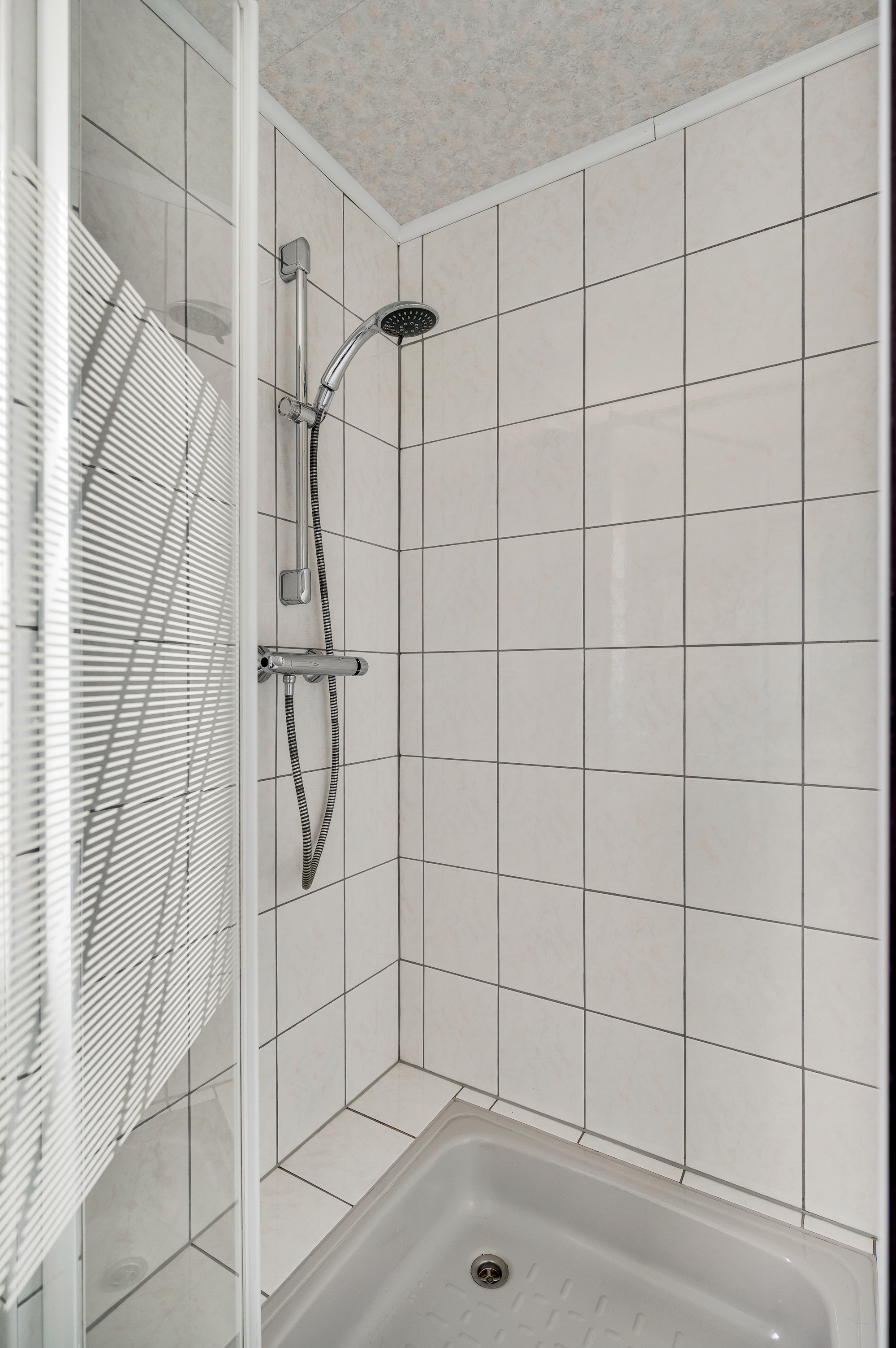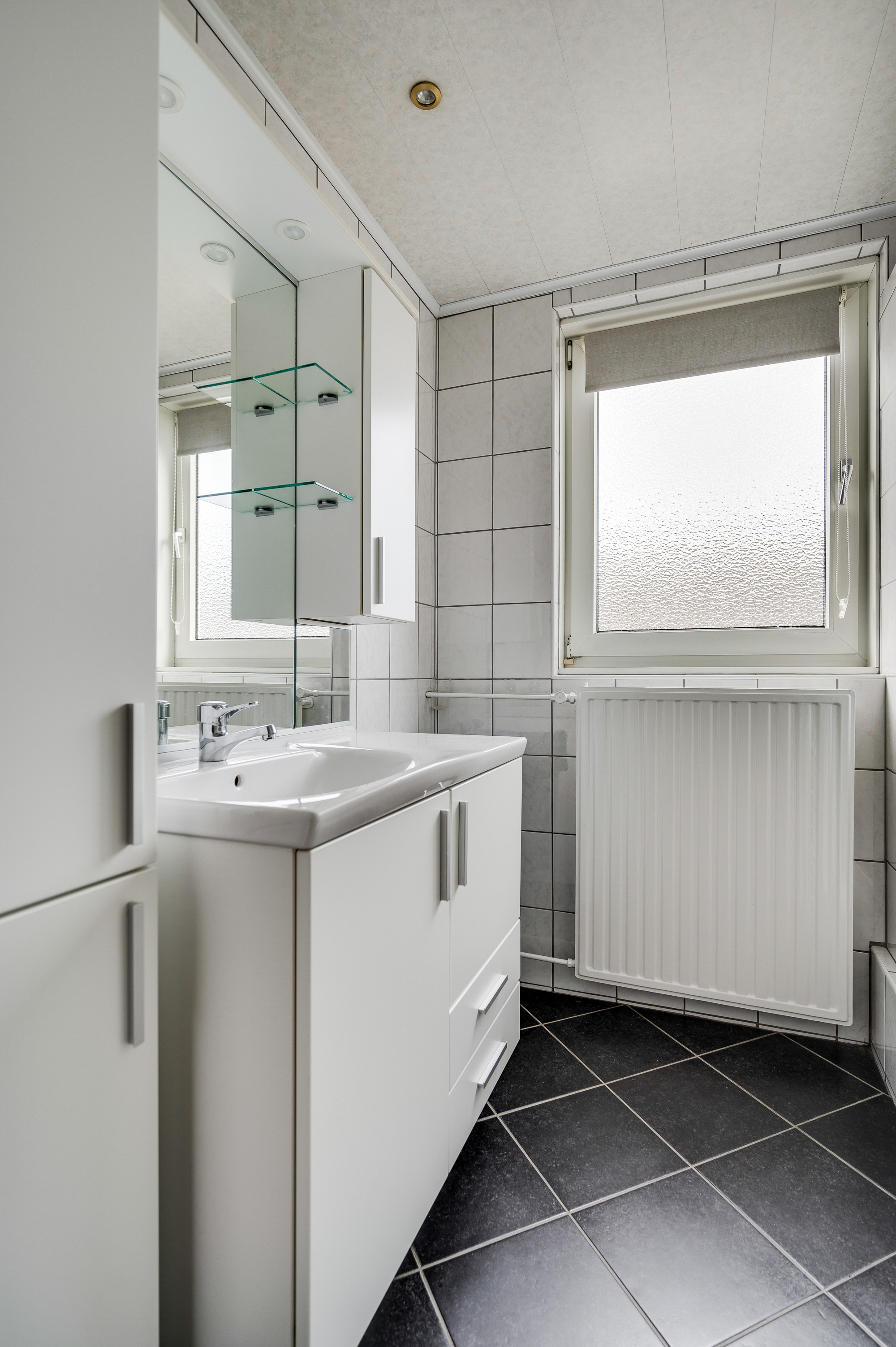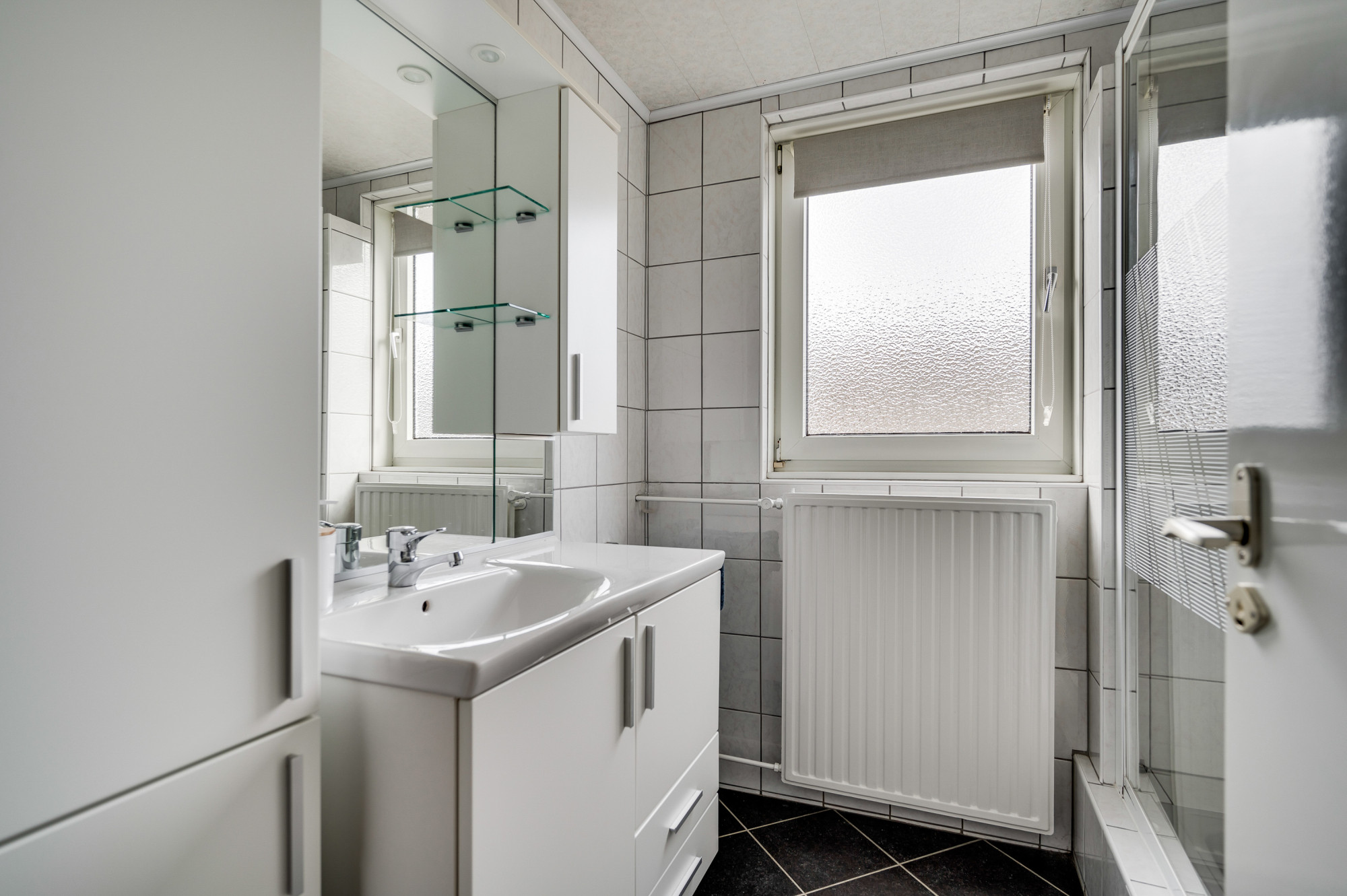 De overloop leidt naar drie slaapkamers, waarvan één is voorzien van een praktische muurkast en één beschikt over airconditioning. De badkamer is verzorgd en uitgerust met een douche en een wastafelmeubel.