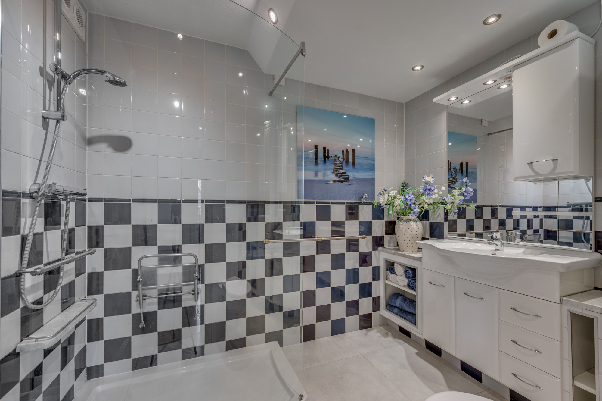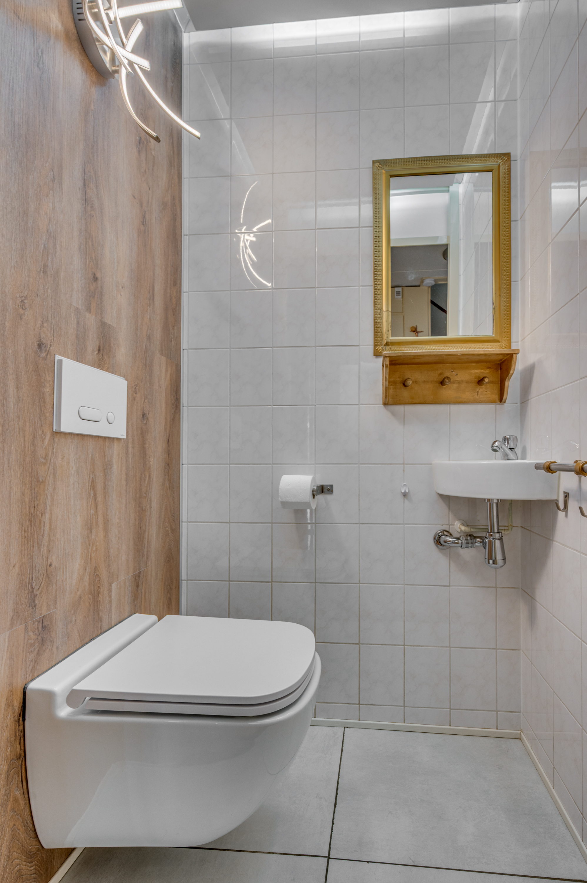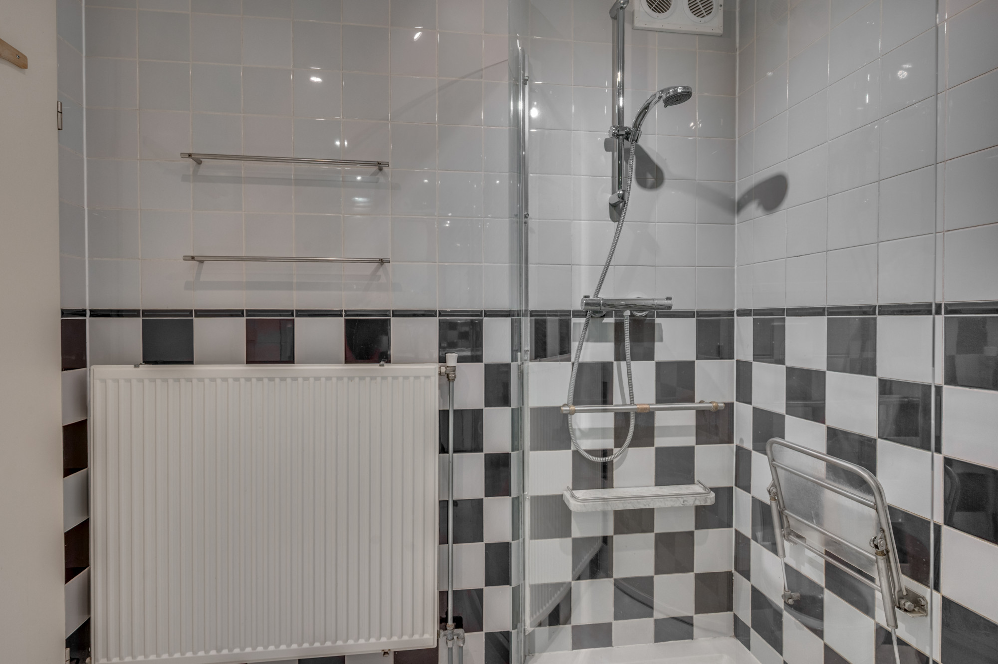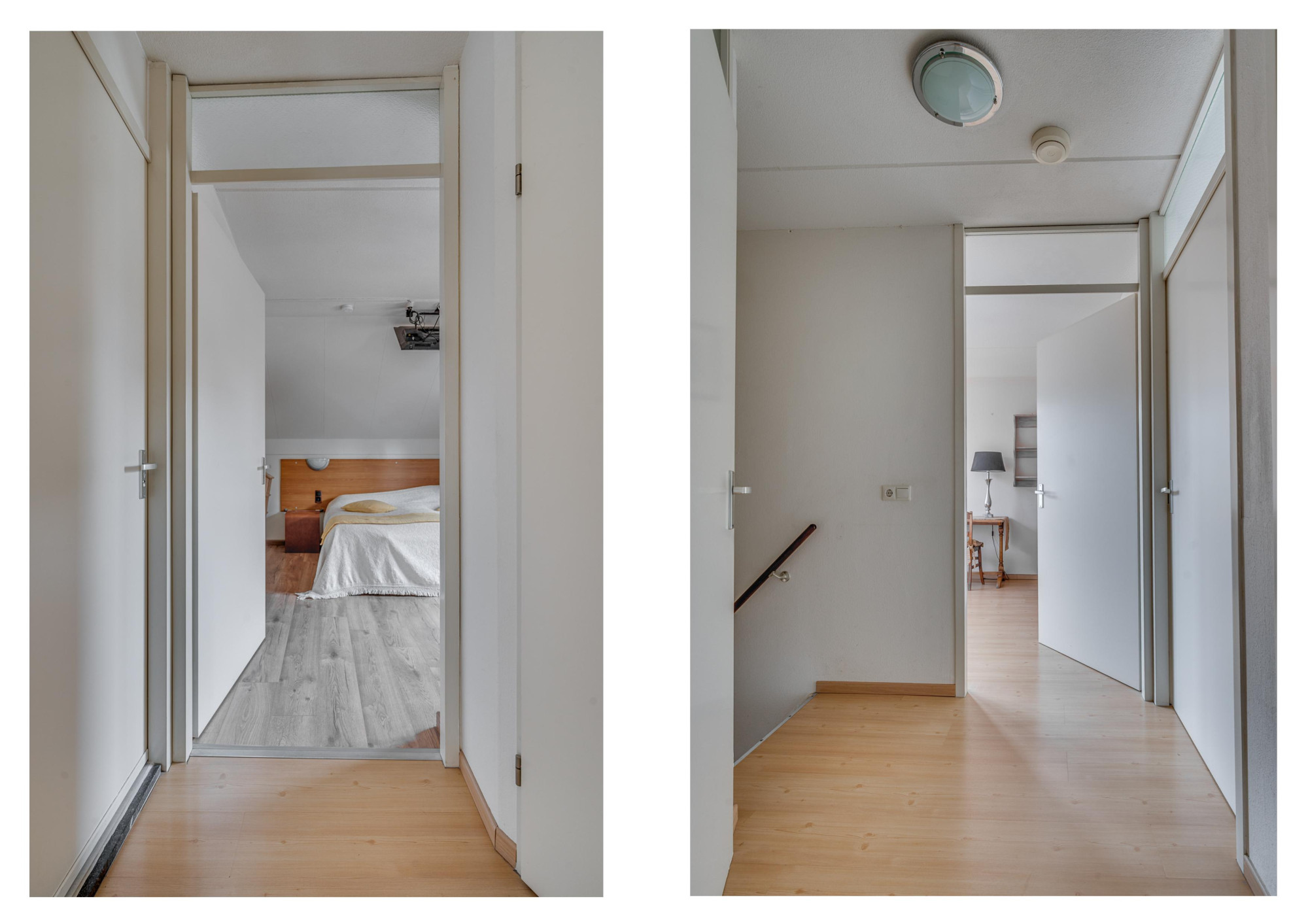 Overloop met toegang tot drie slaapkamers en de badkamer. De hoofdslaapkamer is uitgerust met een inloopkast en een airco. De badkamer is volledig betegeld en ingericht met een douche, wastafel met meubel en toilet. De slaapkamers (met uitzondering van de badkamer) zijn afgewerkt met een laminaatvloer.
