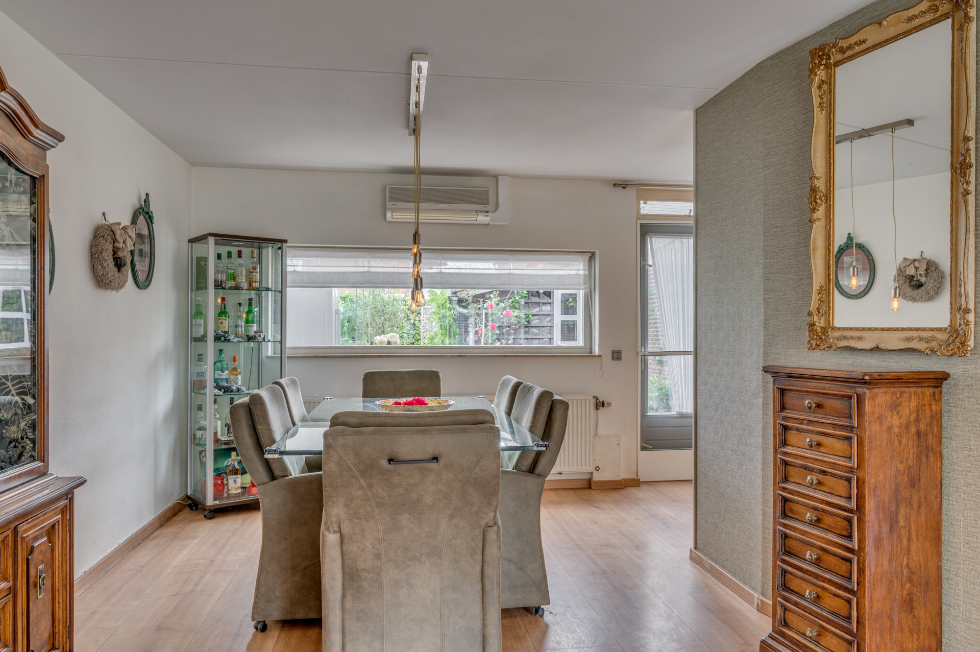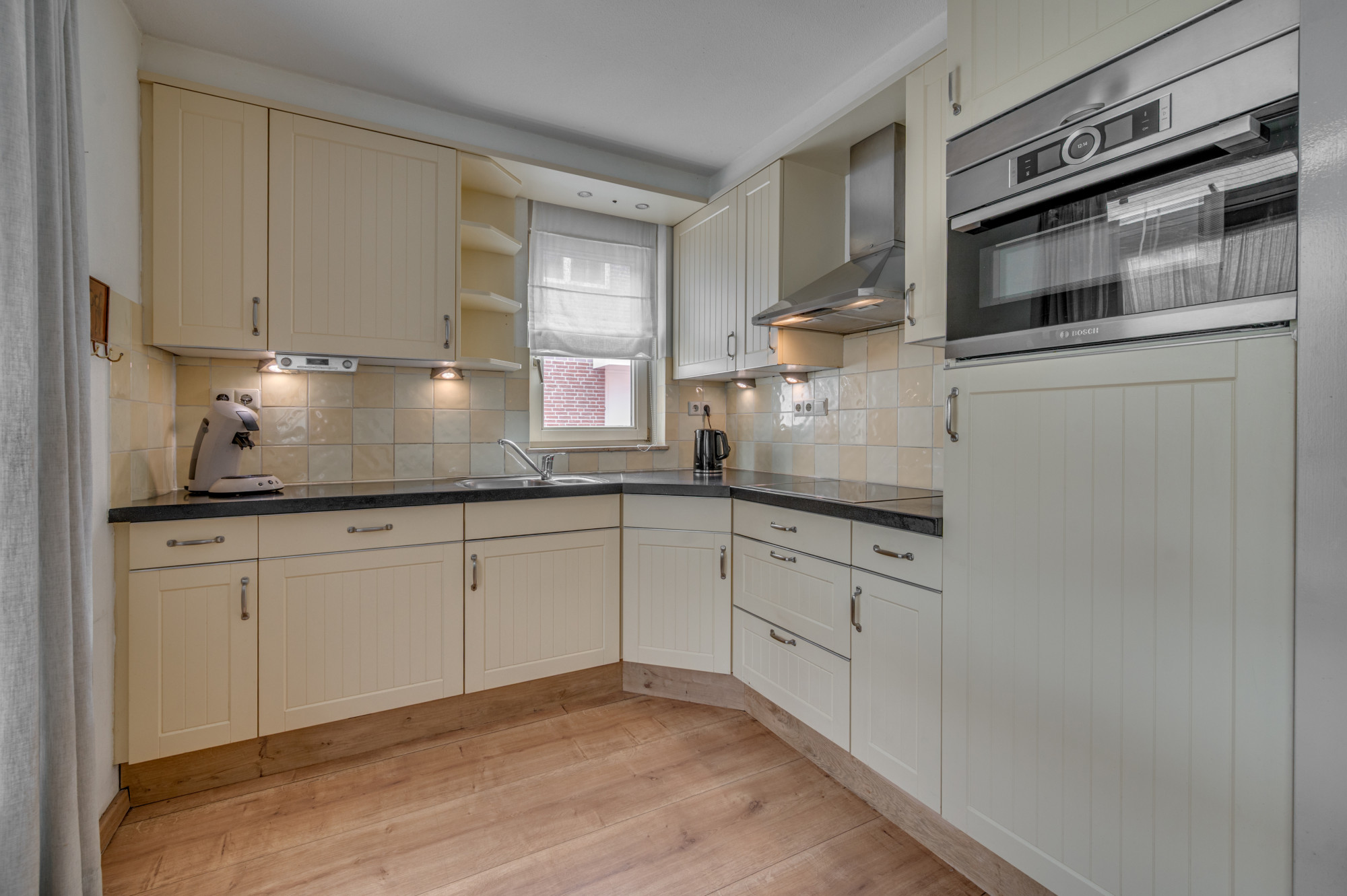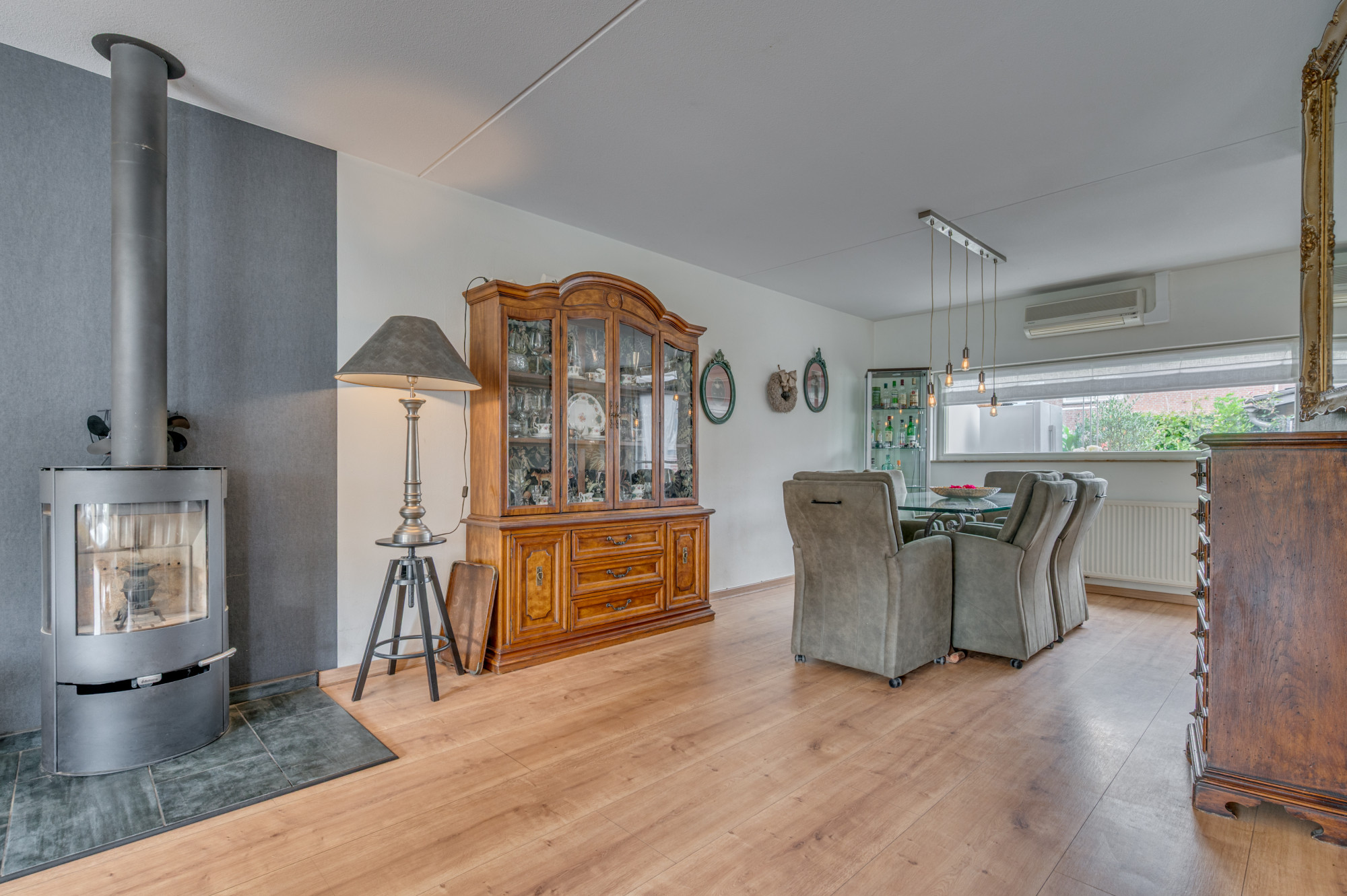 Entree in de hal met trapopgang naar de eerste verdieping, meterkast en een moderne toiletruimte met zwevend toilet en fonteintje. Vanuit de hal is er toegang tot de riante L-vormige woonkamer met erker, die zorgt voor extra veel lichtinval. De woonkamer is voorzien van een praktische trapkast, airco en een houtkachel (ter overname). Aansluitend bevindt zich de halfopen keuken met hoekopstelling en de navolgende inbouwapparatuur: kookplaat, afzuigkap, combi-oven en vaatwasser. Vanuit de keuken leidt een loopdeur naar de ruime serre, een verlengde van de woonkamer waar u dankzij de glazen schuifpanelen het hele jaar door comfortabel kunt verblijven.