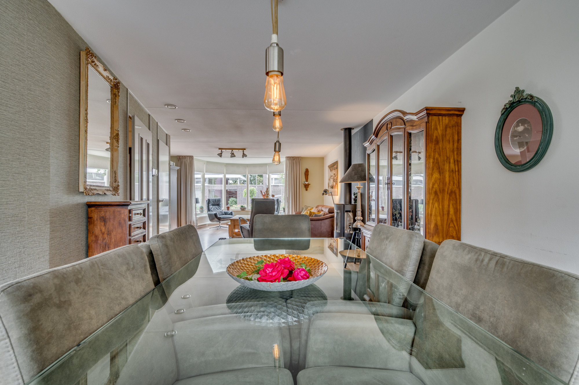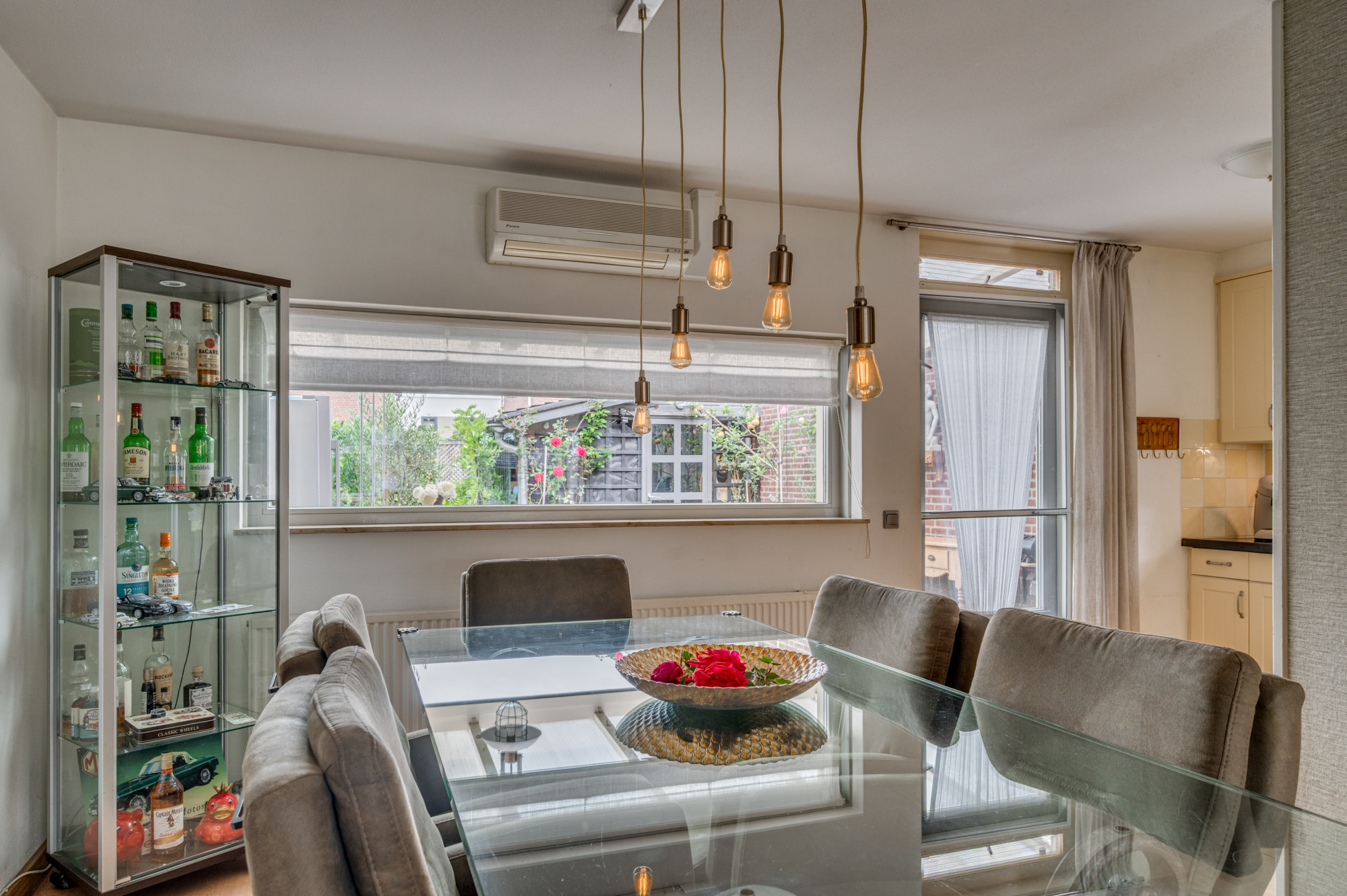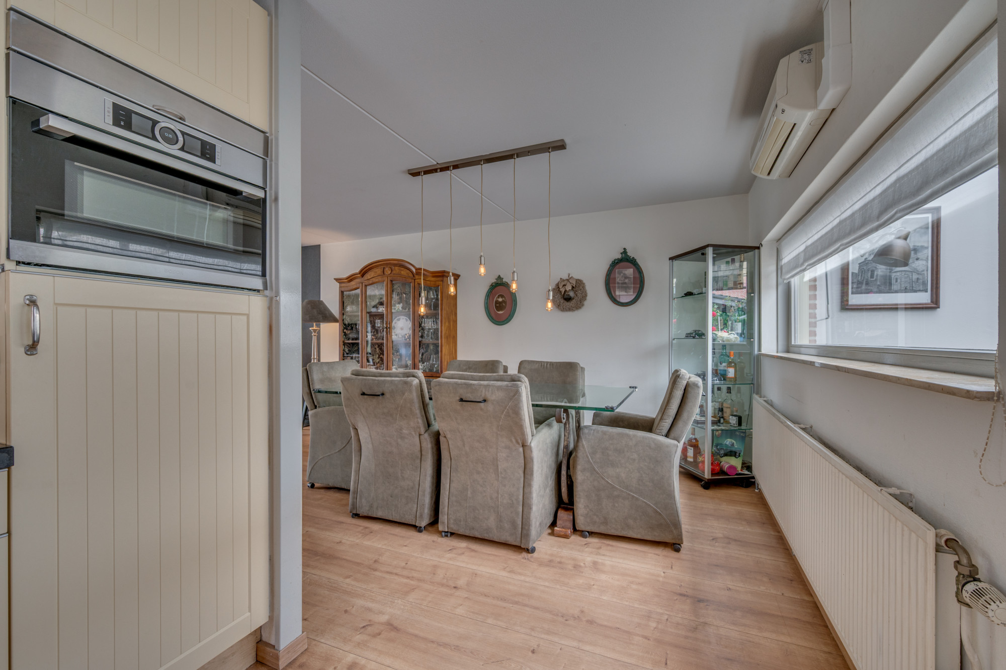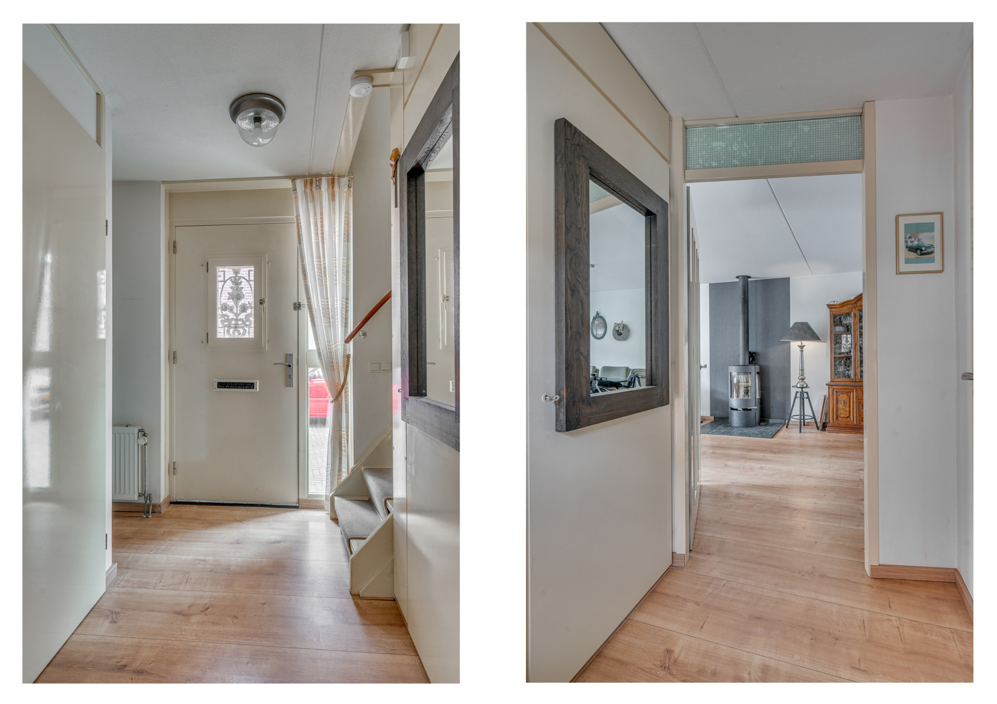 Entree in de hal met trapopgang naar de eerste verdieping, meterkast en een moderne toiletruimte met zwevend toilet en fonteintje. Vanuit de hal is er toegang tot de riante L-vormige woonkamer met erker, die zorgt voor extra veel lichtinval. De woonkamer is voorzien van een praktische trapkast, airco en een houtkachel (ter overname). Aansluitend bevindt zich de halfopen keuken met hoekopstelling en de navolgende inbouwapparatuur: kookplaat, afzuigkap, combi-oven en vaatwasser. Vanuit de keuken leidt een loopdeur naar de ruime serre, een verlengde van de woonkamer waar u dankzij de glazen schuifpanelen het hele jaar door comfortabel kunt verblijven.