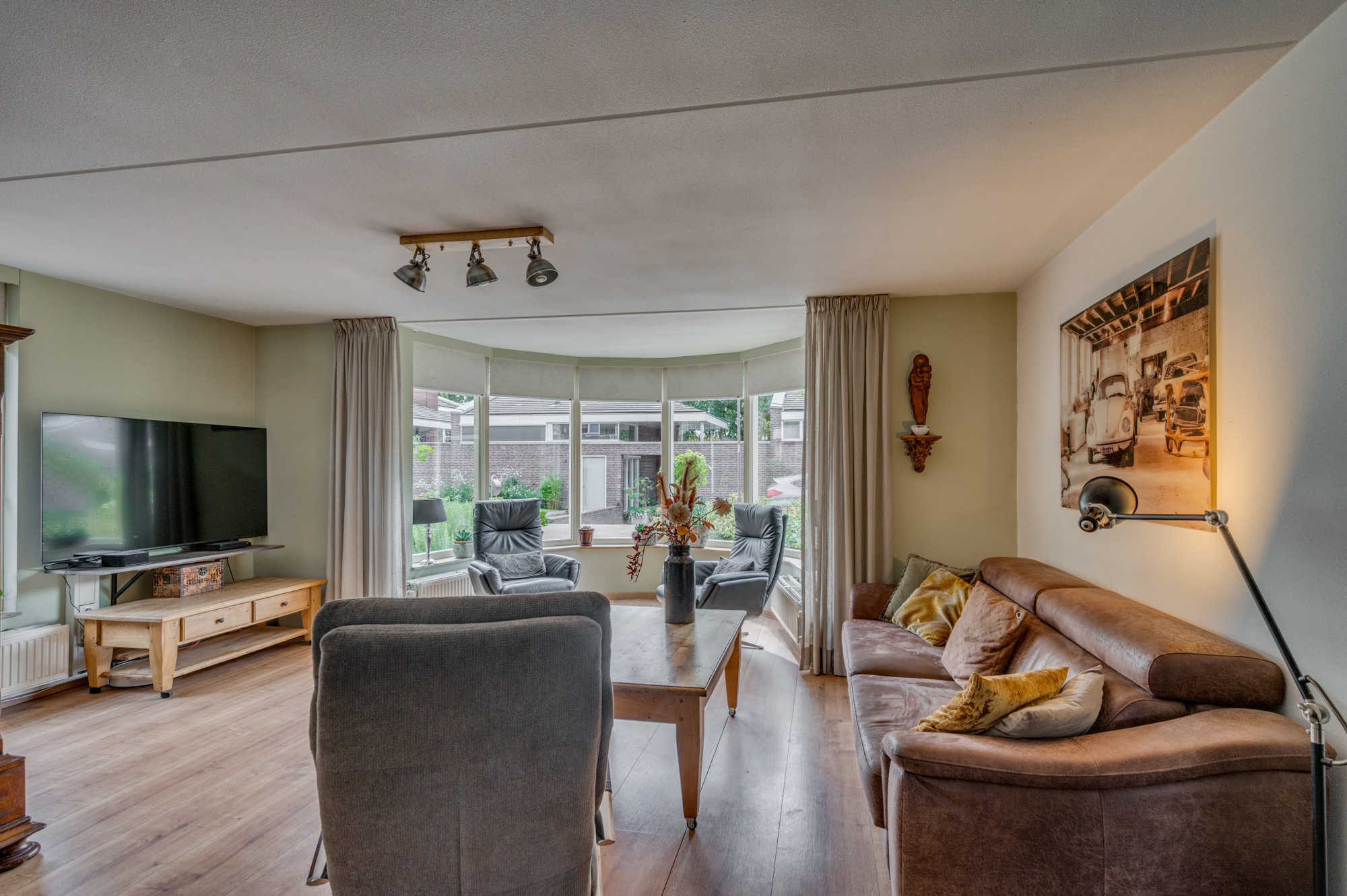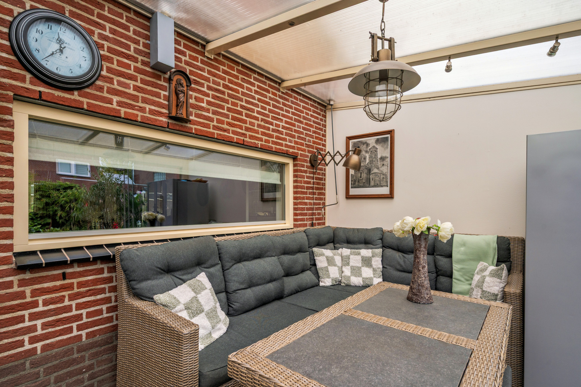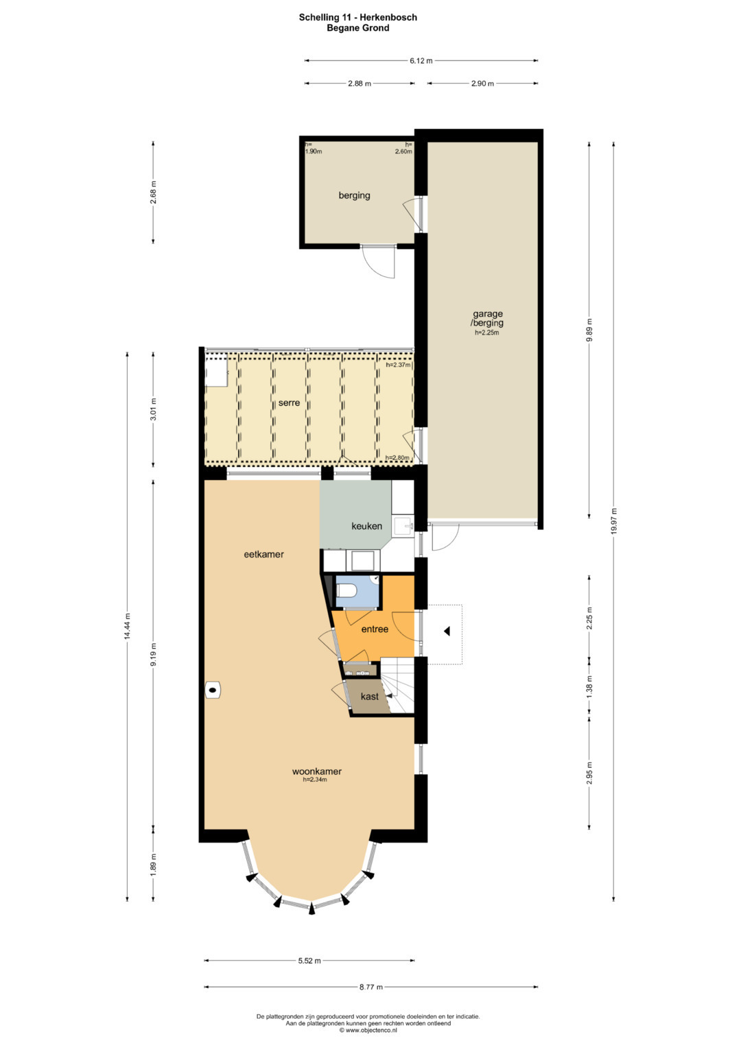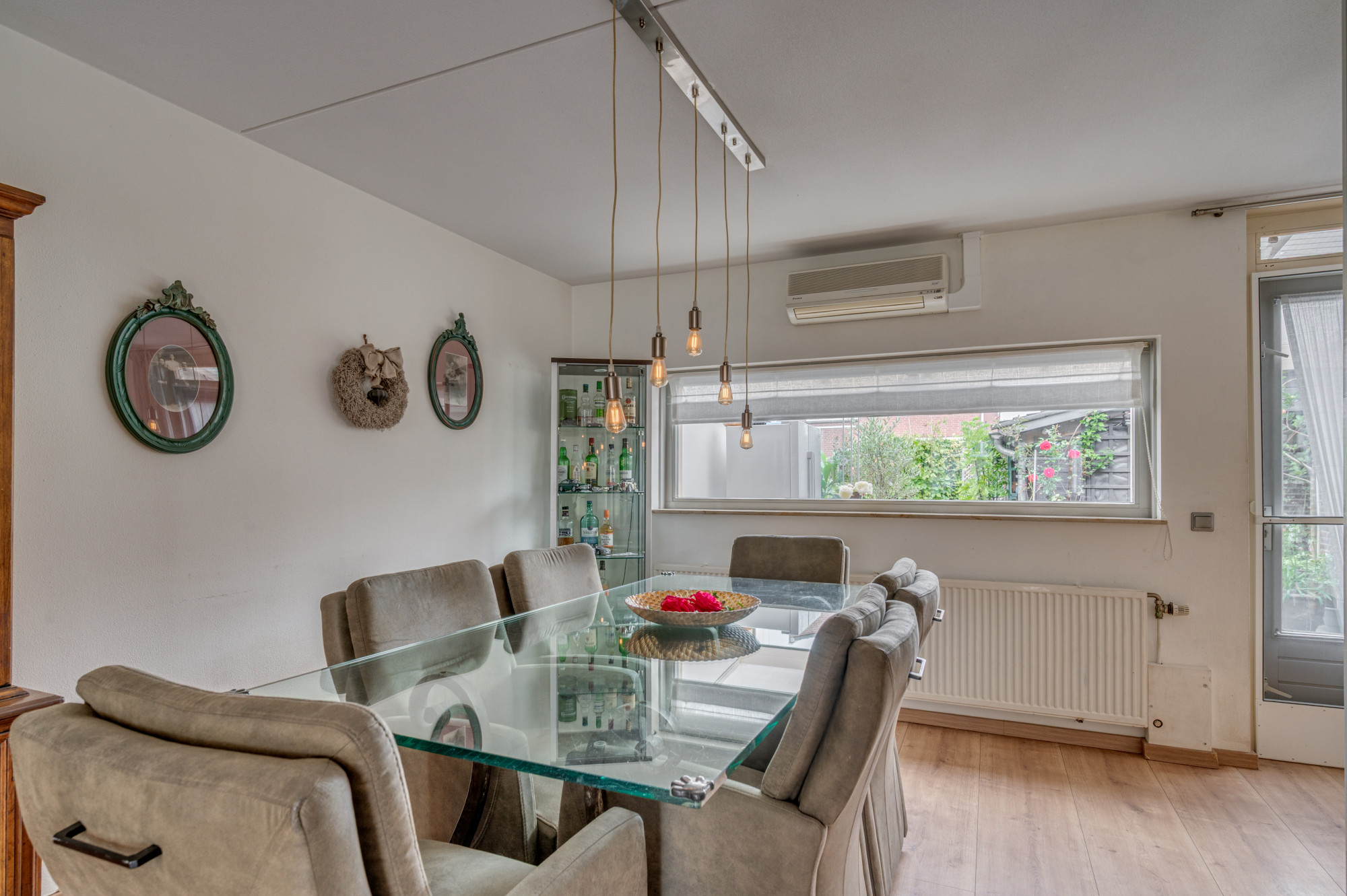 De serre biedt toegang tot de extra diepe garage, voorzien van openslaande garagedeuren, elektra, water en verwarming. Vanuit de garage is nog een berging bereikbaar met een loopdeur naar de achtertuin. De begane grond is grotendeels afgewerkt met een laminaatvloer voorzien van comfortabele vloerverwarming.