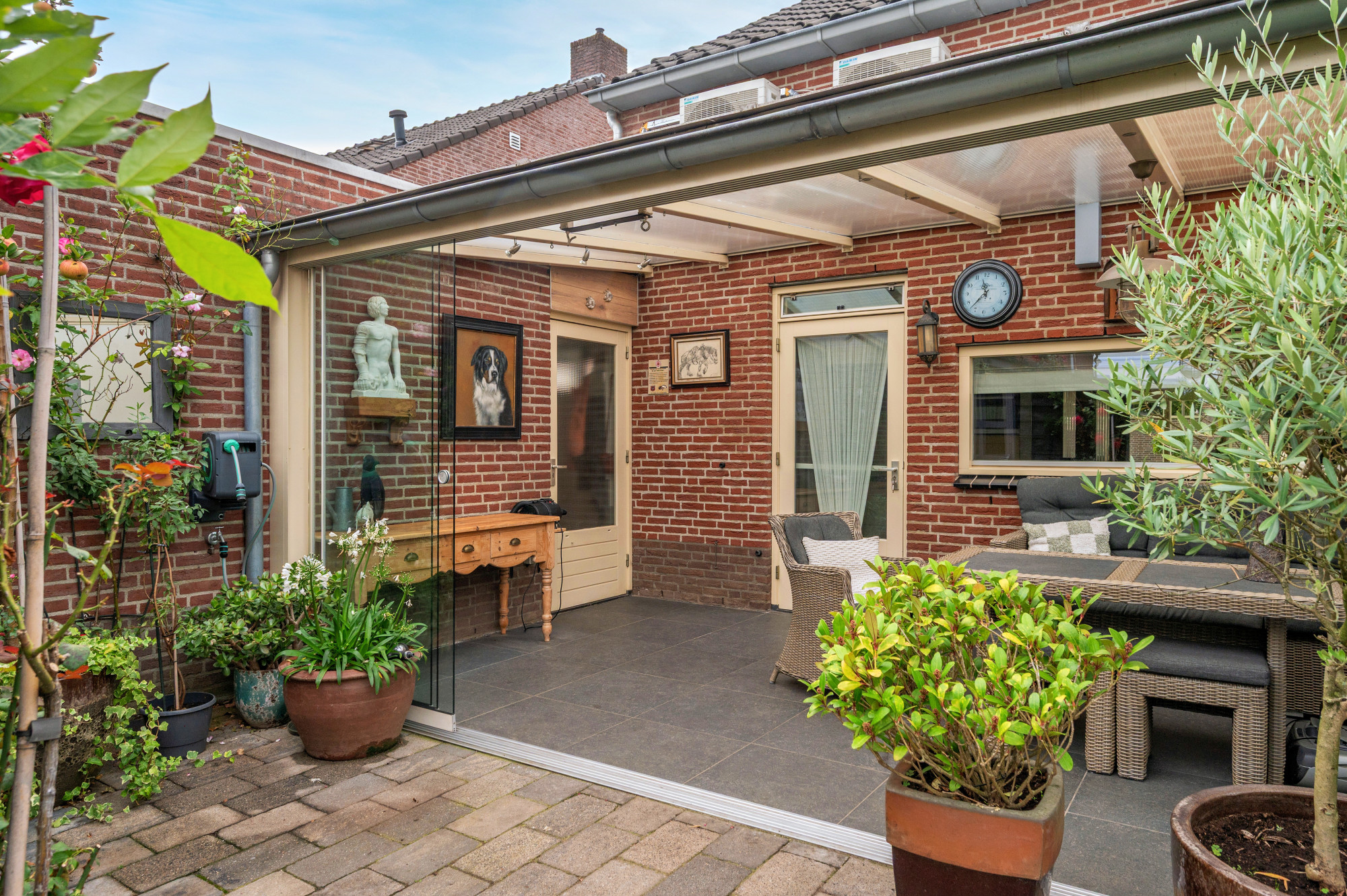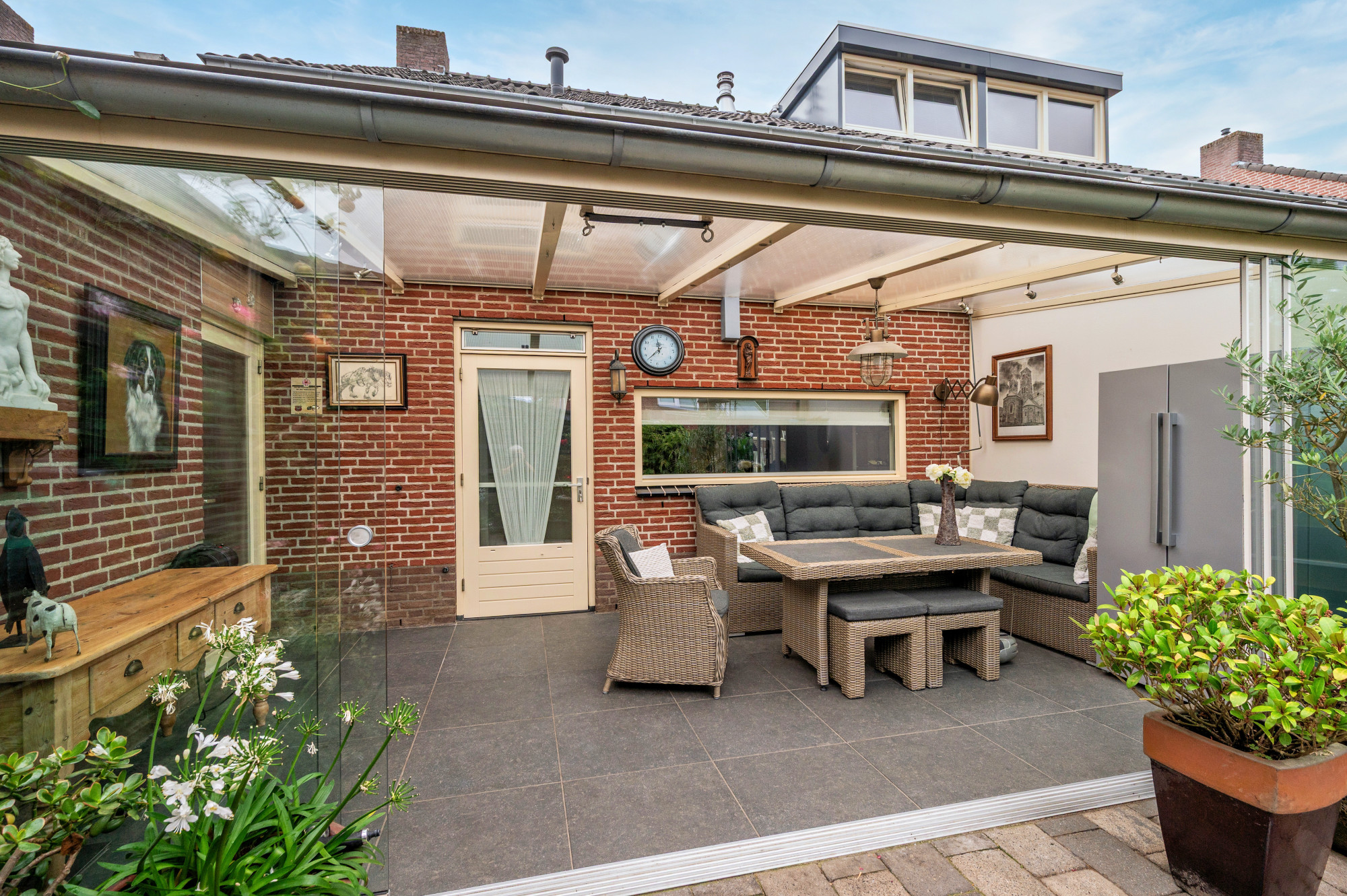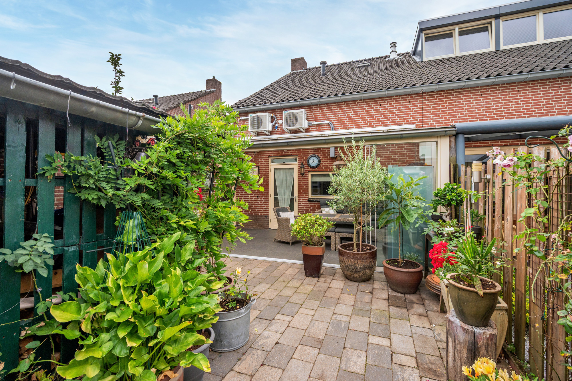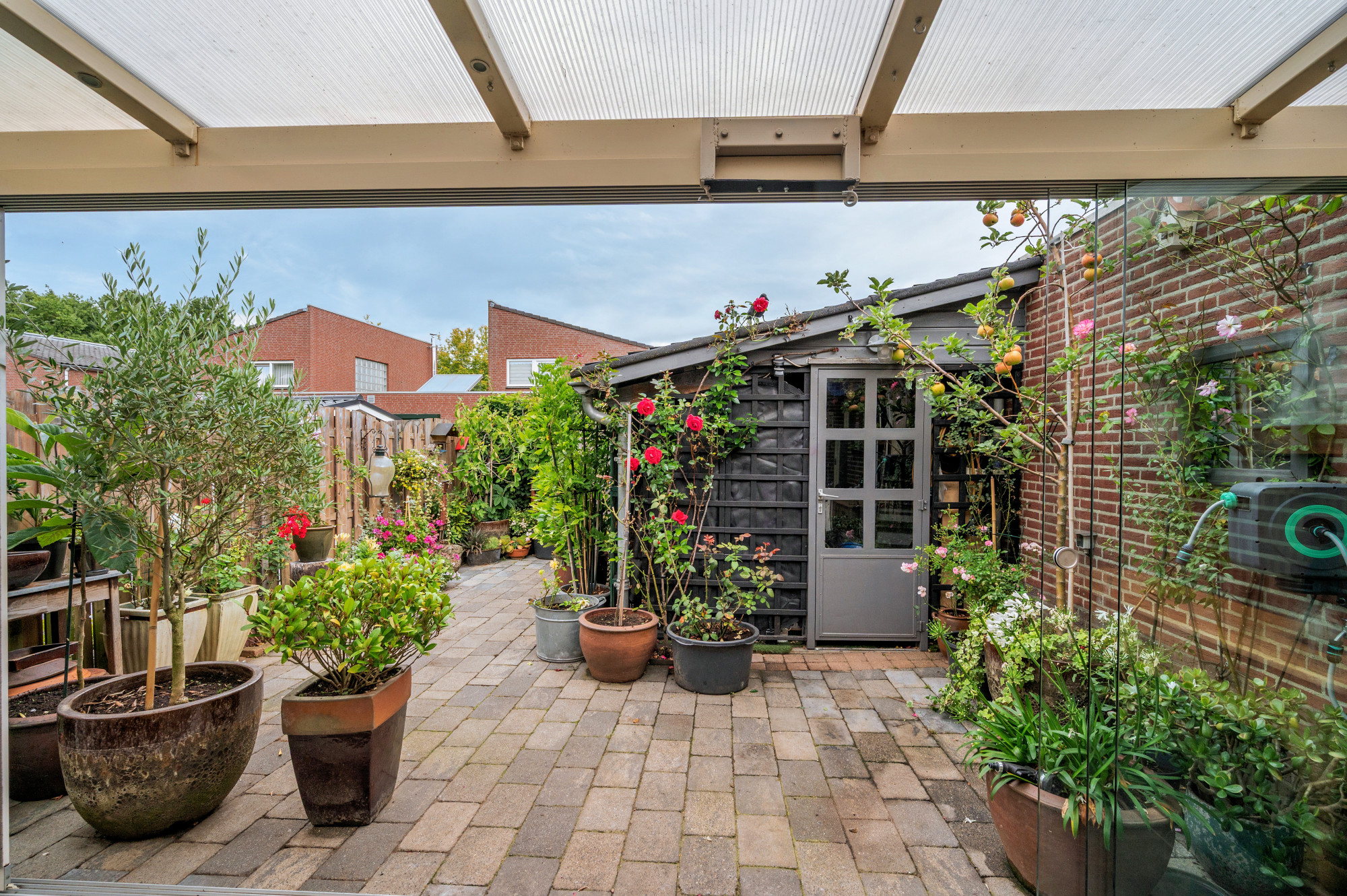 De woning beschikt over een verzorgde voortuin met een diepe oprit naar de garage. Deze garage is extra diep doordat deze na de bouw verlengd is. Een ideale werk/hobbyruimte. De achtertuin is onderhoudsvriendelijk aangelegd met bestrating en biedt toegang tot de berging.