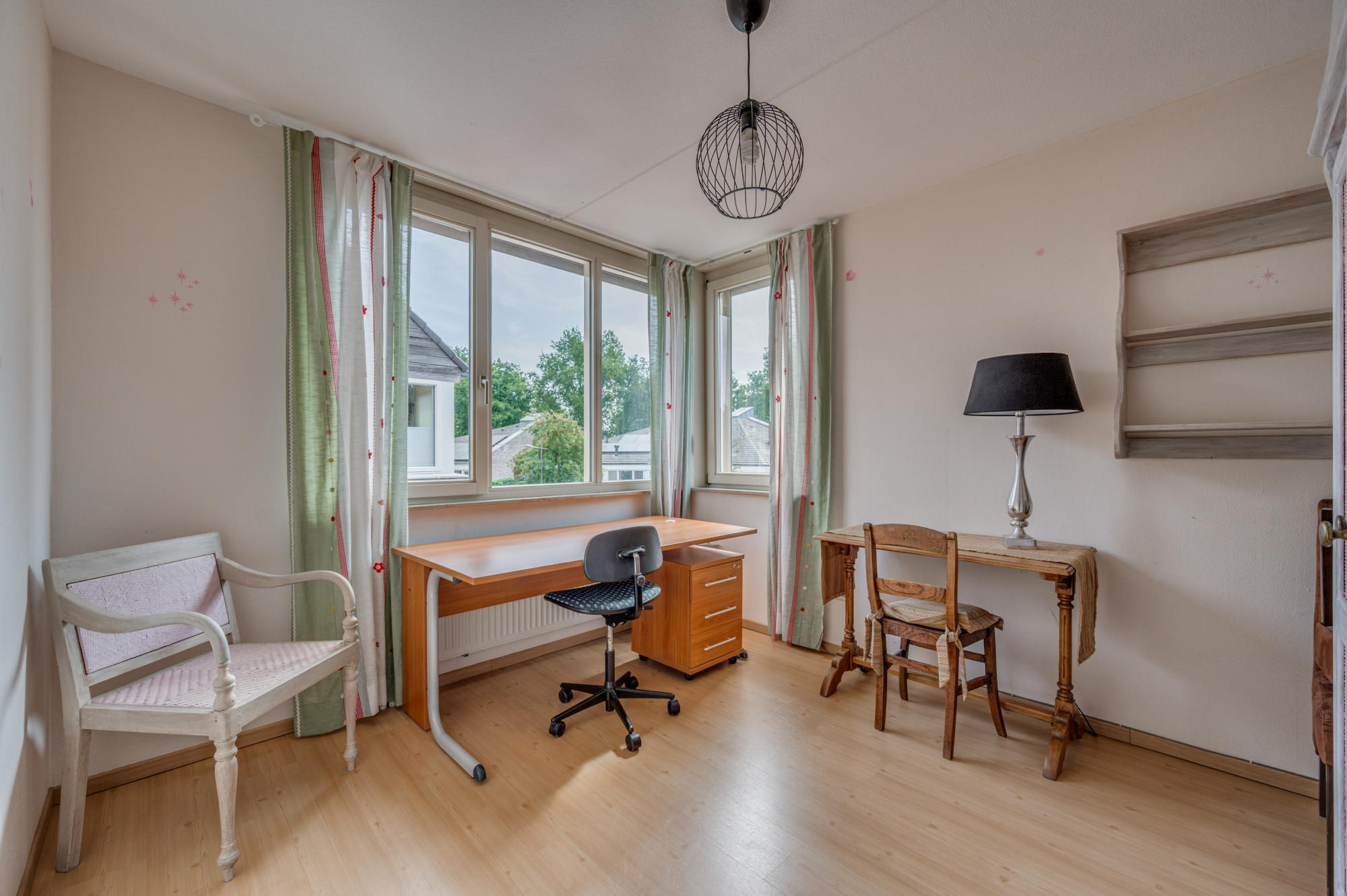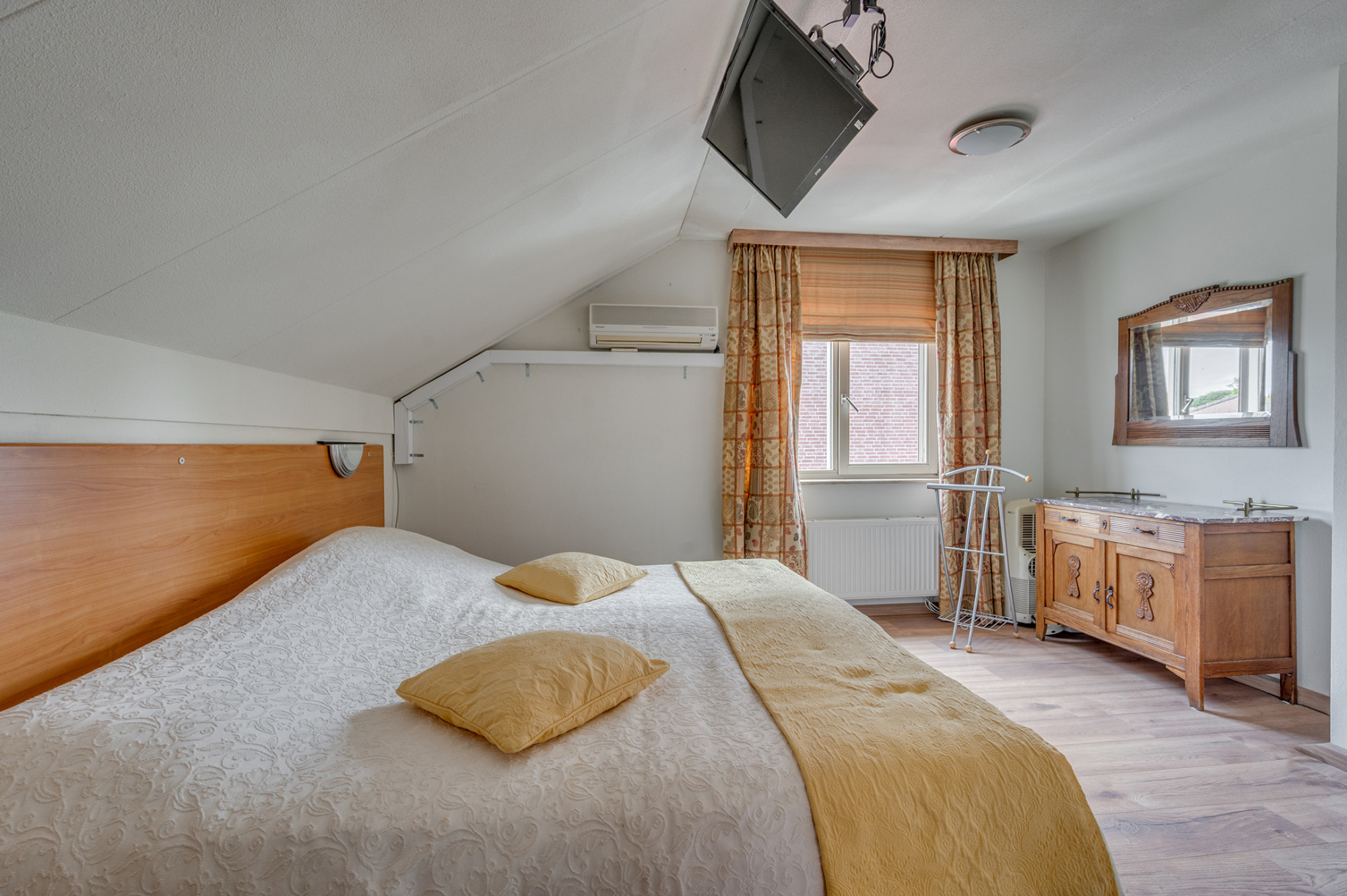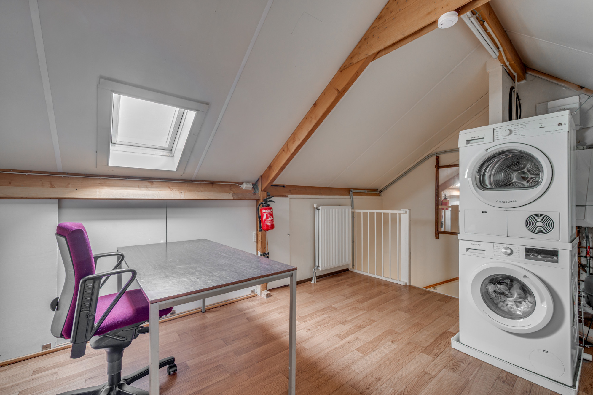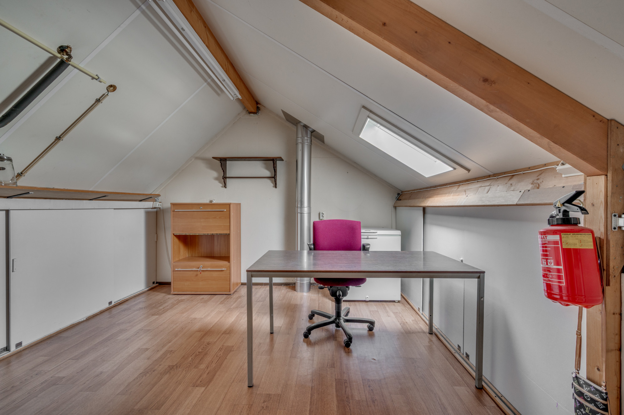 Via een vaste trap bereikt u de zolderkamer met dakraam, witgoedaansluitingen en de opstelling van de cv-ketel (Remeha Calenta HR, huur, ca. 2023). Hier is eenvoudig een extra slaapkamer of werkkamer te realiseren.