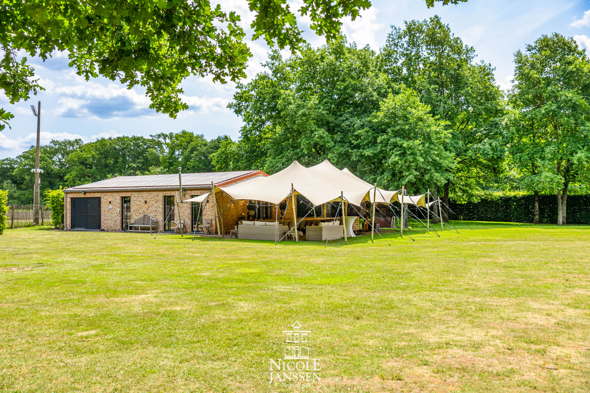 - Automatisch bedienbare zonnetent met ledverlichting aan het bijgebouw
