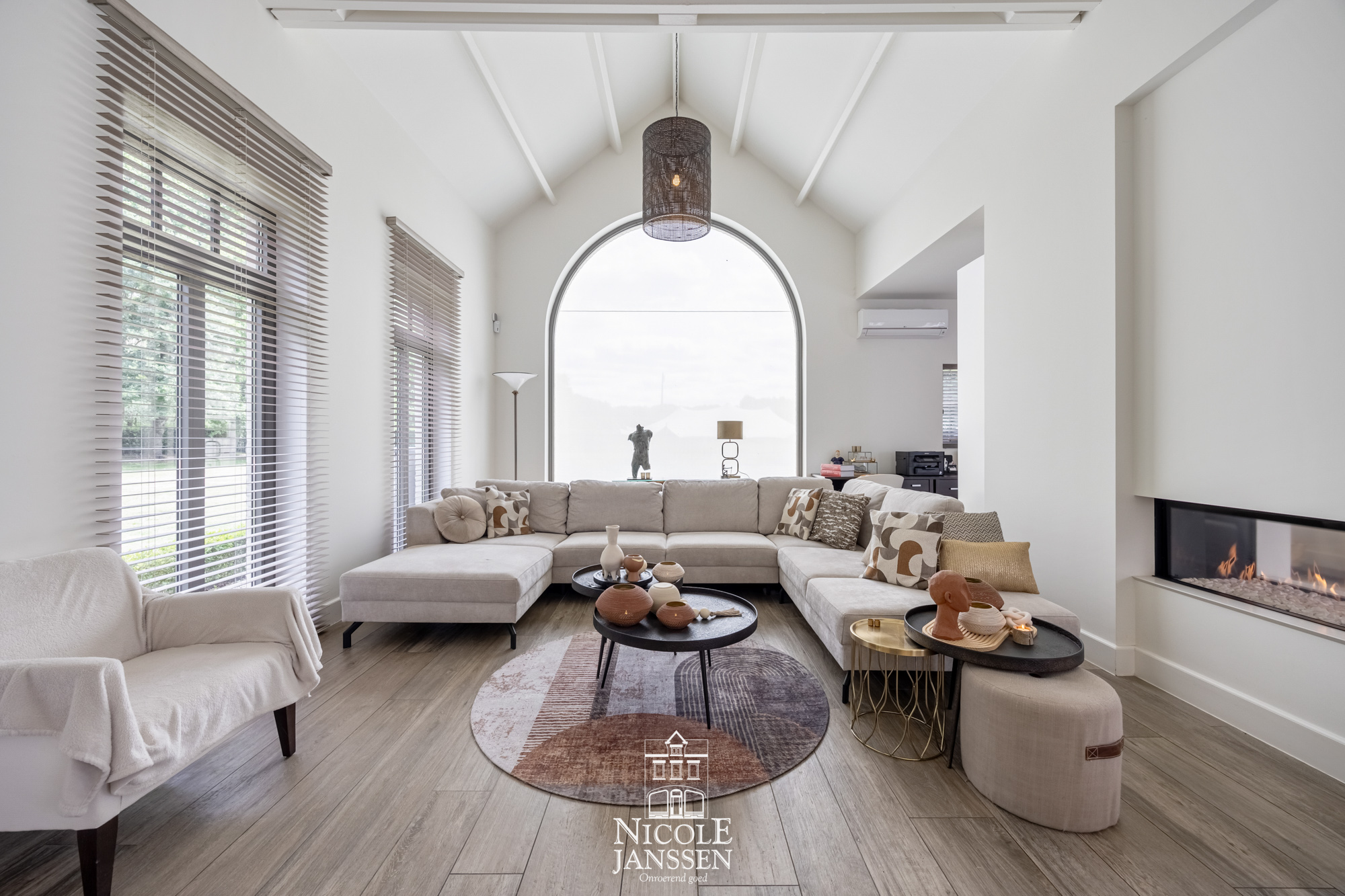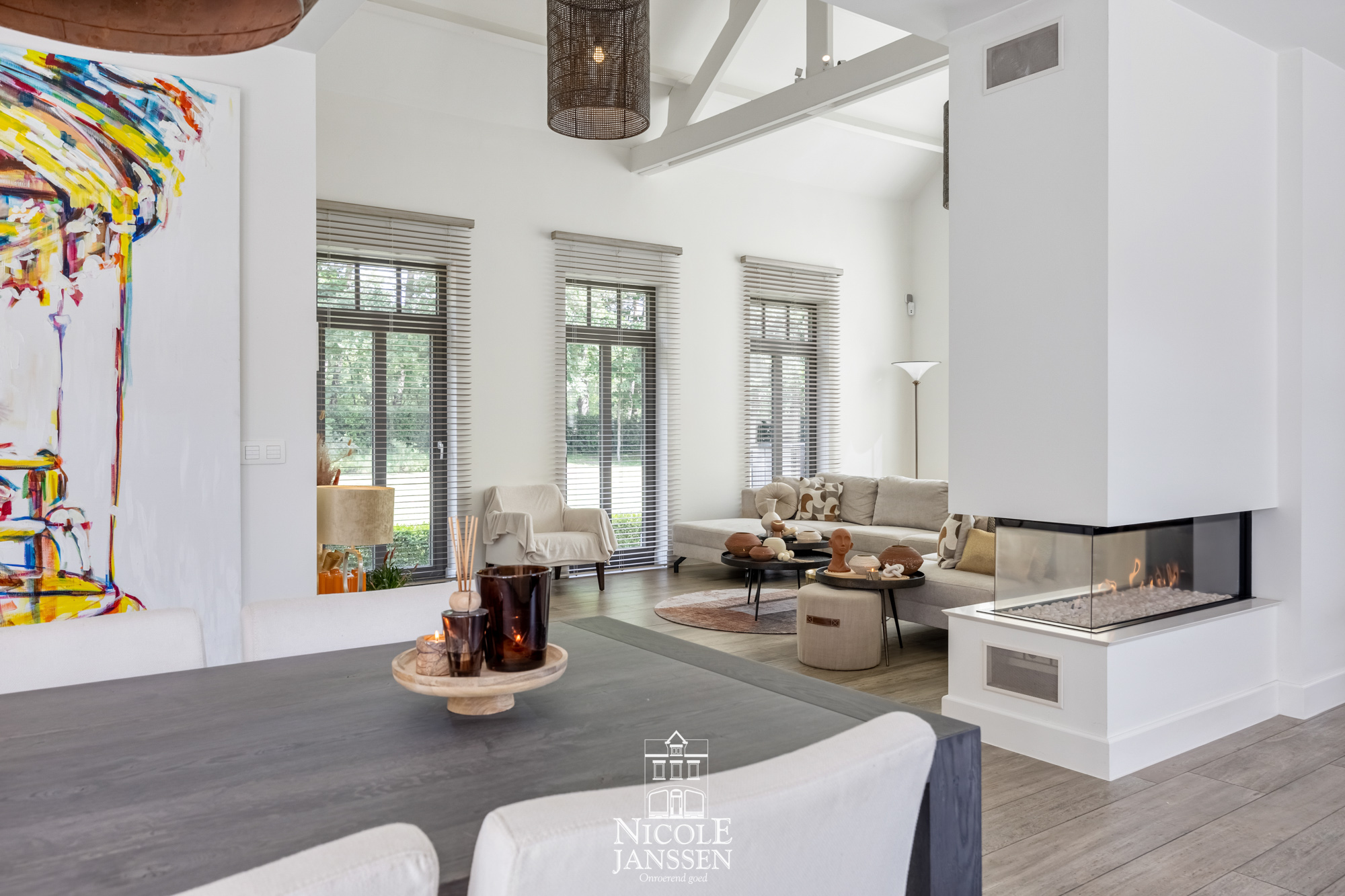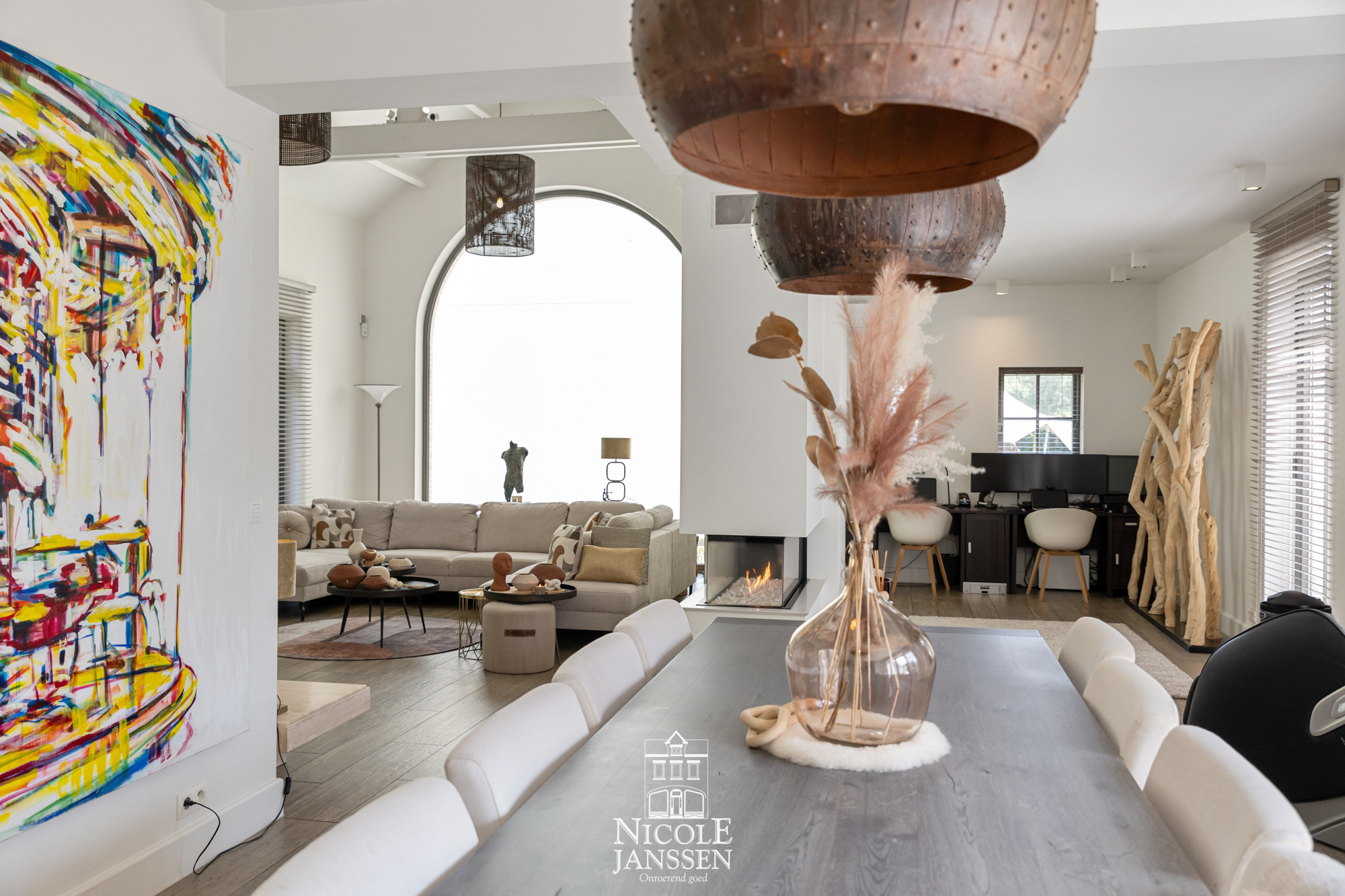 - Leefruimte voorzien van een massieve plankenvloer, met een sfeervolle zithoek rondom een gashaard en een praktische bureauruimte (2023: inrichting bureauruimte met smeedijzeren ramen en deur (met geluidswerende isolatiewand))