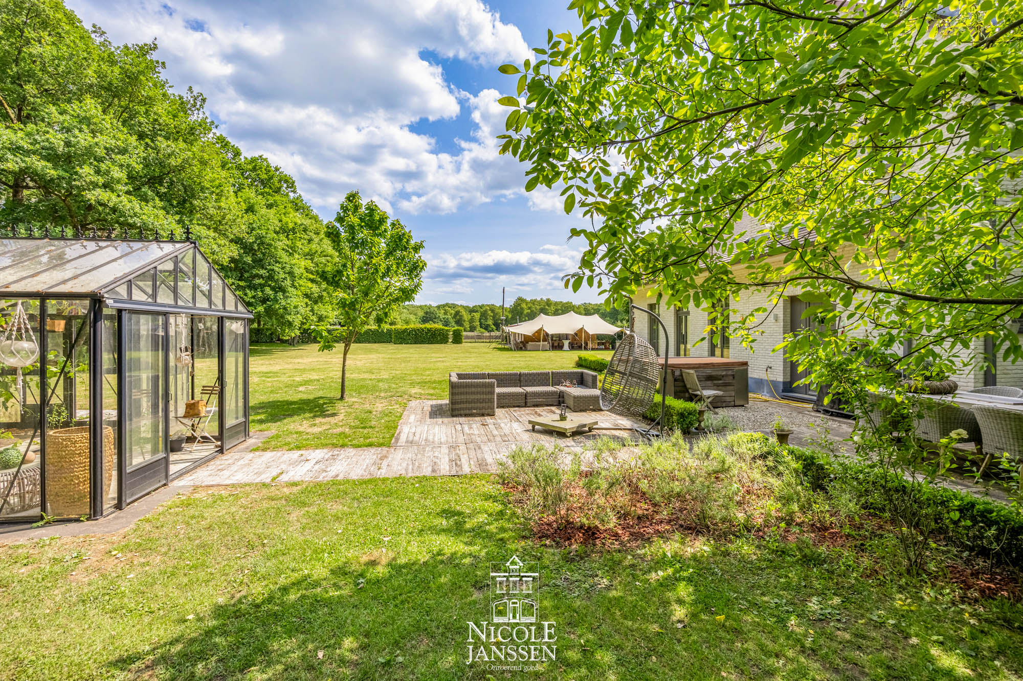 - Overdekt terras, afsluitbaar (met glazen schuifwanden), waar u het hele jaar door kunt genieten van de tuin en het zwembad